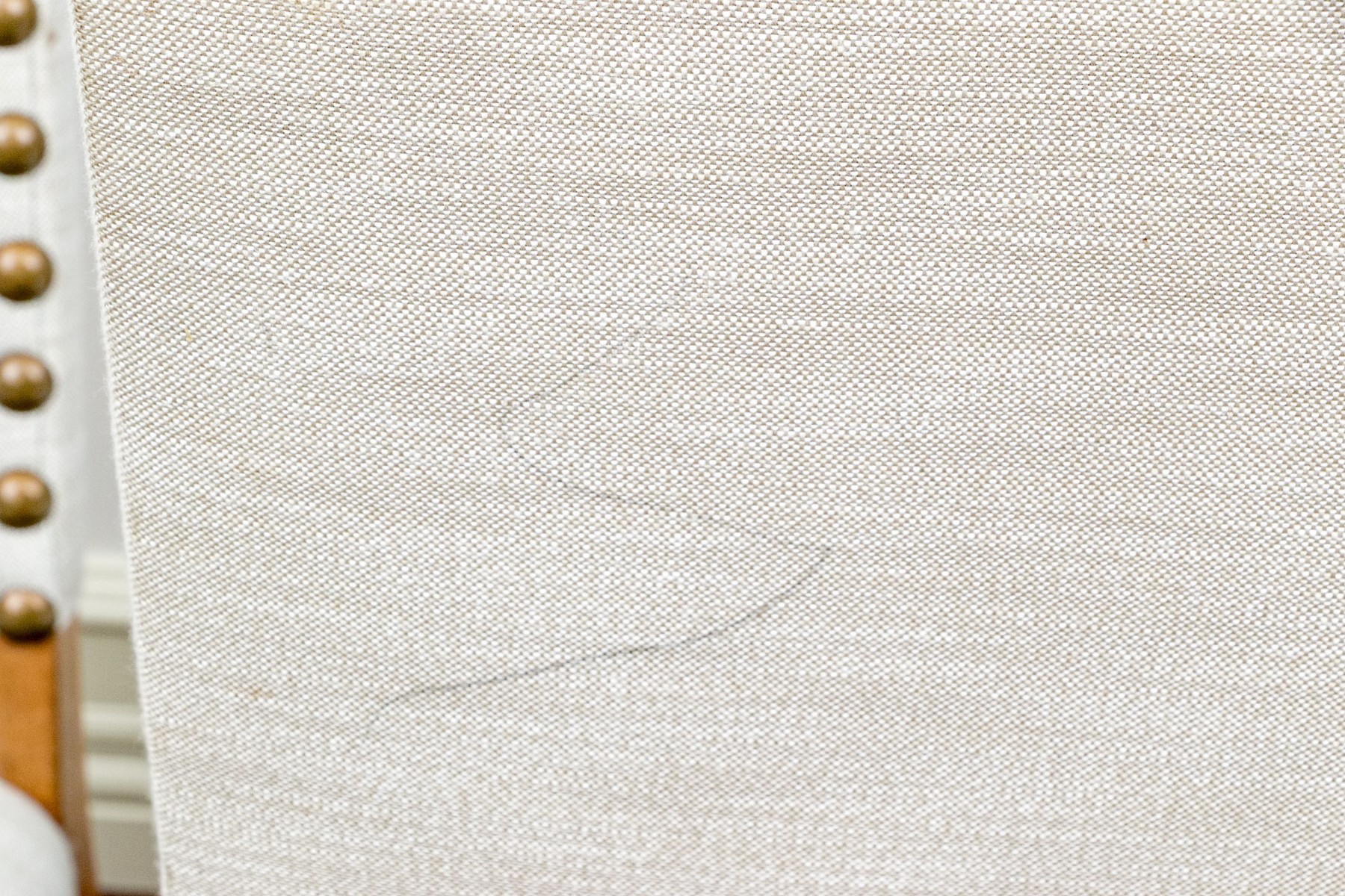 Some chairs with marks to the back slide of the upholstery, one with ink marks from a pen to the upholstered seat back verso as well as another with with further blemishes to the reverse upholstered seat back as well. Despite wear, which may be able to be spot cleaned or are great frames at the minimum do in face present well with some age and use. Overall a handsome set.