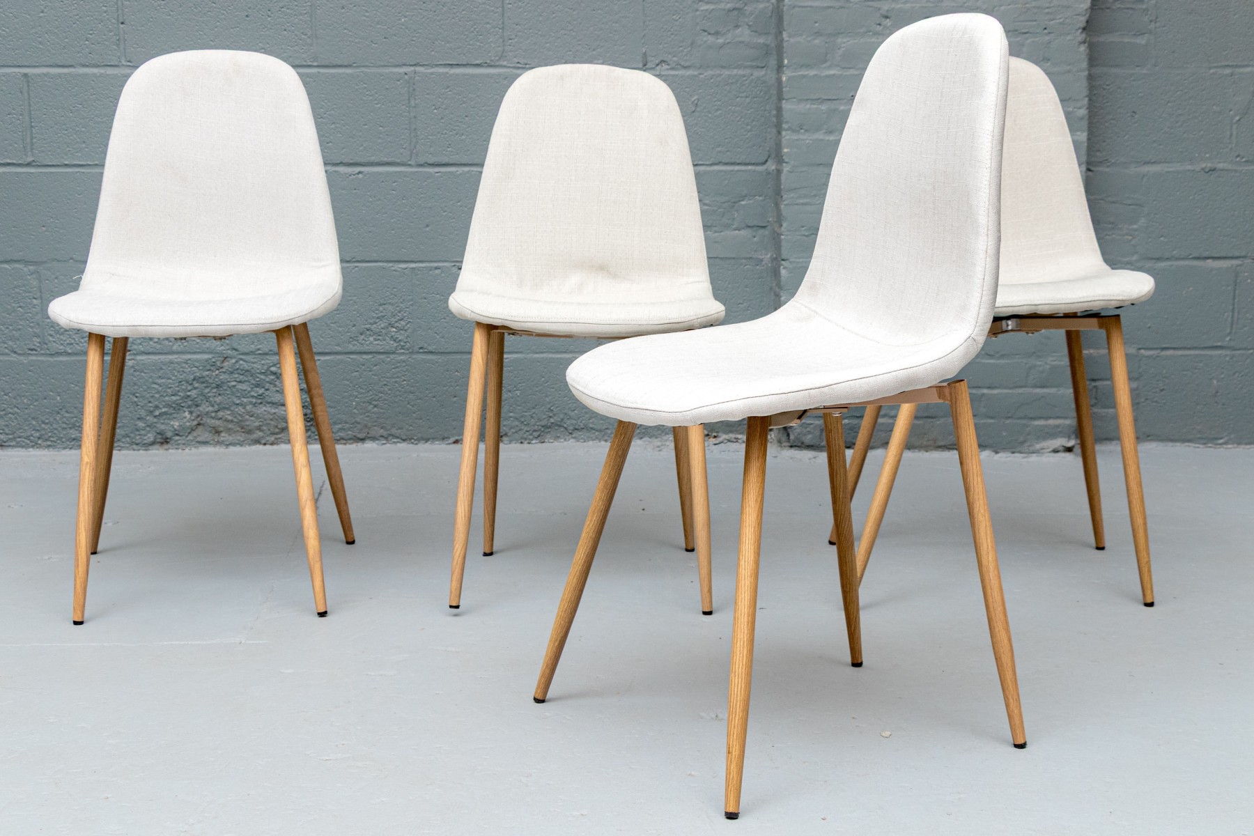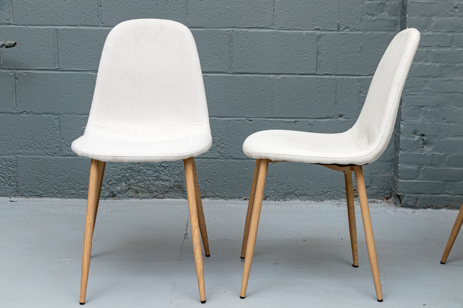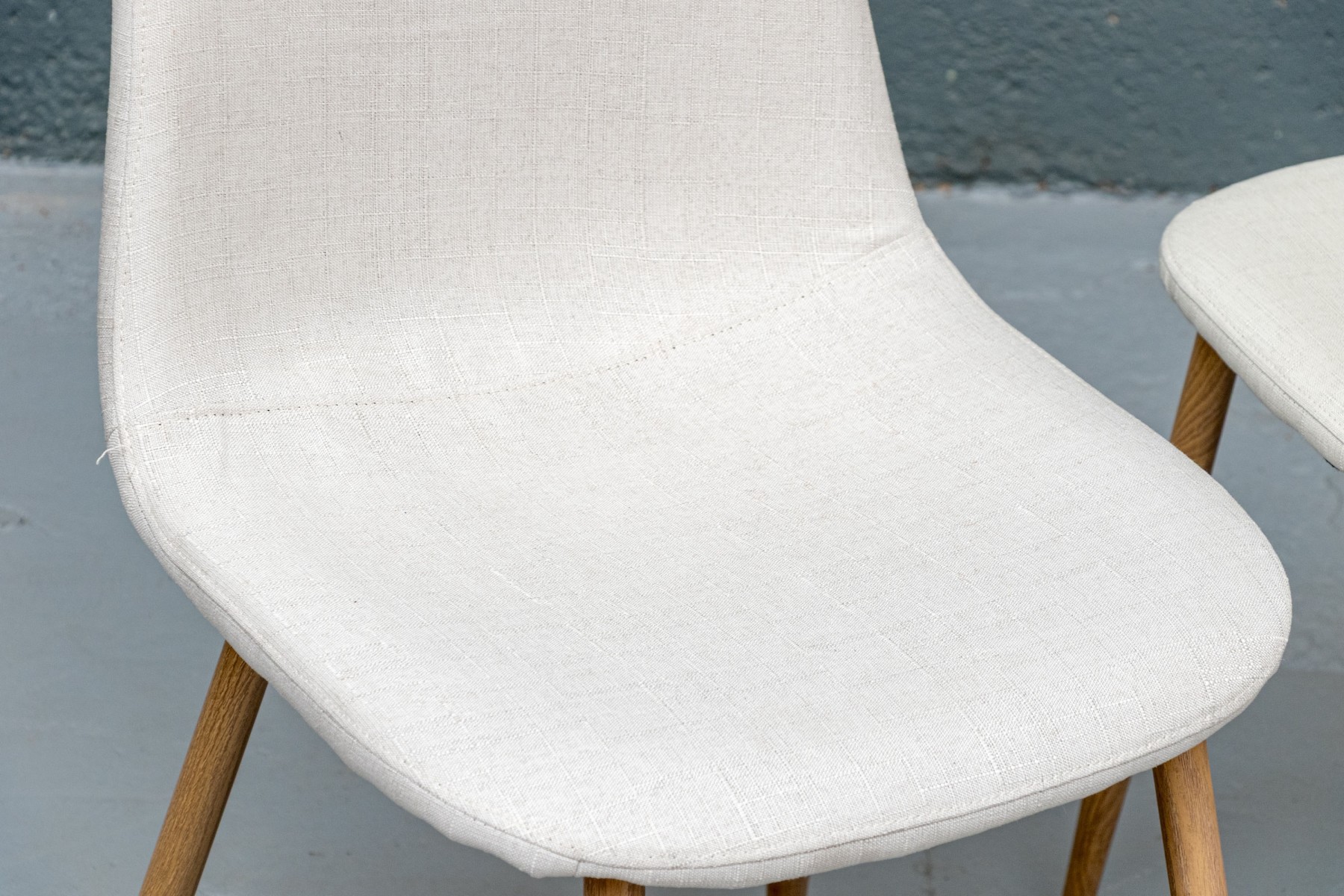 Each on four cylindrical splayed legs with upholstered seat and seat backs. Each are upholstered in a neutral hued upholstery.
