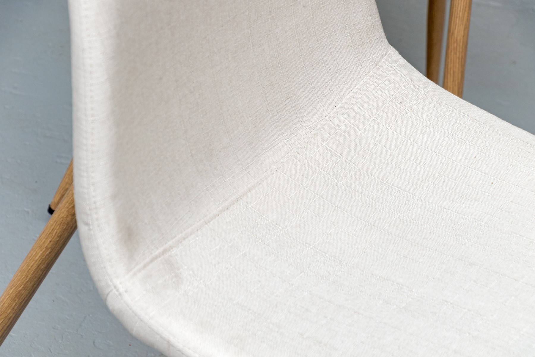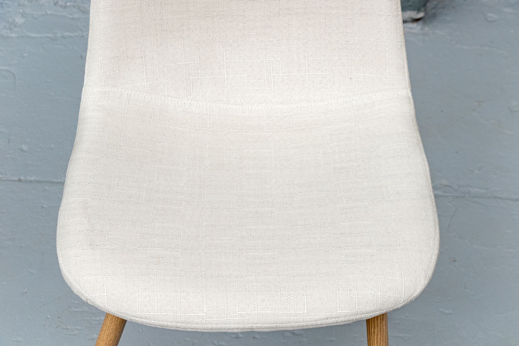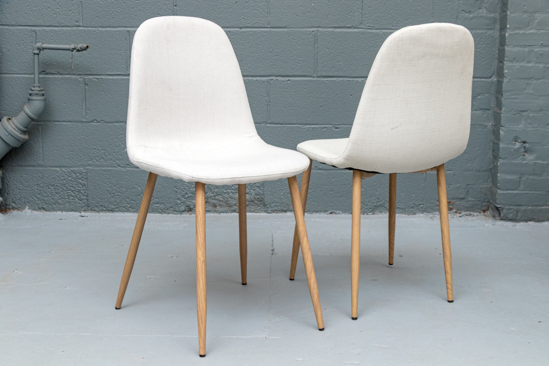 Each on four cylindrical splayed legs with upholstered seat and seat backs. Each are upholstered in a neutral hued upholstery.
