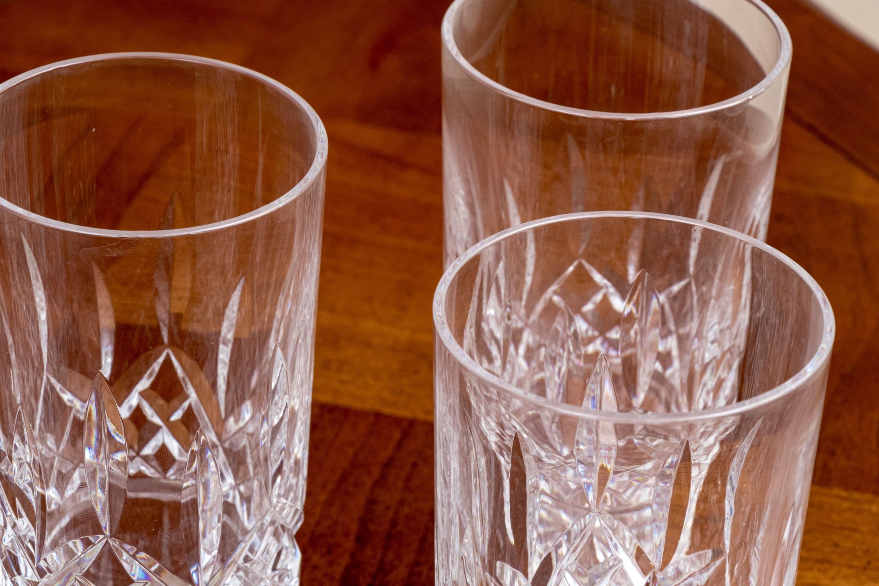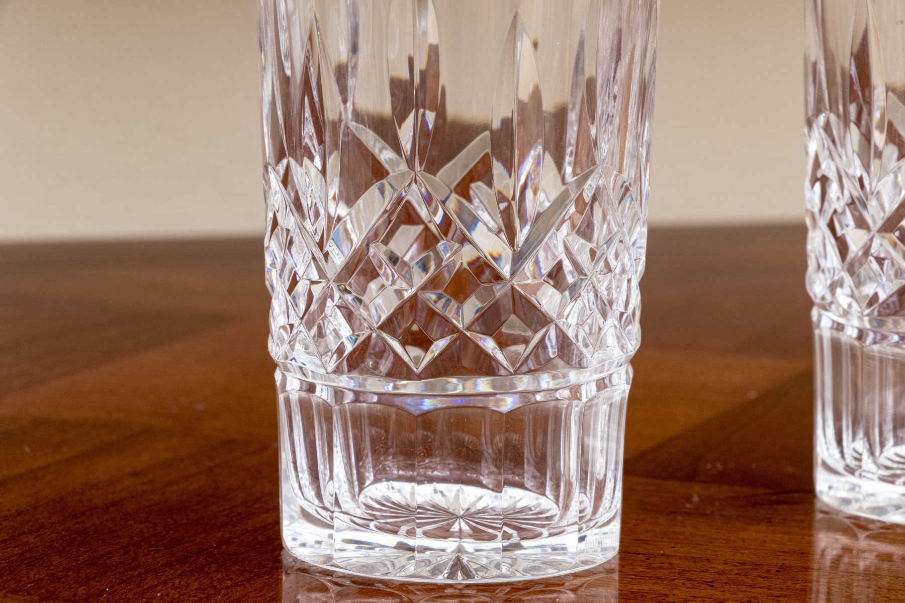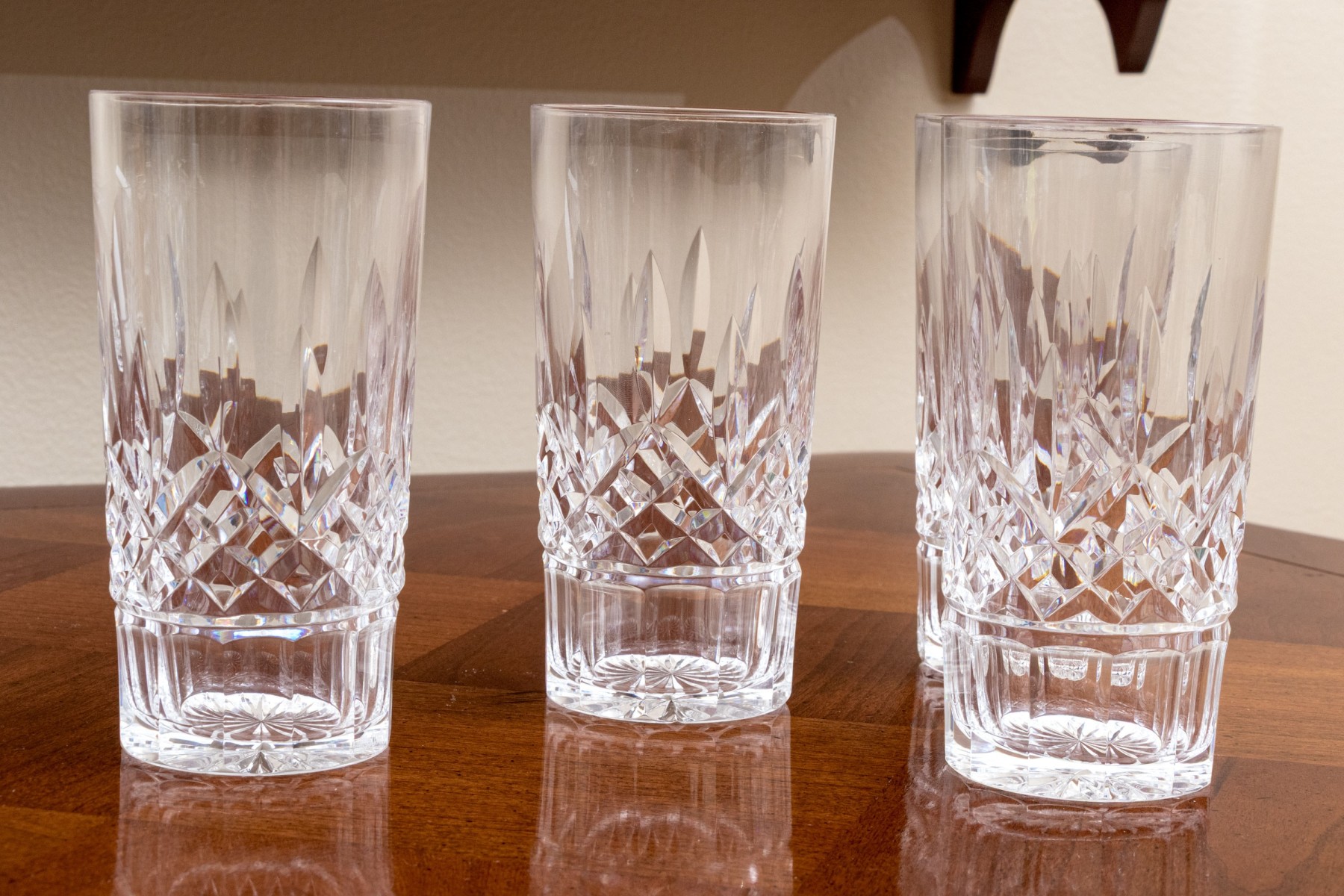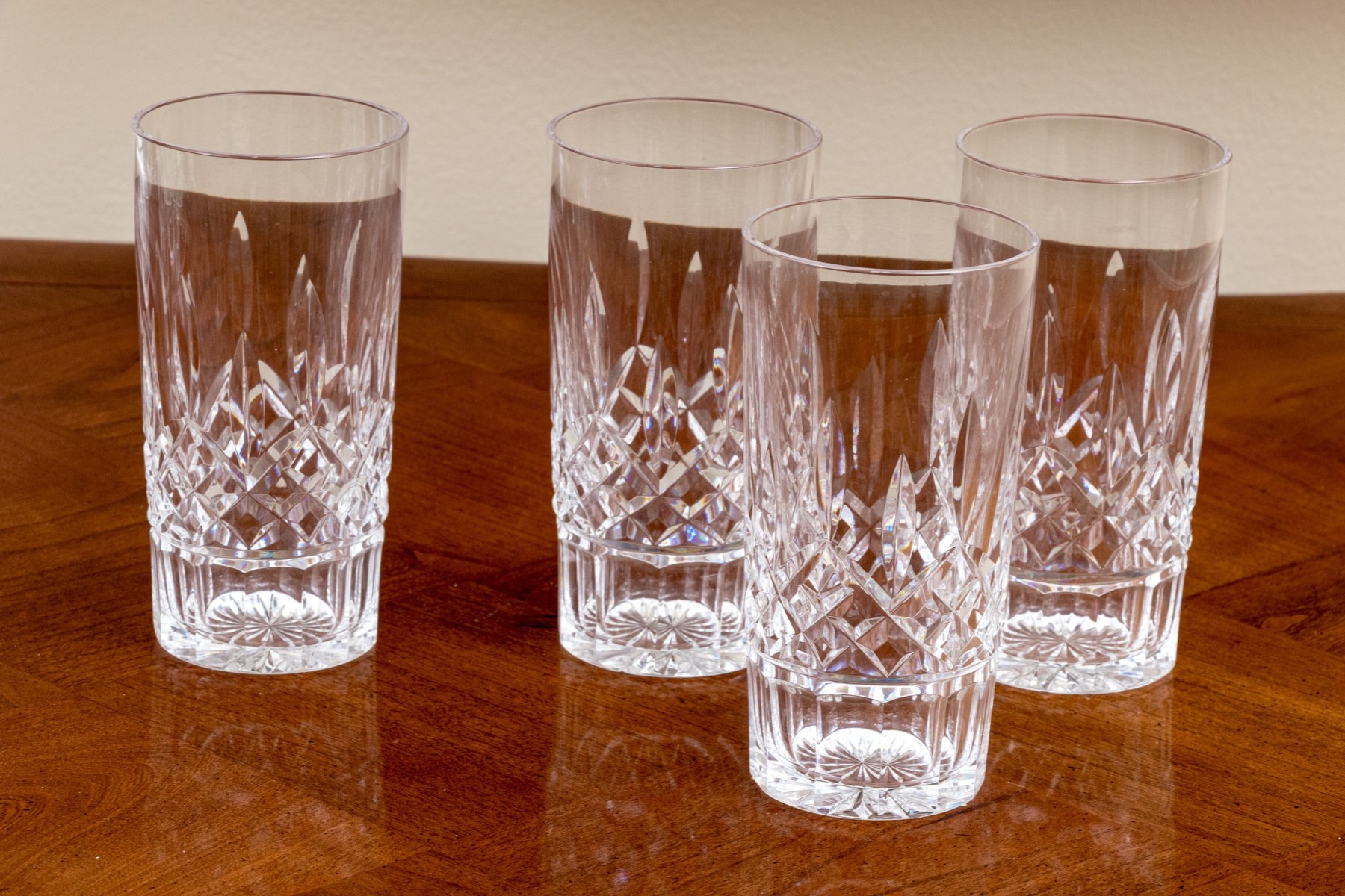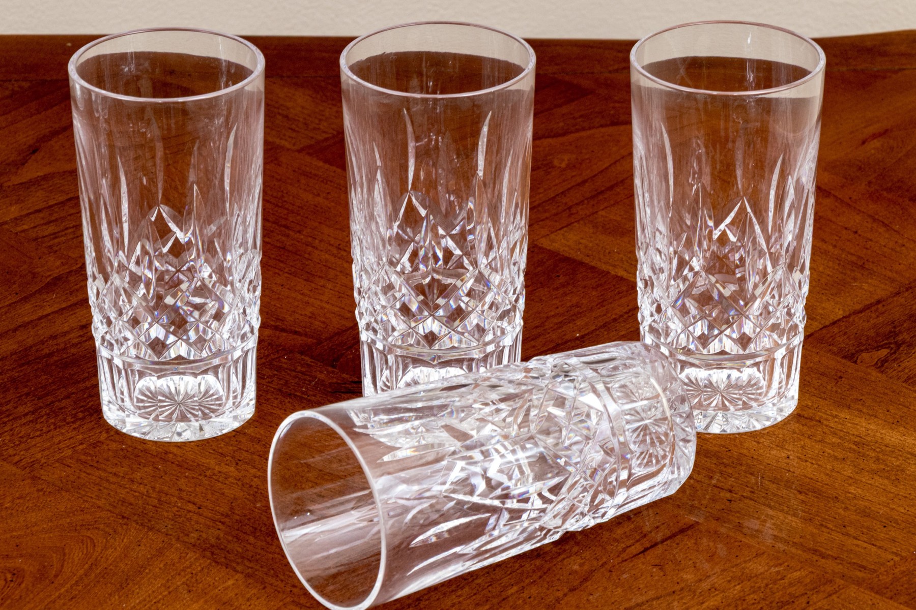 A handsome set of four Waterford "Lismore" crystal highball glasses designed with straight cylindrical forms, beautifully cut with lattices around faceted bases. Marked near the feet.