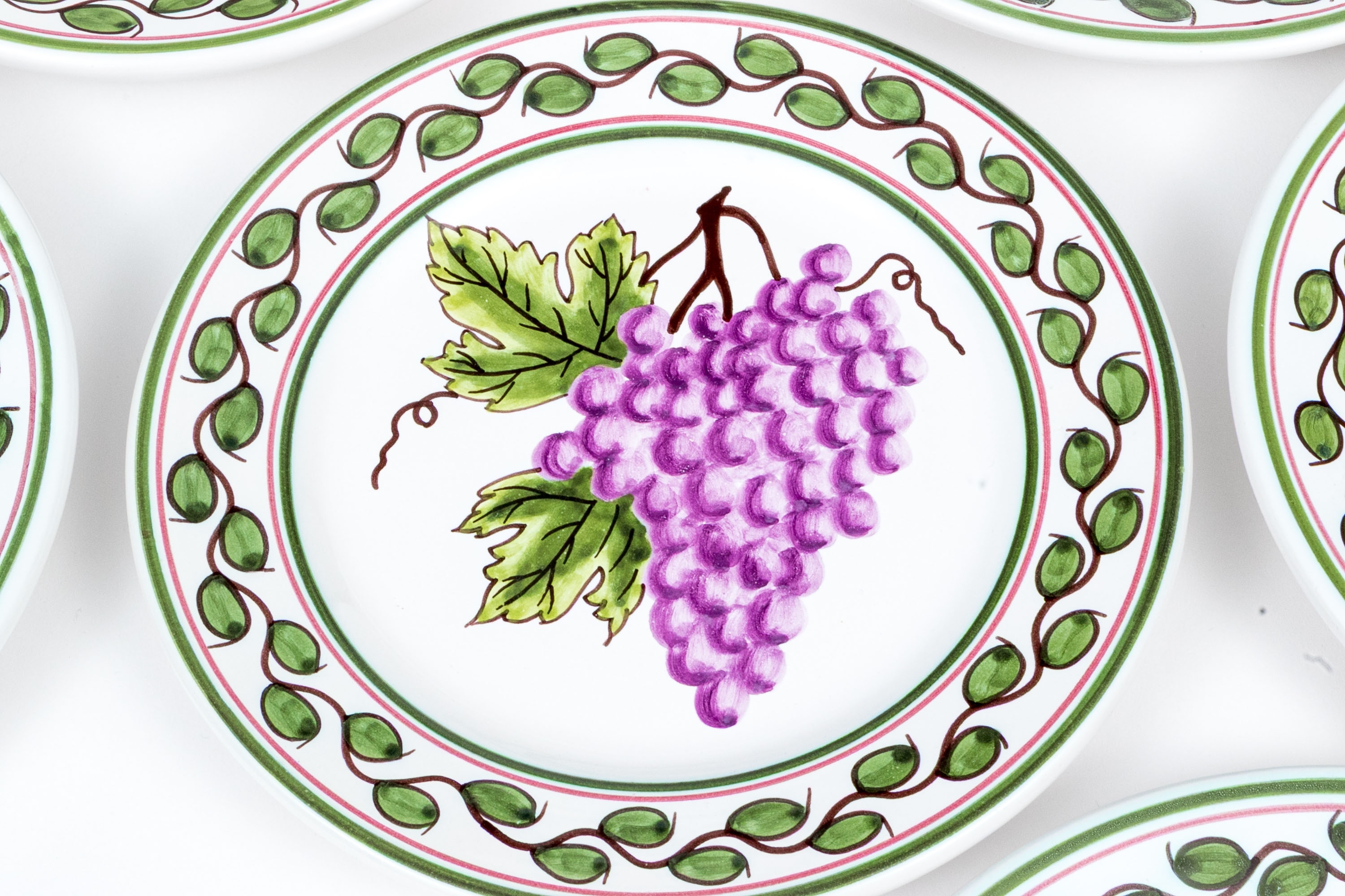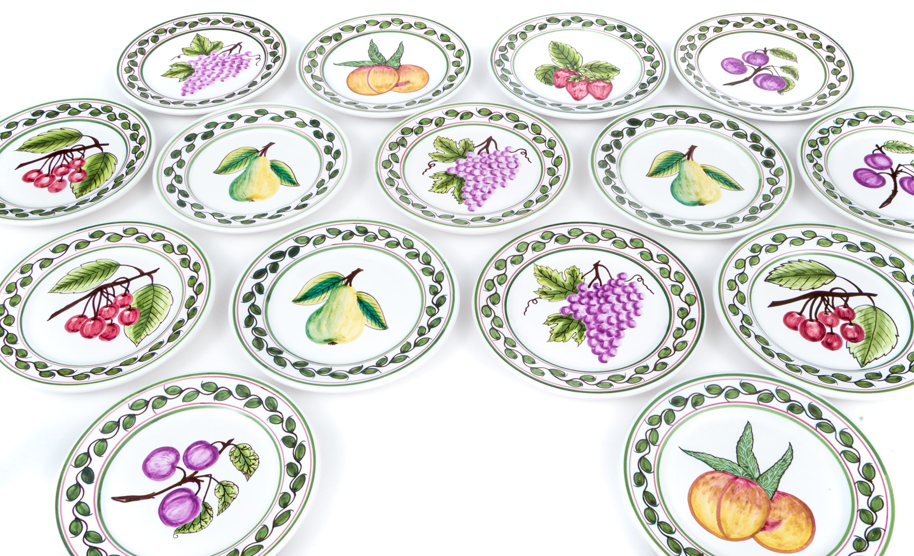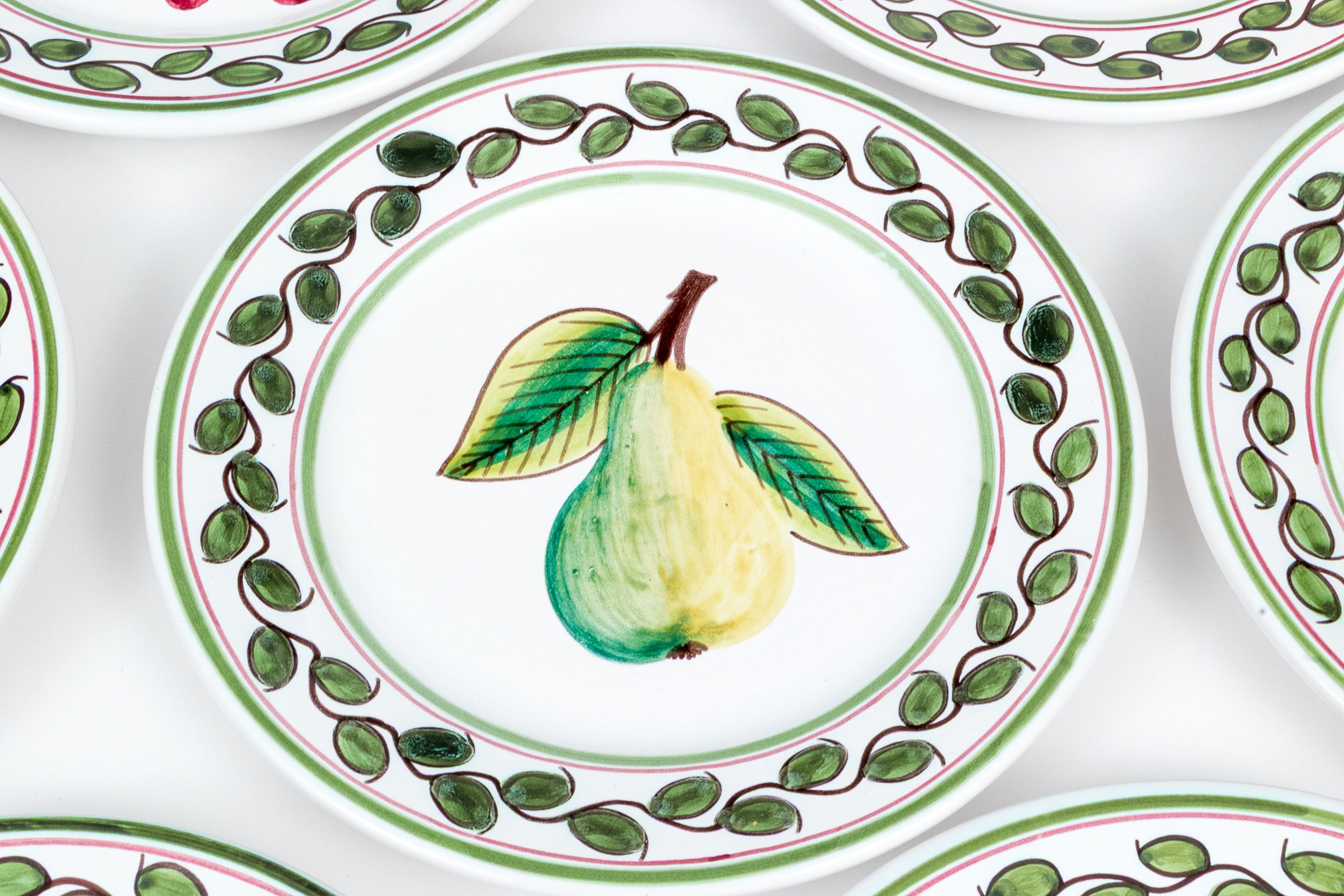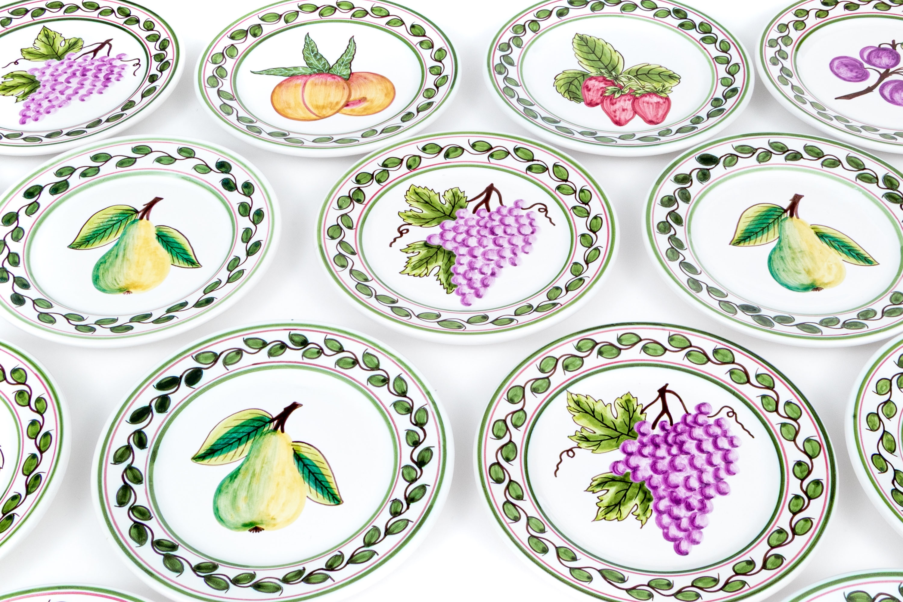 A fabulous set of fourteen Portuguese Conimbricer Winterthur Interpretation ceramic plates in white with large hand-painted fruit motifs a tthe centers and vining leaf borders around the rims. Marked underfoot.