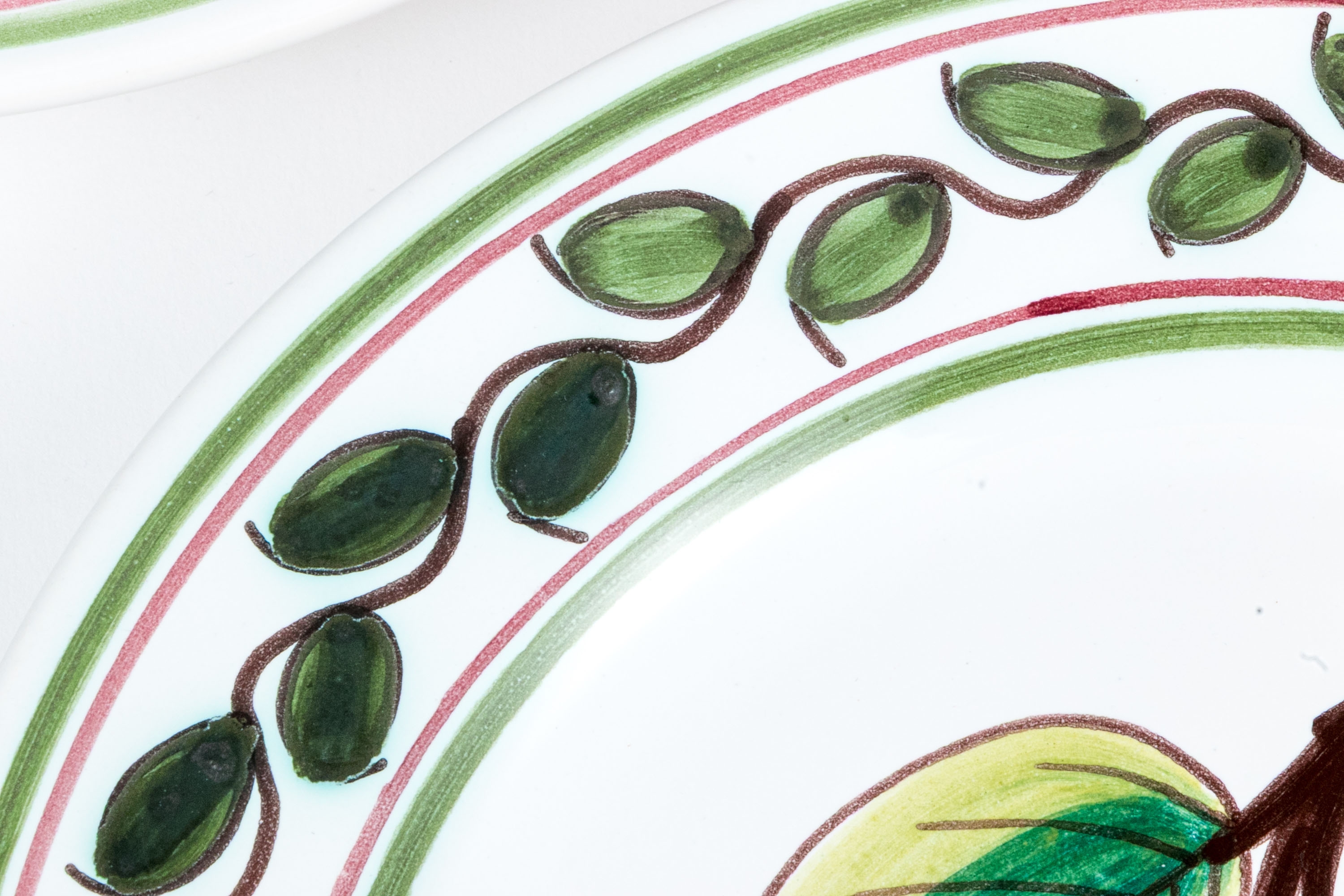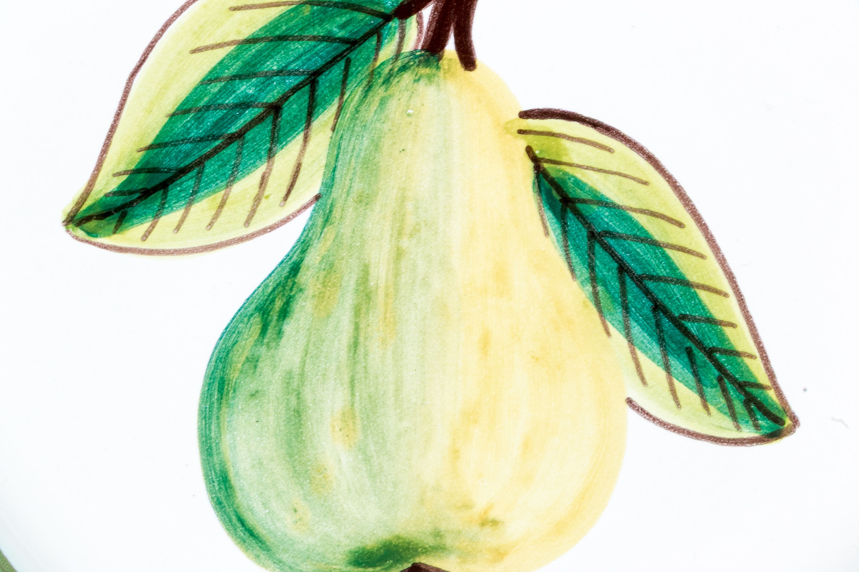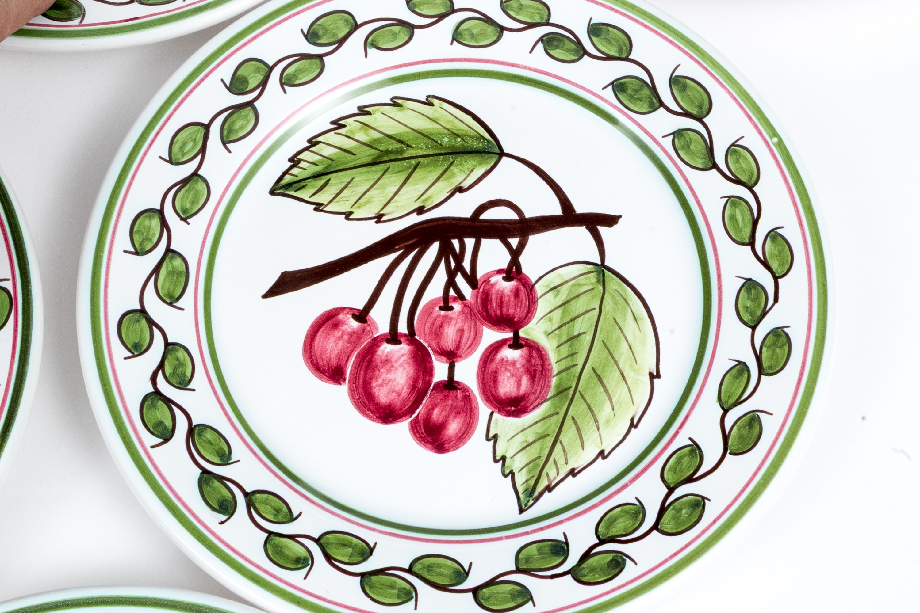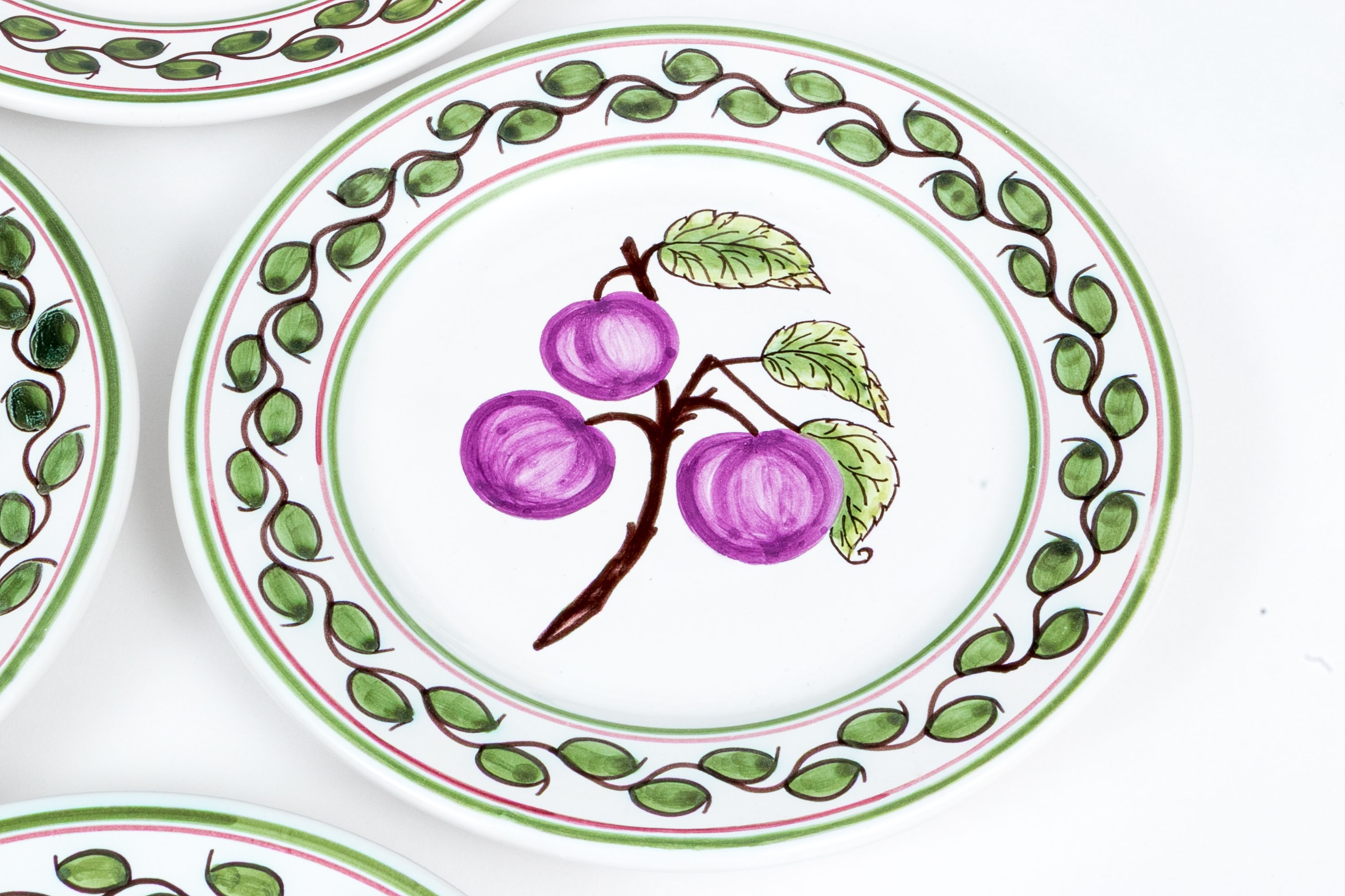 A fabulous set of fourteen Portuguese Conimbricer Winterthur Interpretation ceramic plates in white with large hand-painted fruit motifs a tthe centers and vining leaf borders around the rims. Marked underfoot.