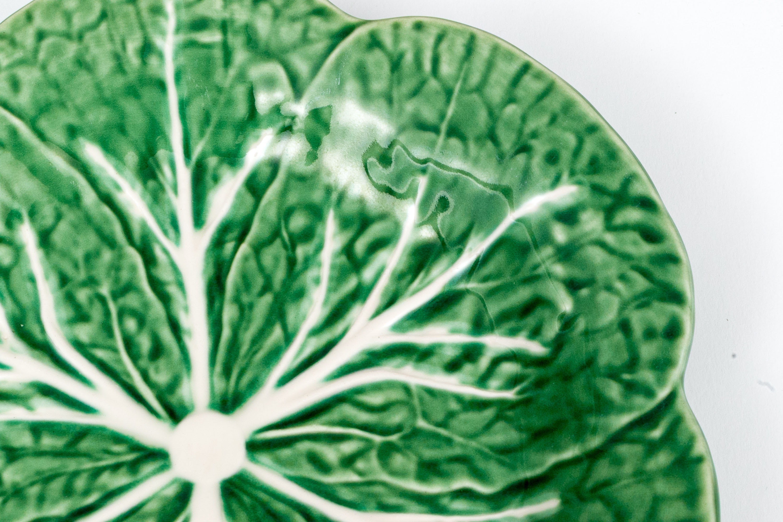 Each naturalistically hand-painted and potted. Green ground with wonderful white veining depicted in relief.
