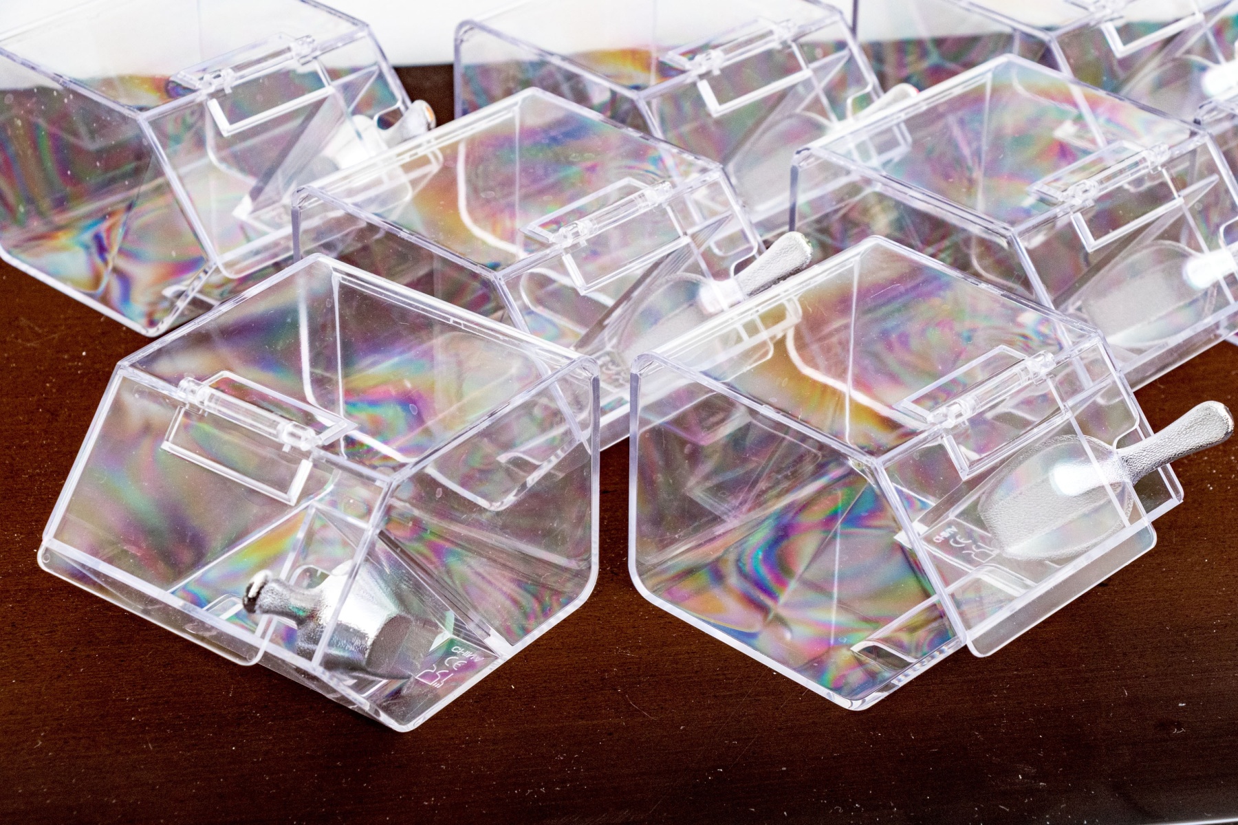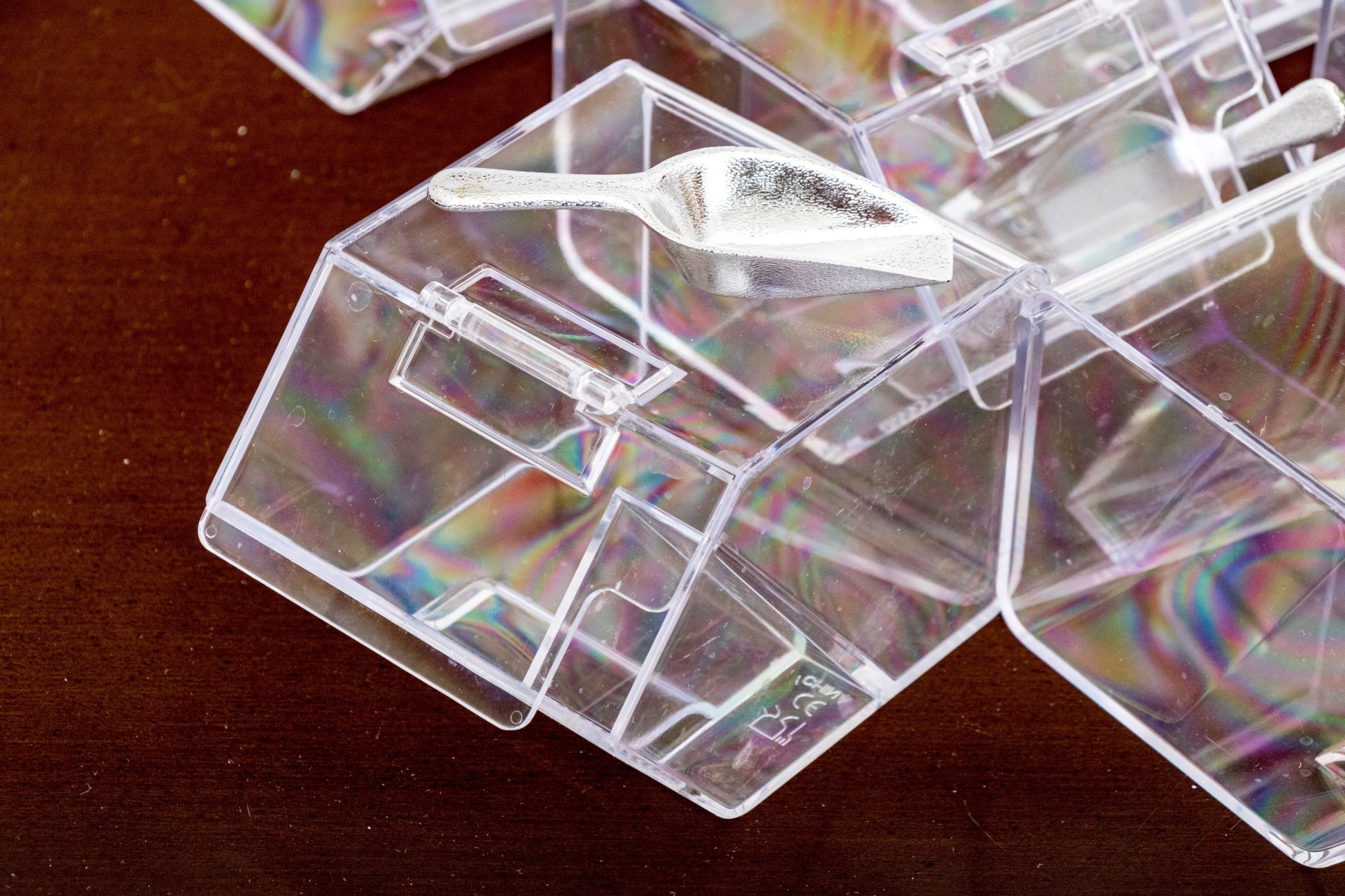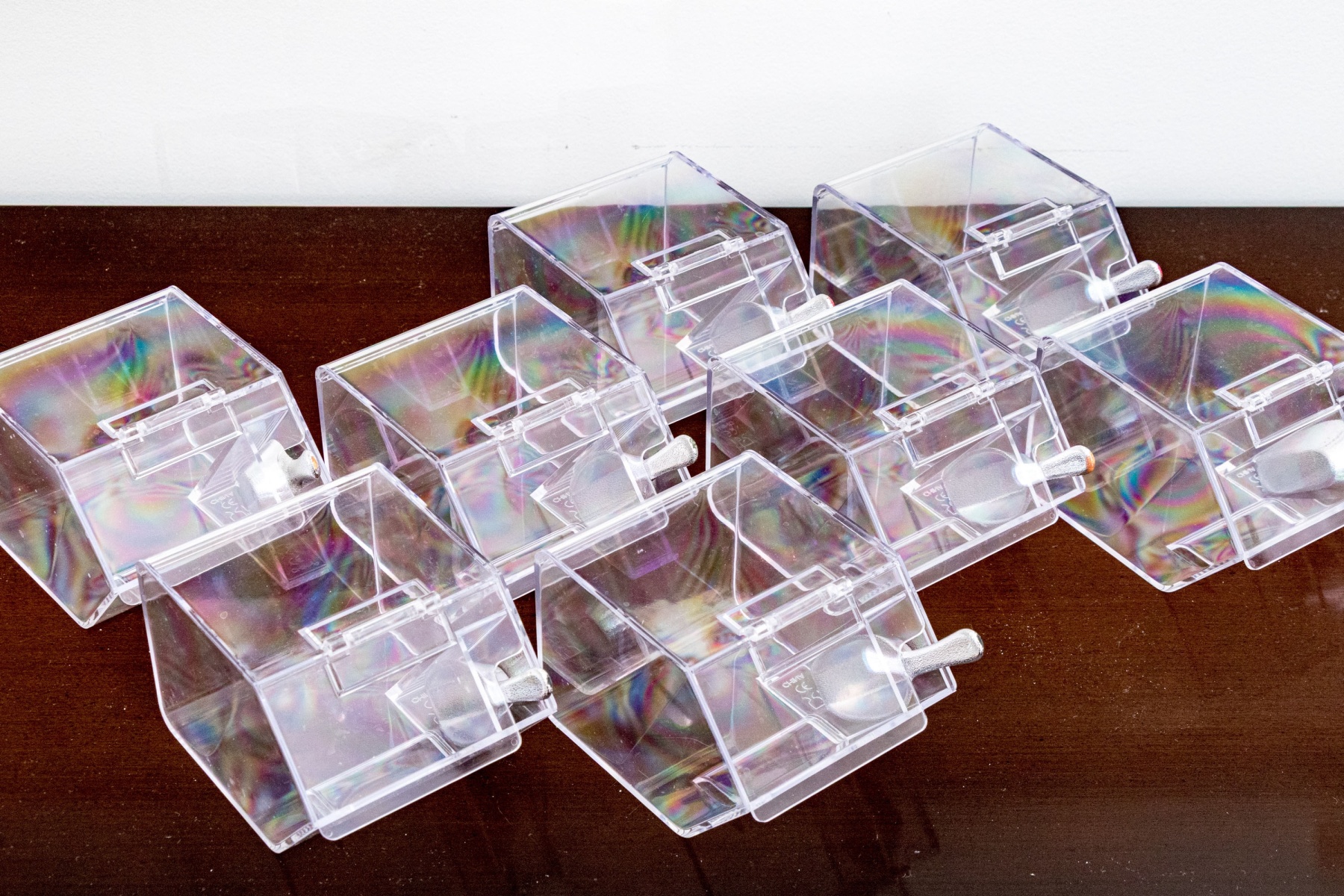 Each lucite bin with hinged door and decorative spoon for a candy bar.