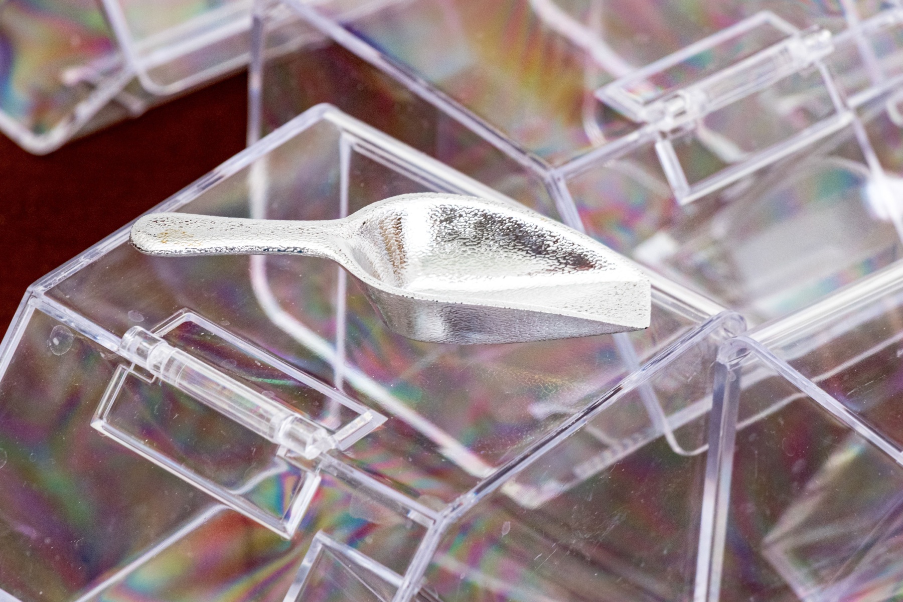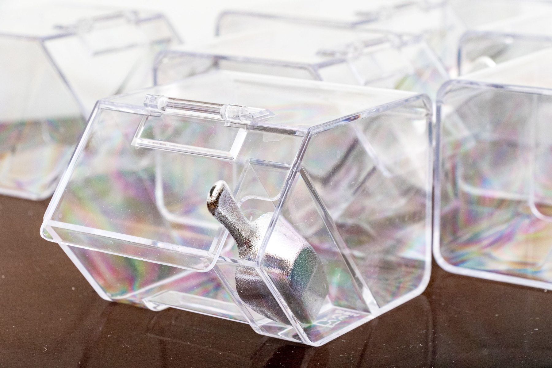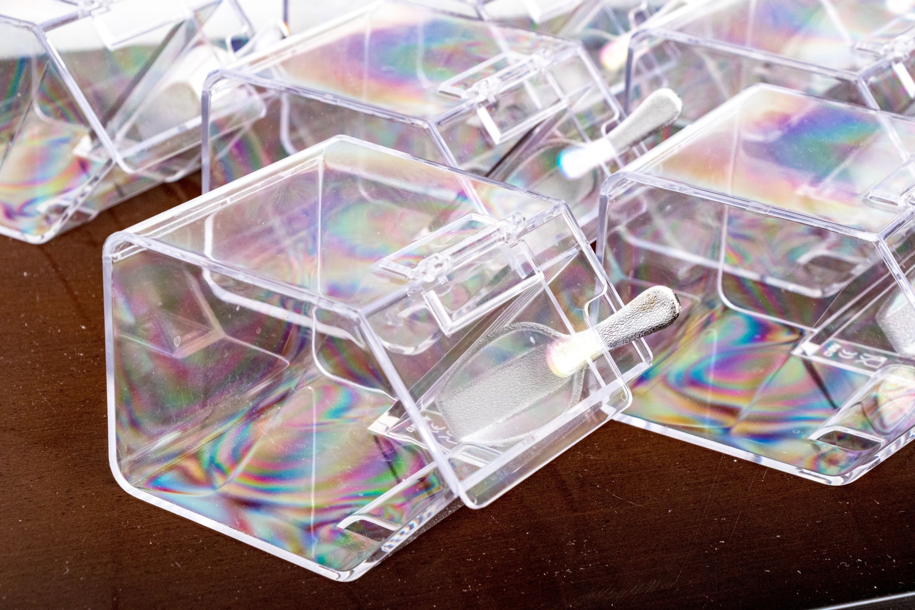 Each lucite bin with hinged door and decorative spoon for a candy bar.