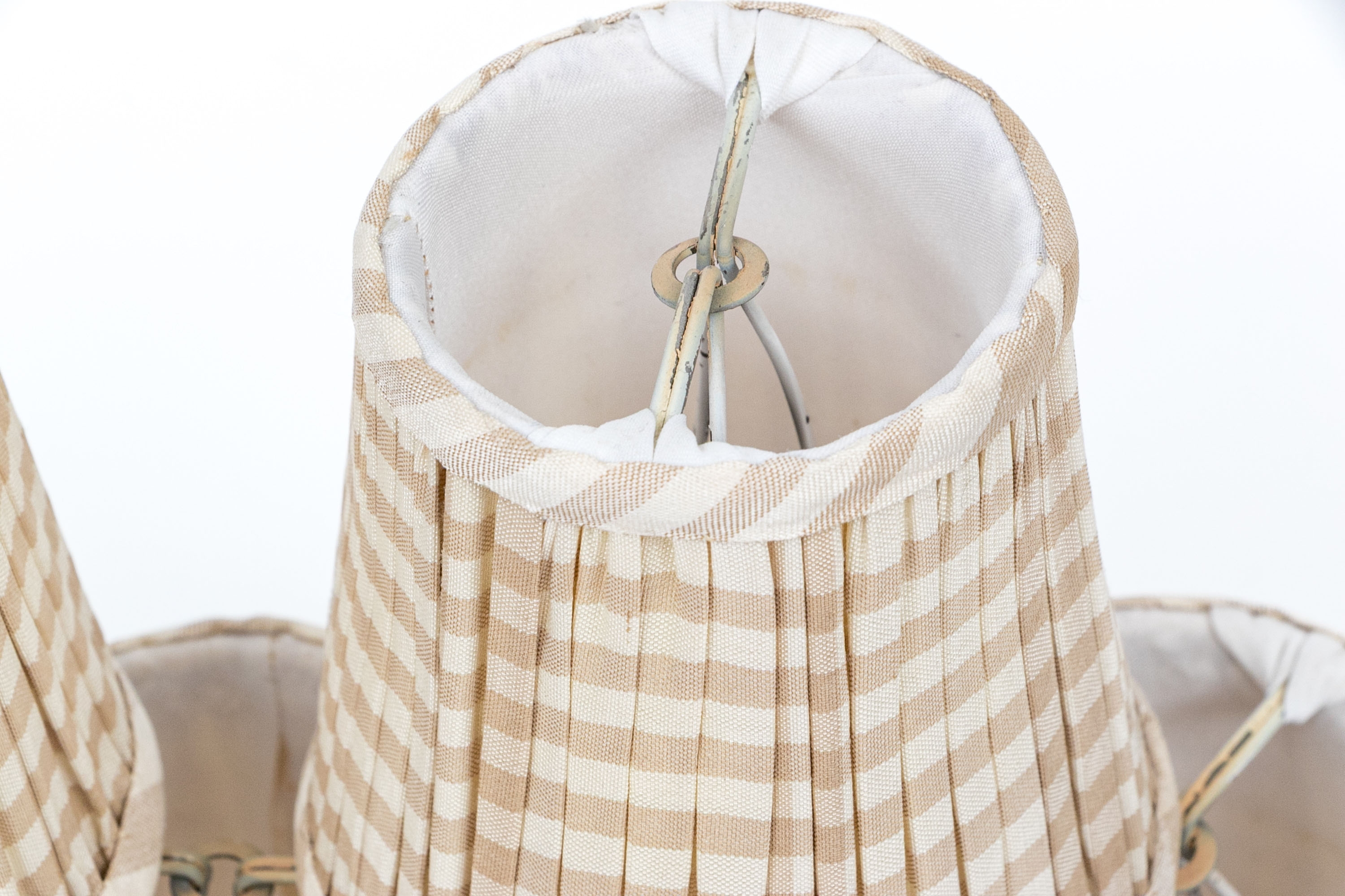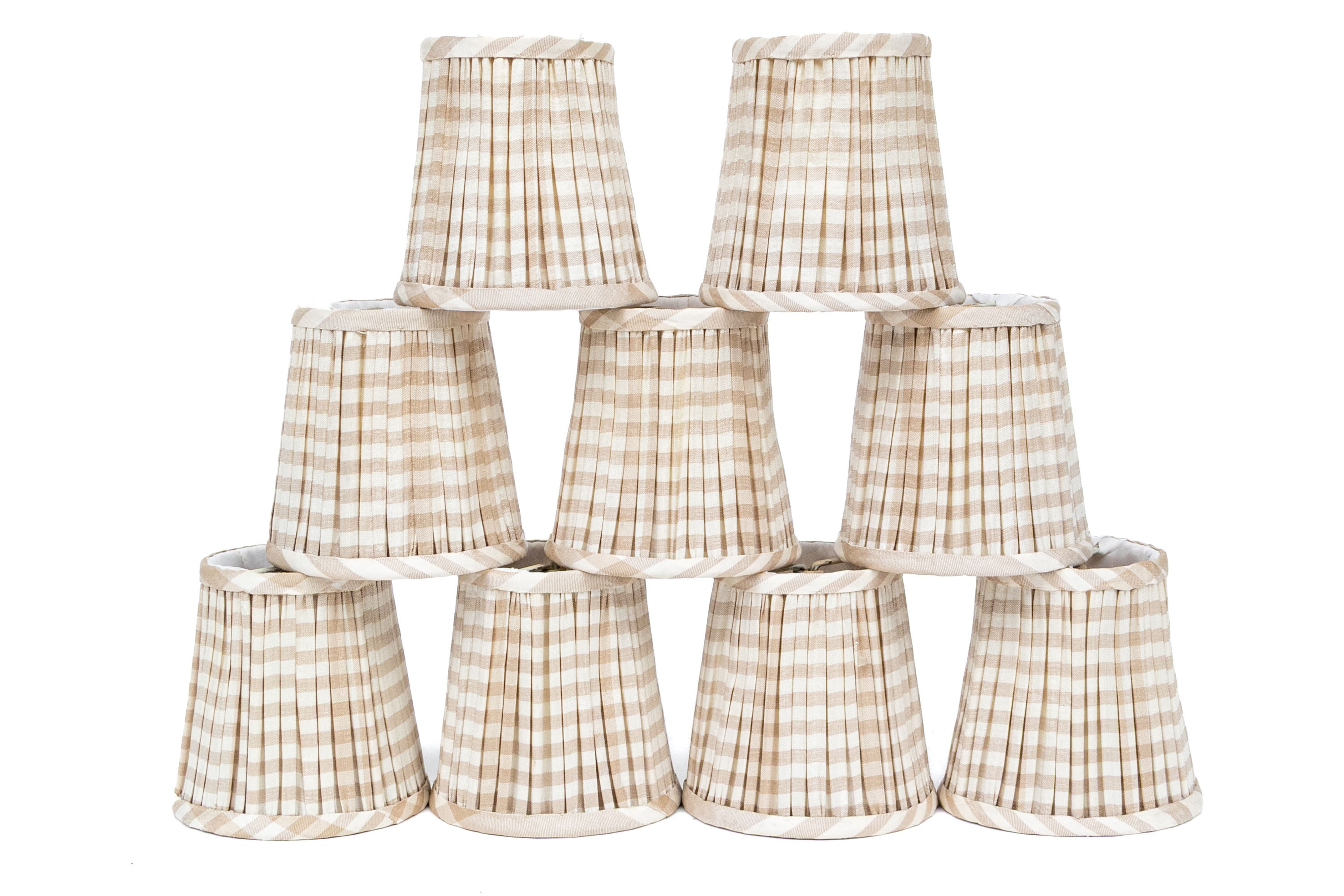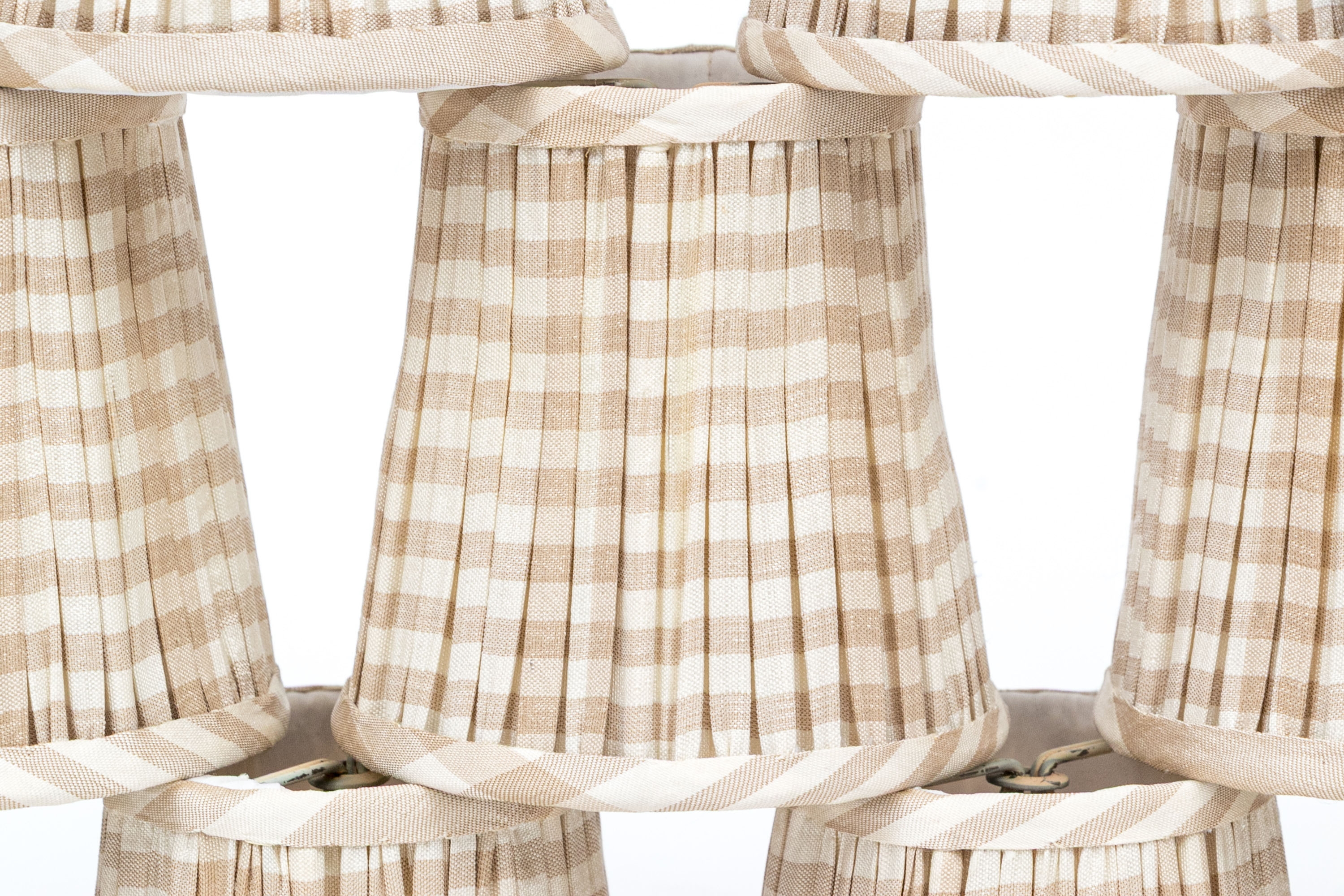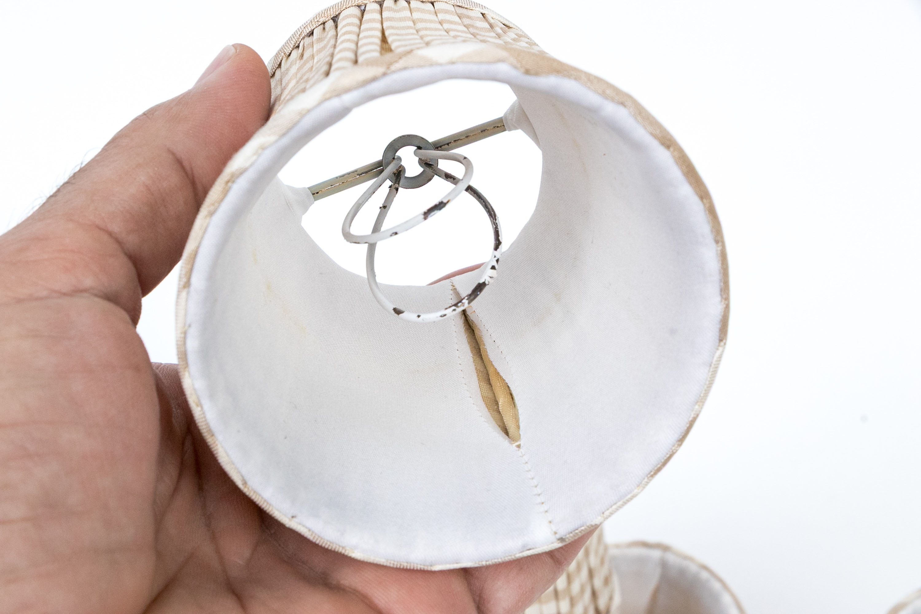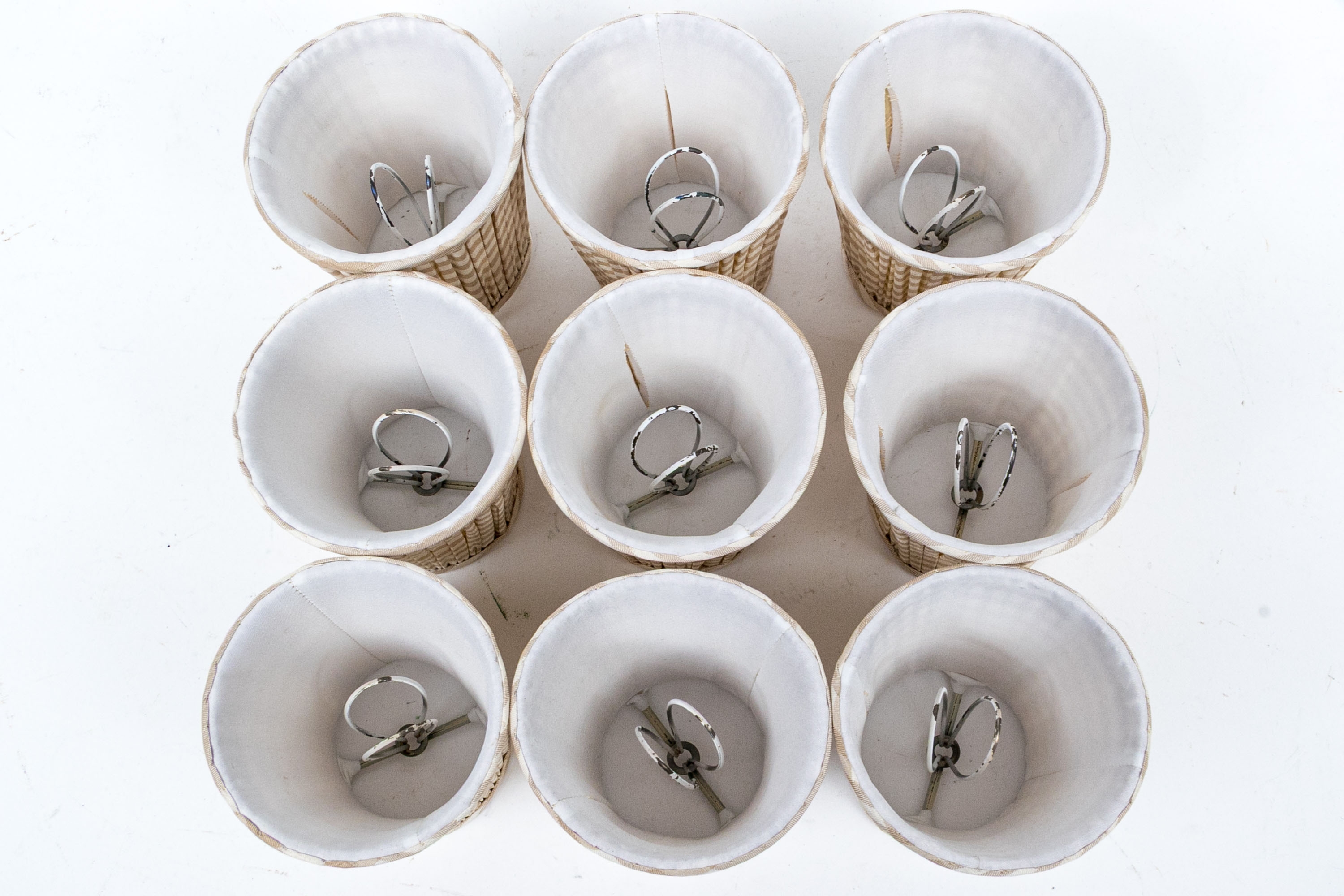 Each is diminutive and wonderful with striped pattern including off white and light brown with interiors having brackets to position atop bulbs.