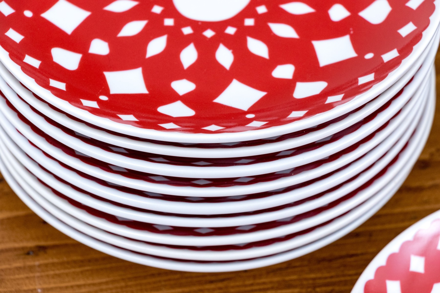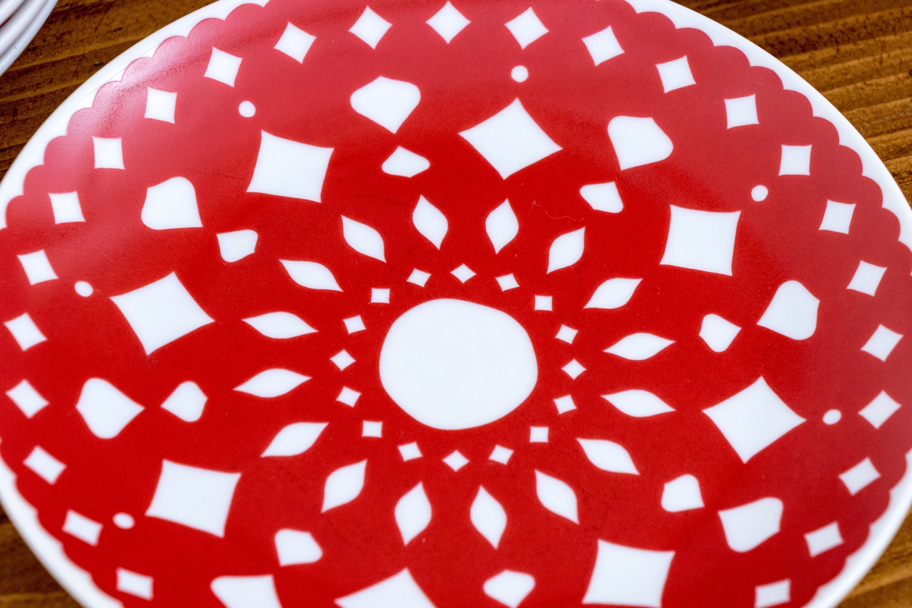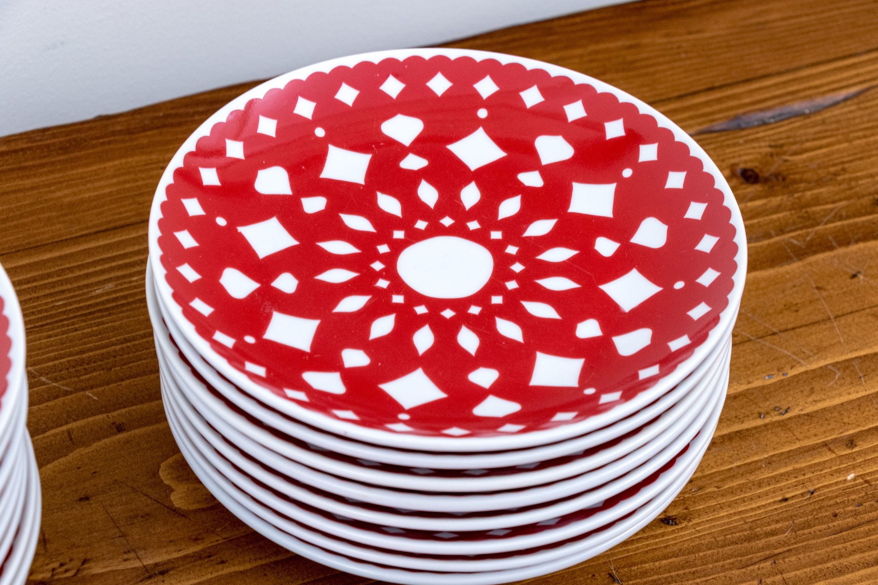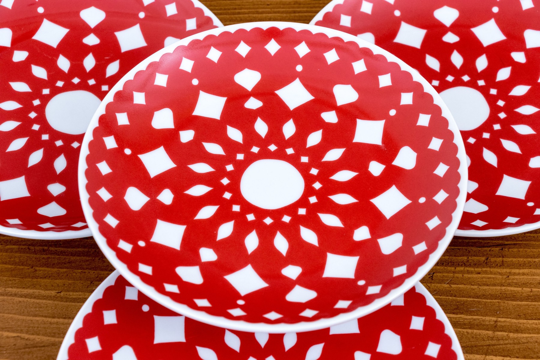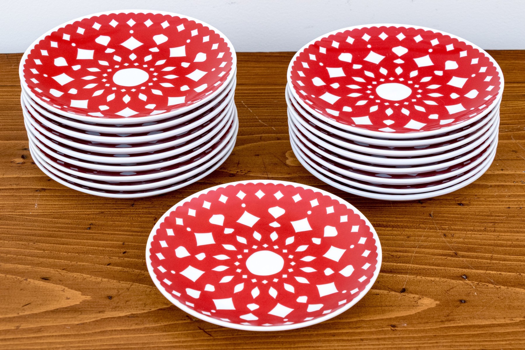 A wonderful set of nineteen Crate & Barrel ceramic appetizer plates with vibrant red snowflake motifs. The motifs are abstract enough to be suitable for year-round use, showcasing doily-like scalloped rims and geometric concentric designs against bright white bodies. Marked underfoot.