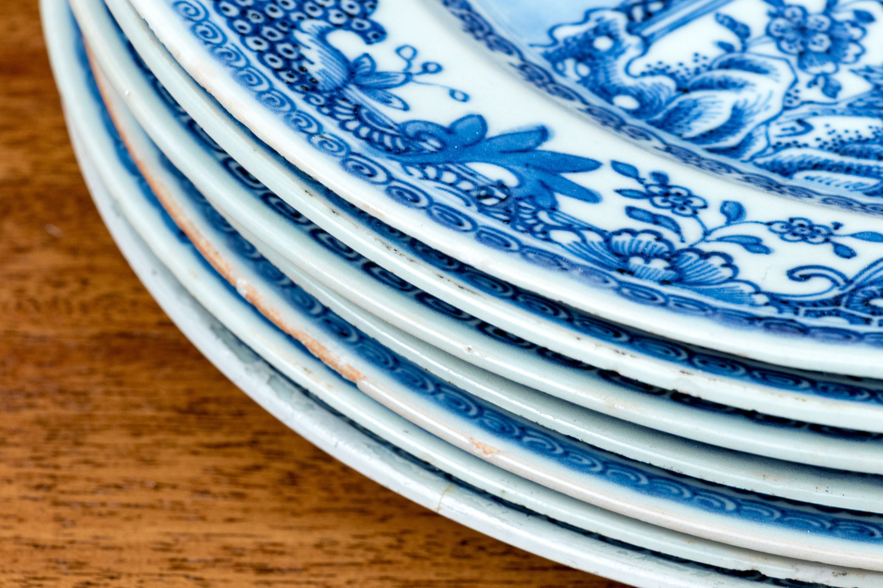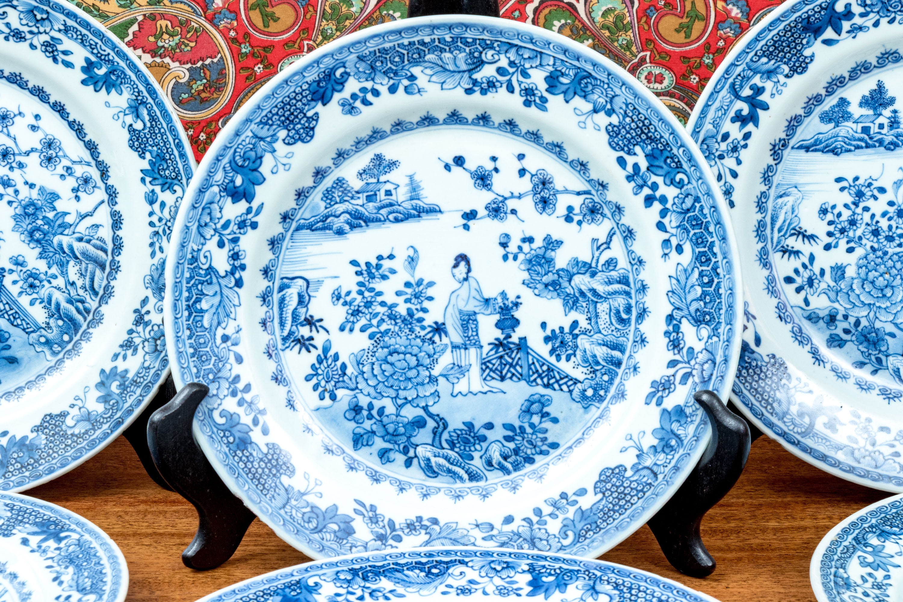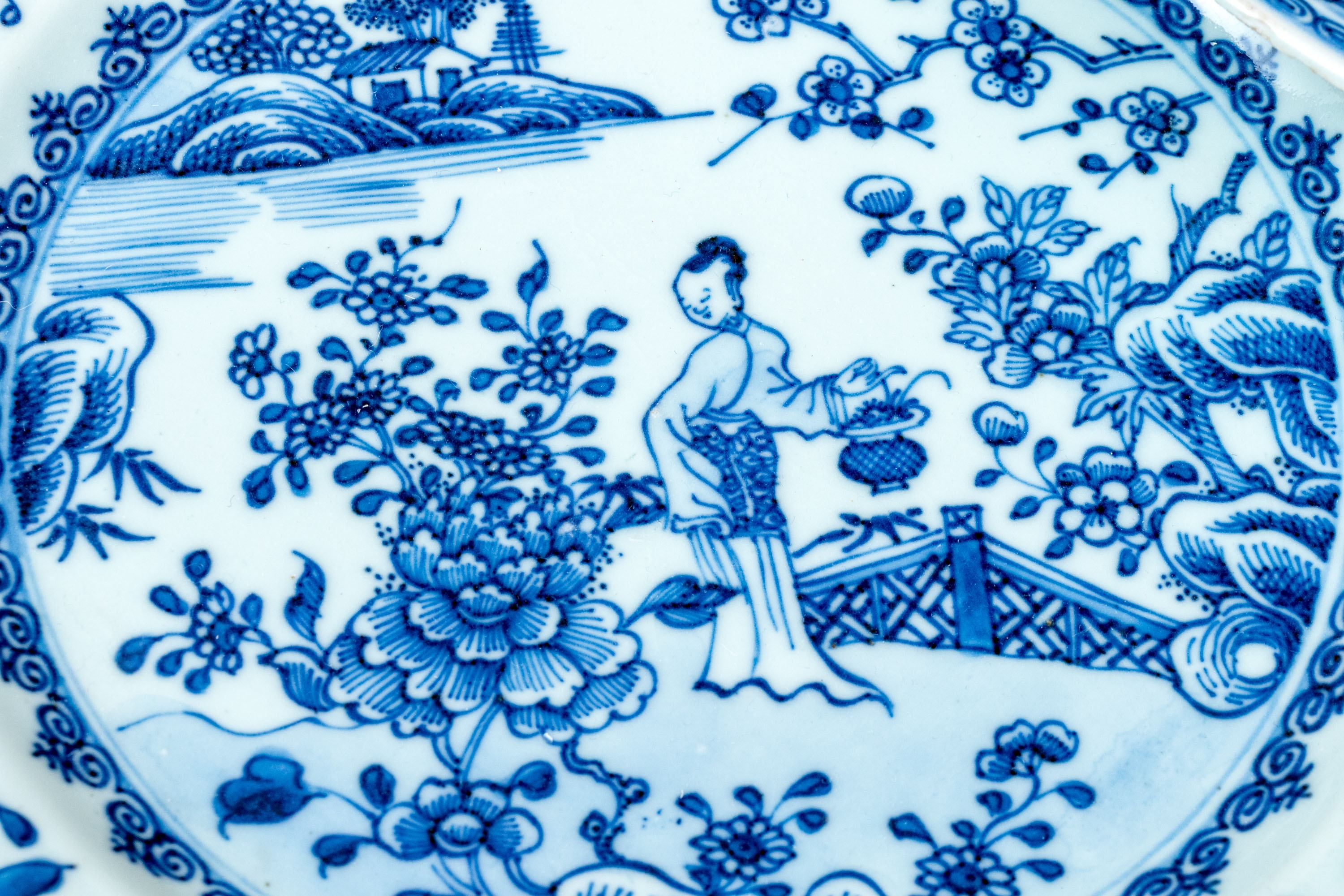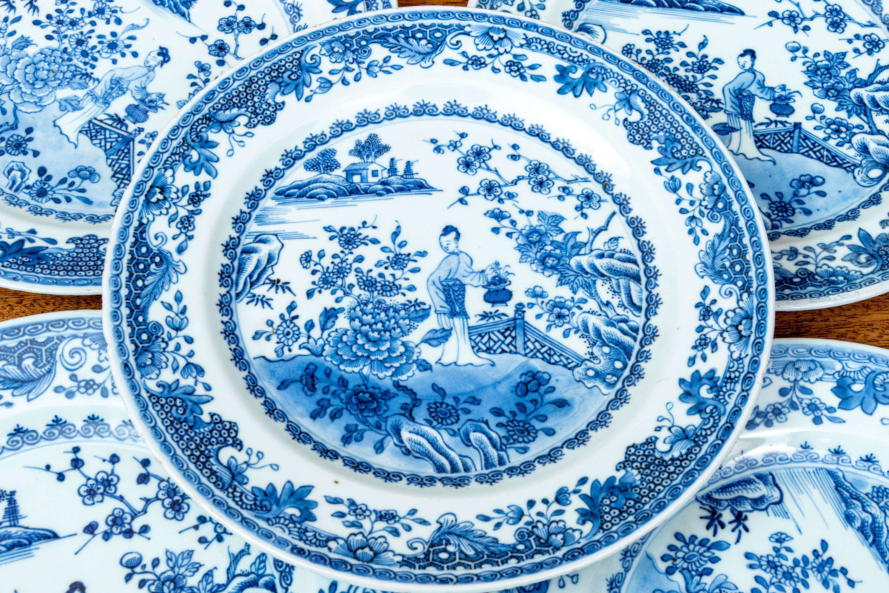 Each wonderfully decorated with underglaze blue motifs depicting figures in architectural landscapes with ornately decorated rims.