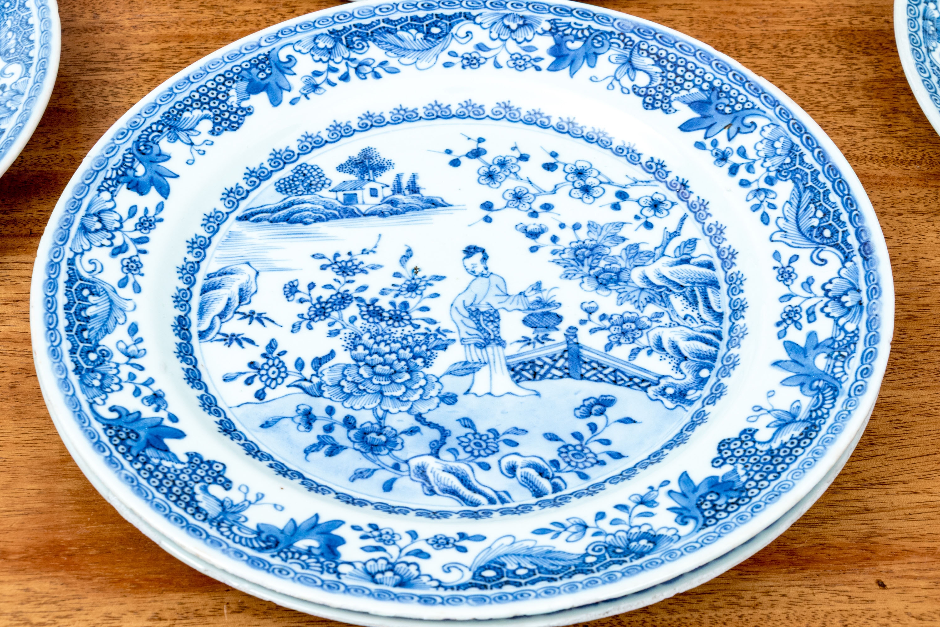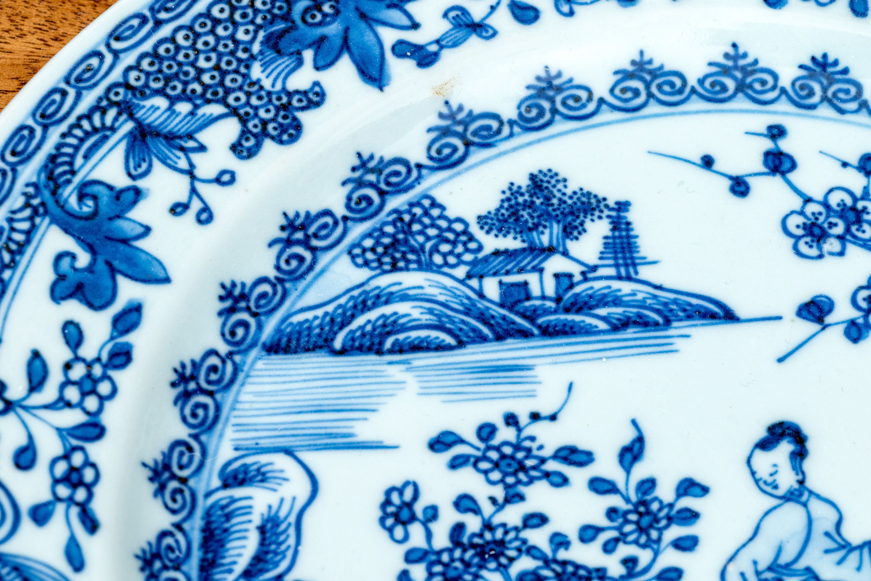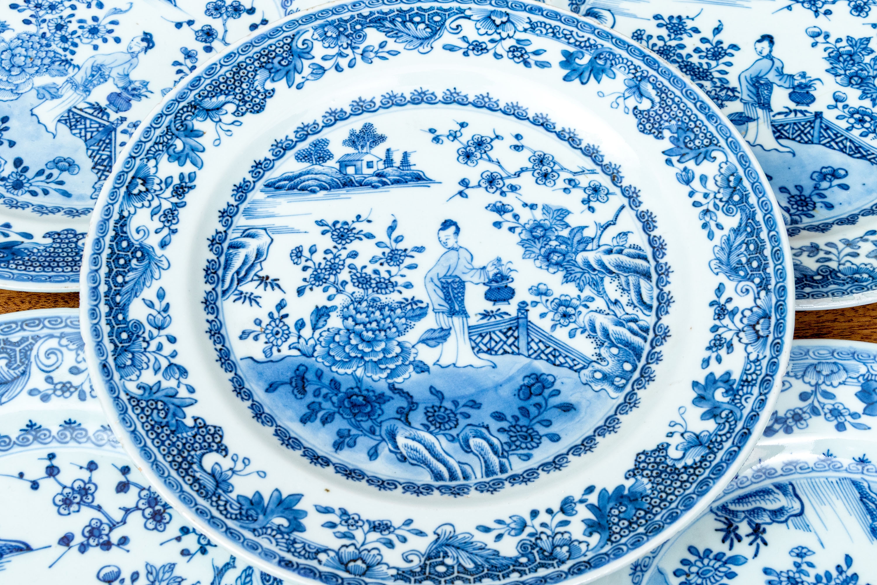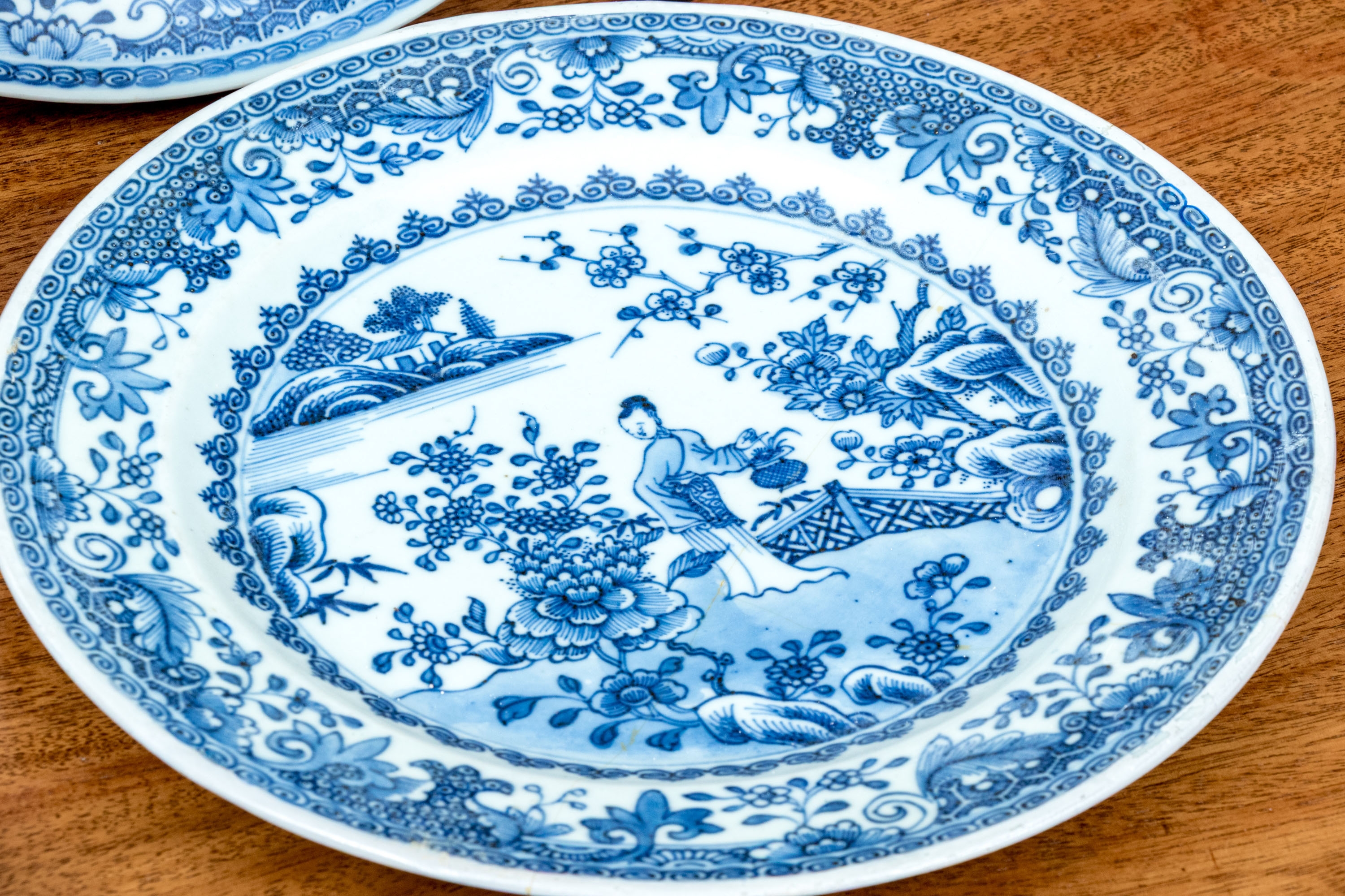 Each wonderfully decorated with underglaze blue motifs depicting figures in architectural landscapes with ornately decorated rims.