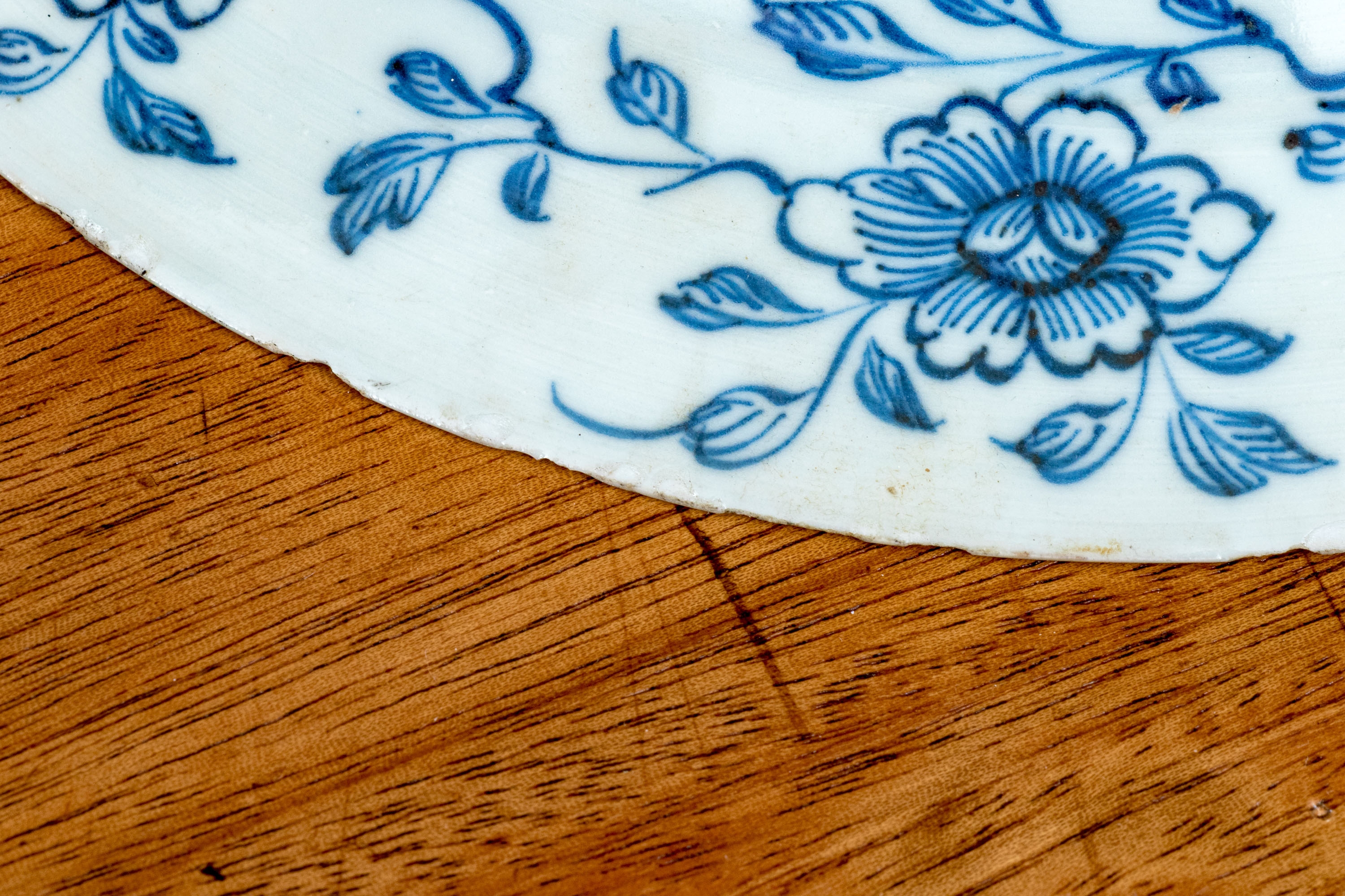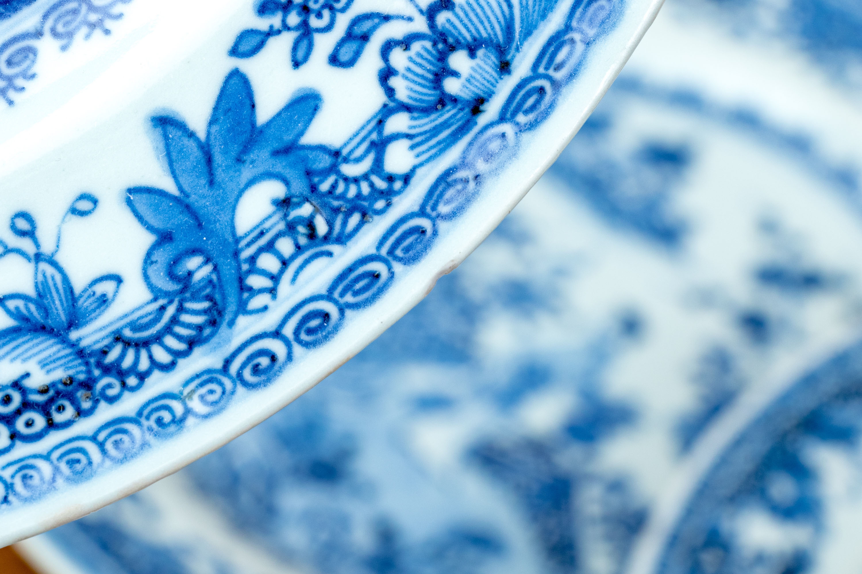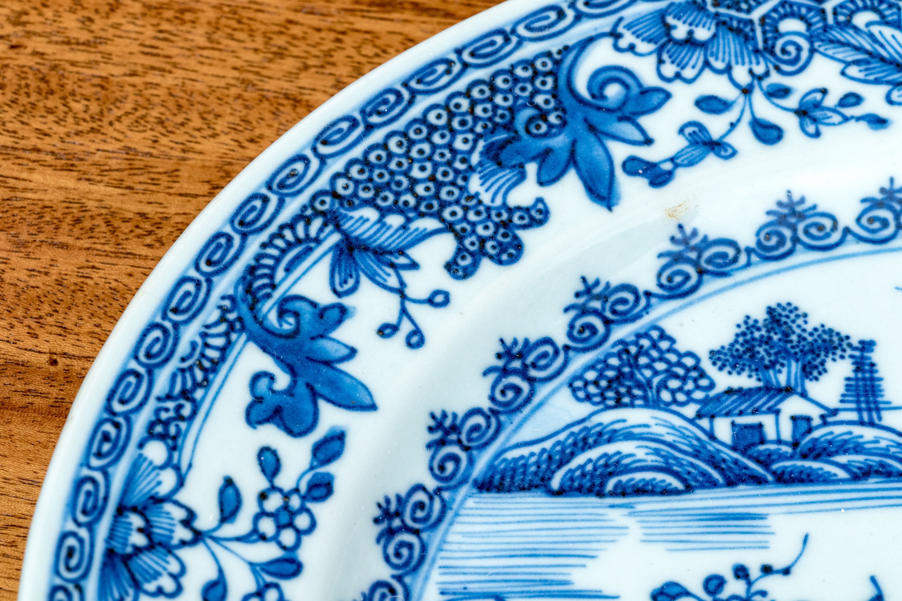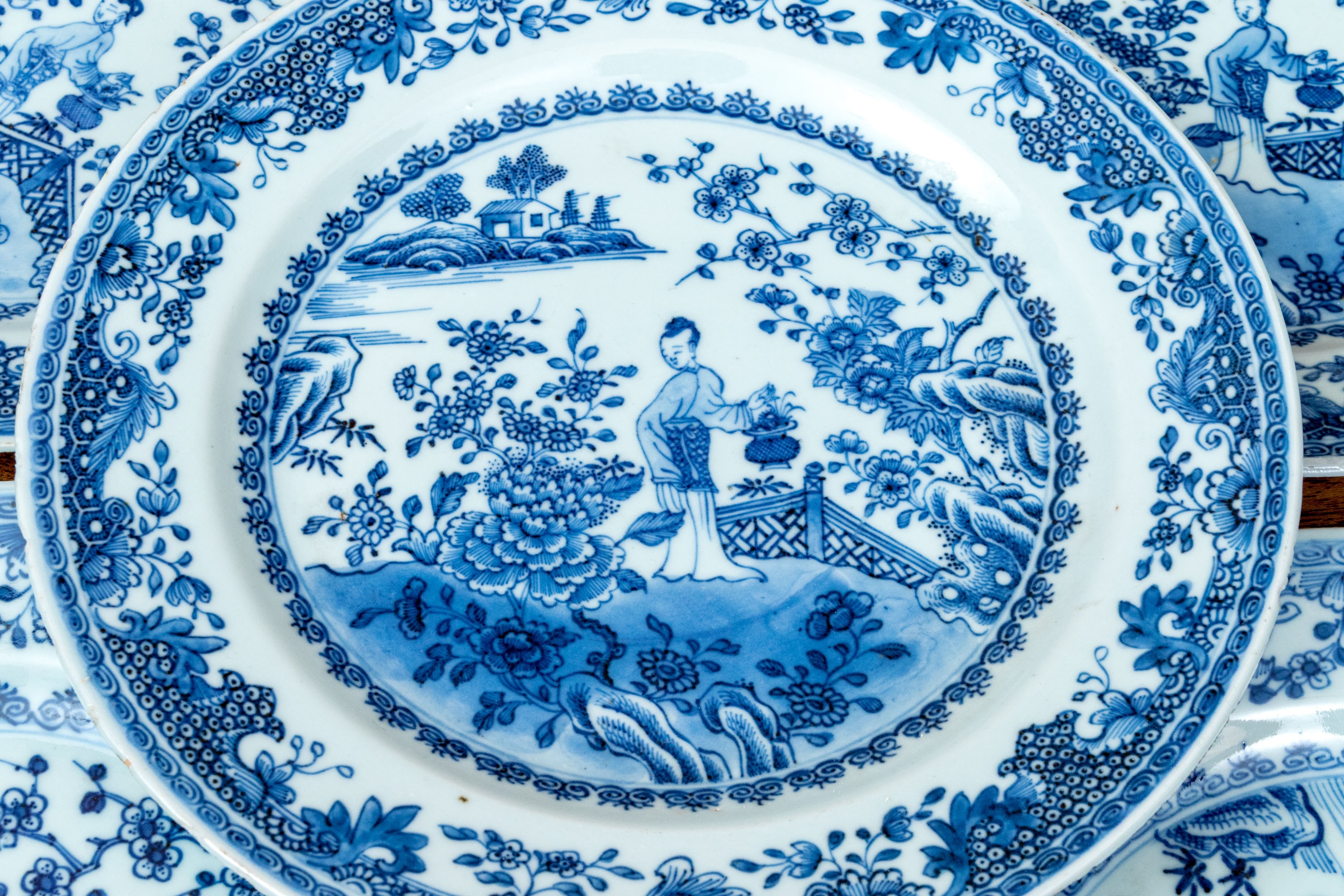 Each wonderfully decorated with underglaze blue motifs depicting figures in architectural landscapes with ornately decorated rims.