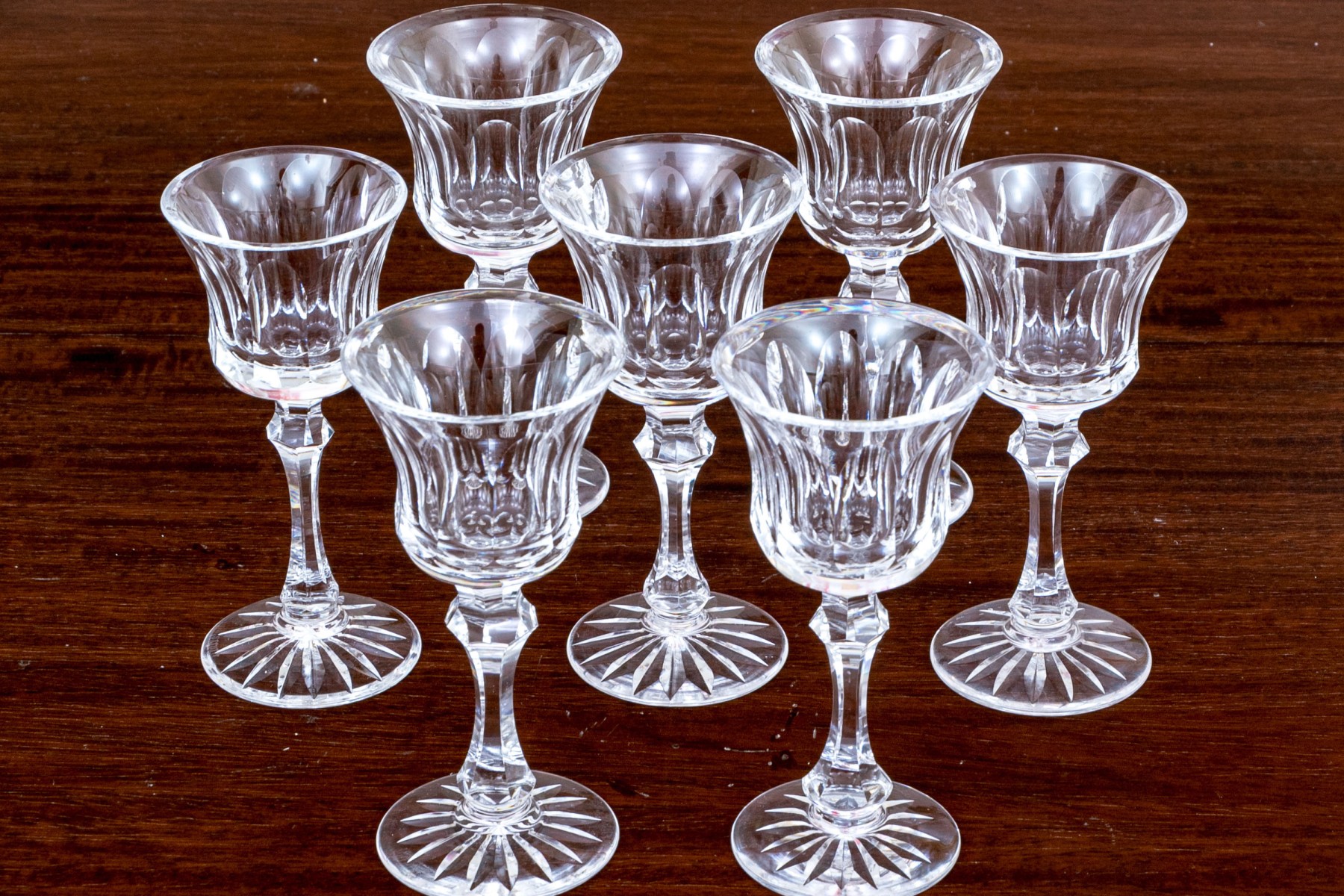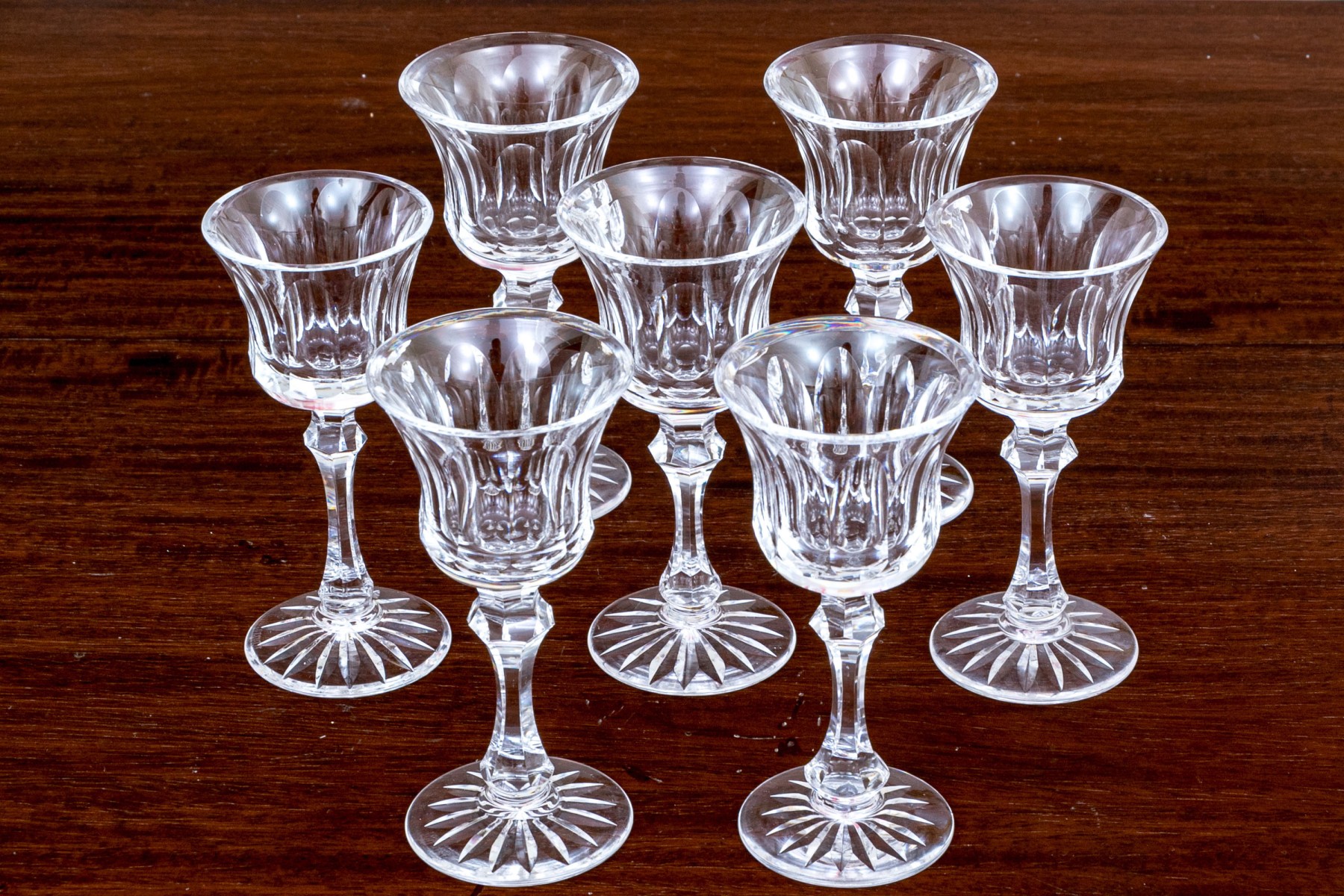An excellent collection of seven cordial/sherry glasses, likely Waterford Crystal "Innisfall." The quality glasses are nicely weighted with the perfect thickness blending stability with elegance. Features subtly flared rims over wide cylindrical bowls cut with petaled fluting for dazzling shimmer. Faceted stems are flared at the top and bottom, following a concave curve. The circular feet are cut with radiating sunbursts, adding to the sophisticated style of the designs.