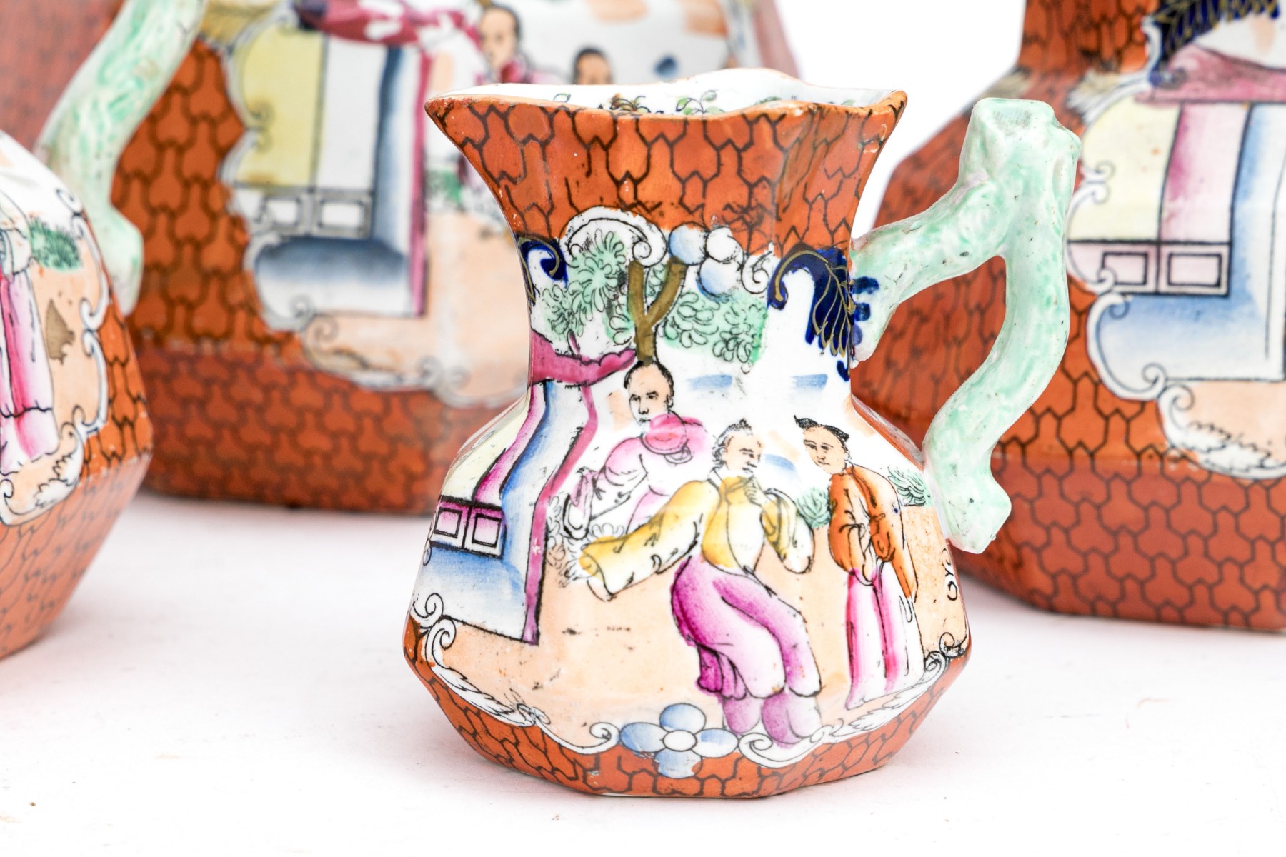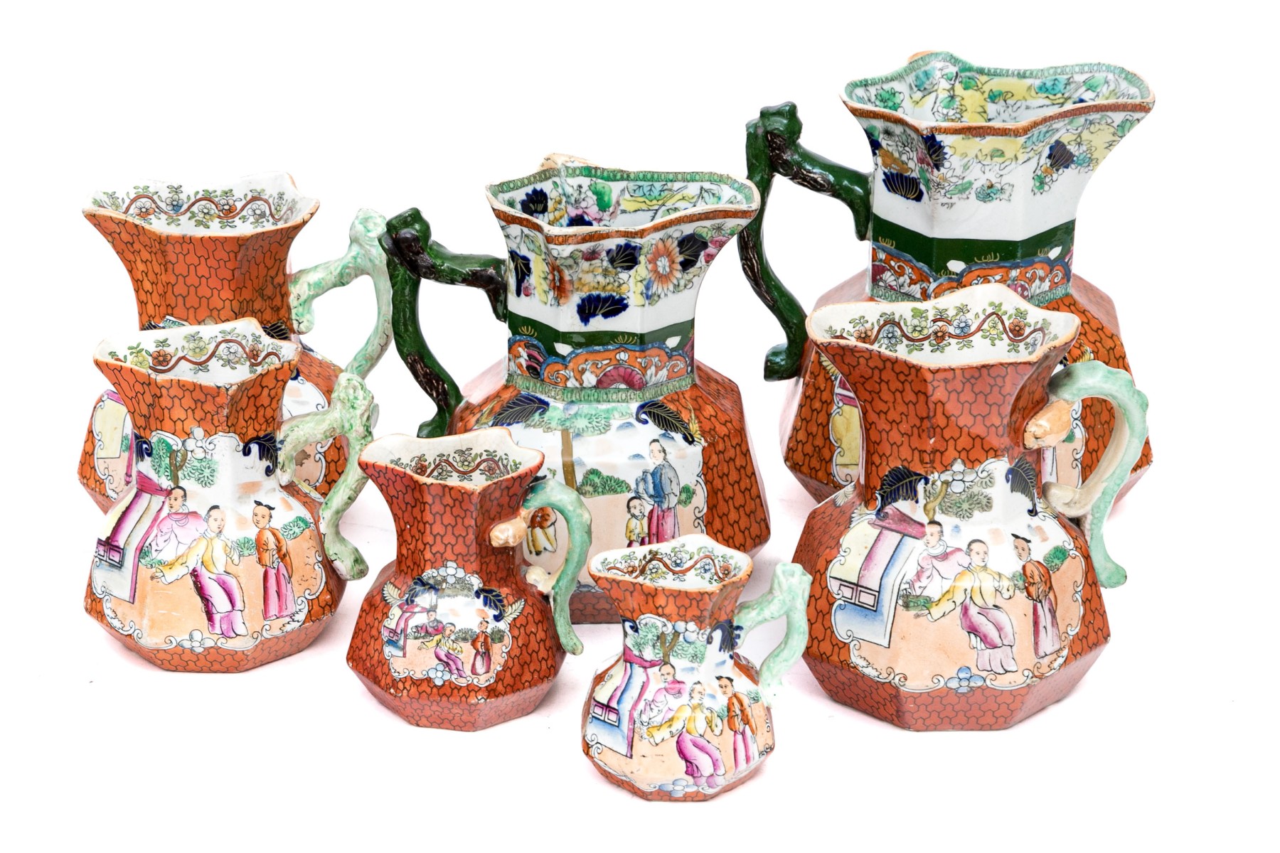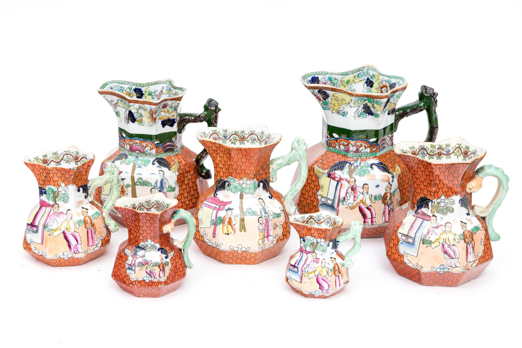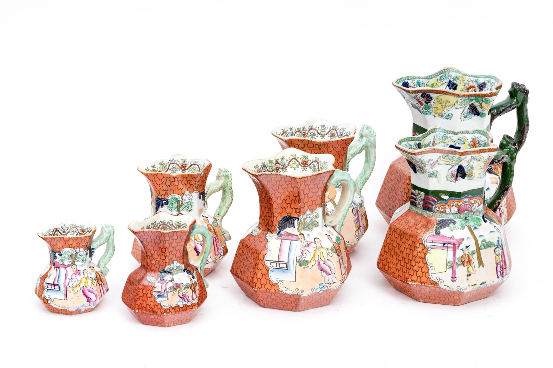 Marked Mason's Patent Ironstone China underfoot with a crown. Each of varied size and slight variations to the decorative motifs but all present charmingly. Dimensions: Largest: 8 1/2 H x 7 3/4 L x 7 1/2 W // Smallest: 3 7/8 H x 3 3/4 L x 3 1/4 W