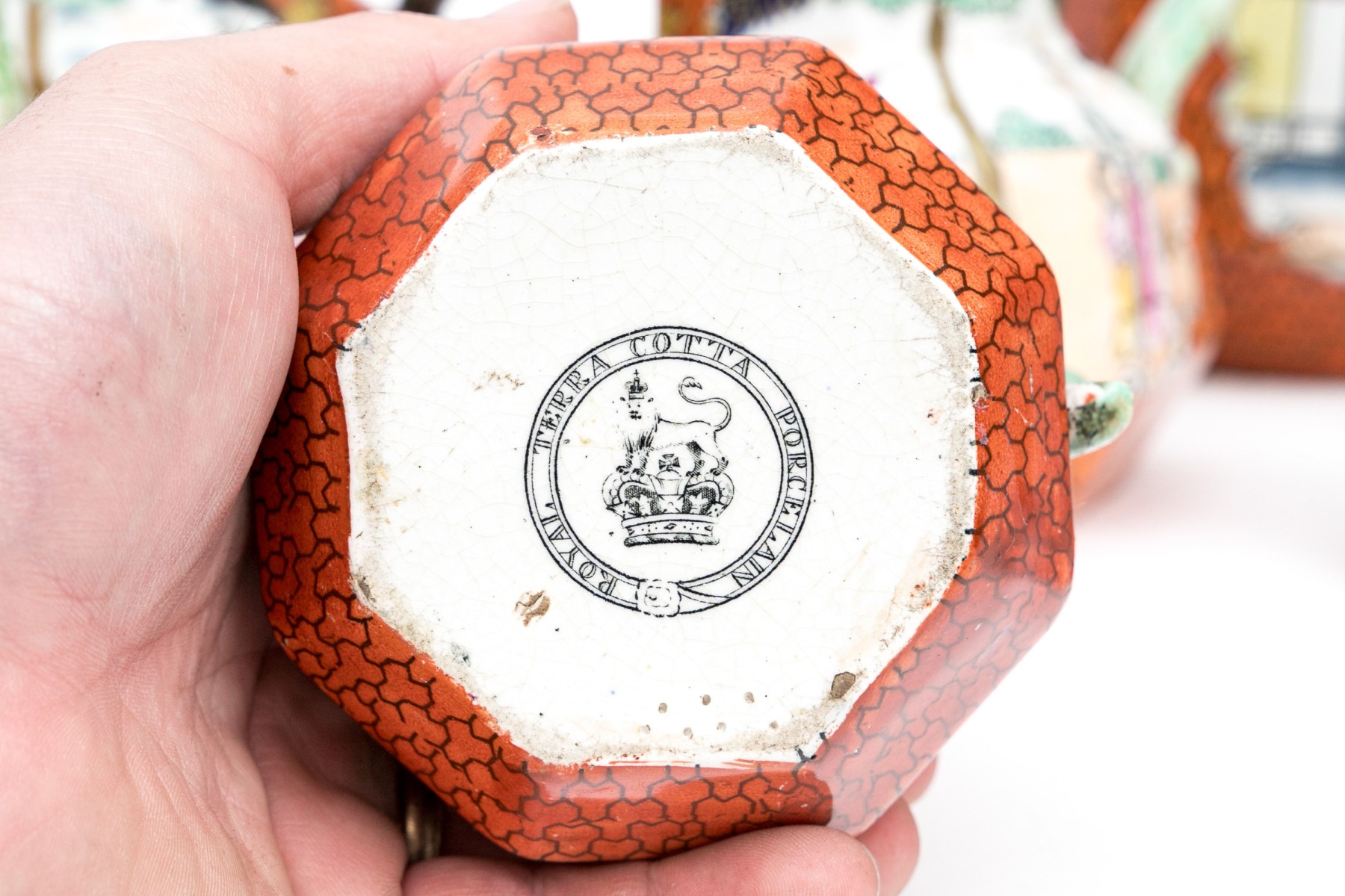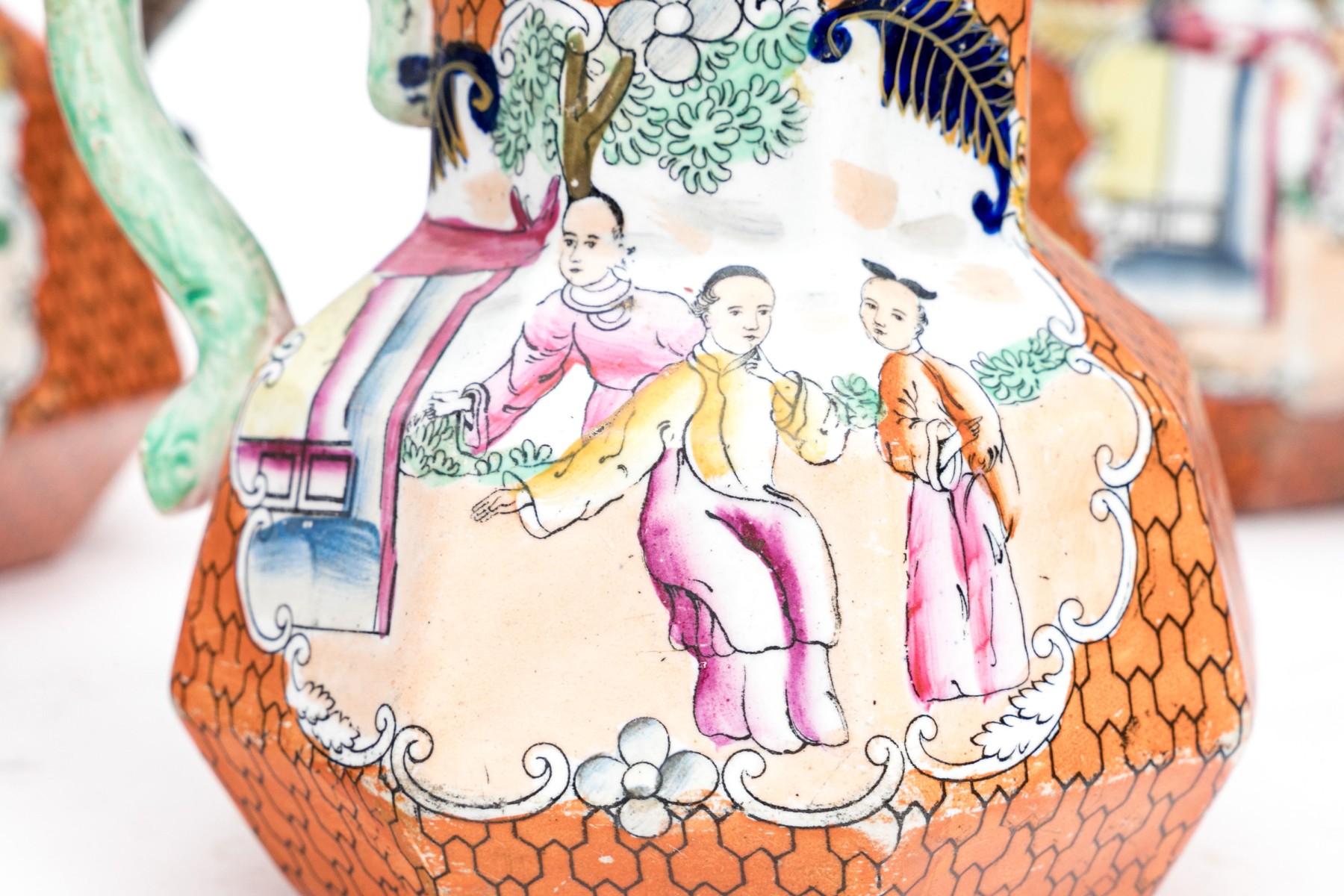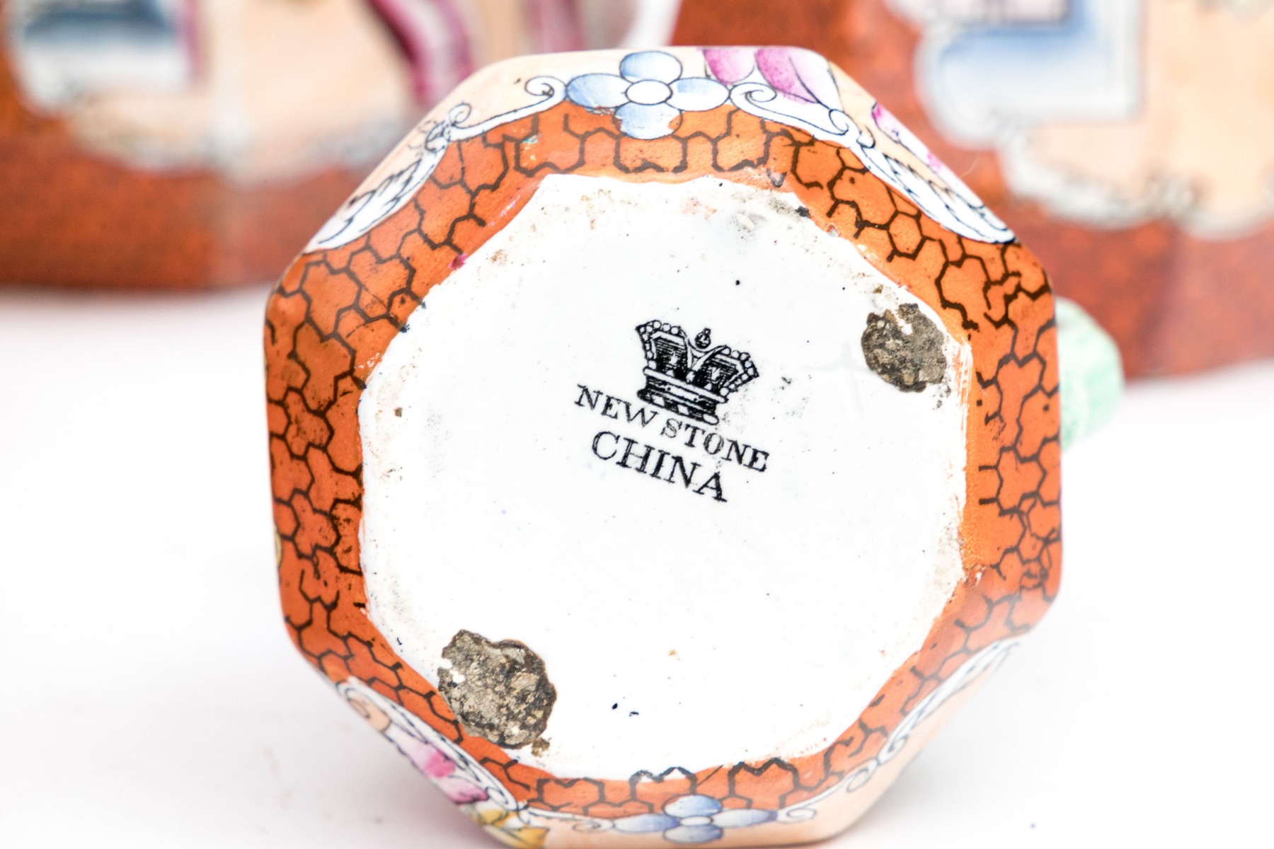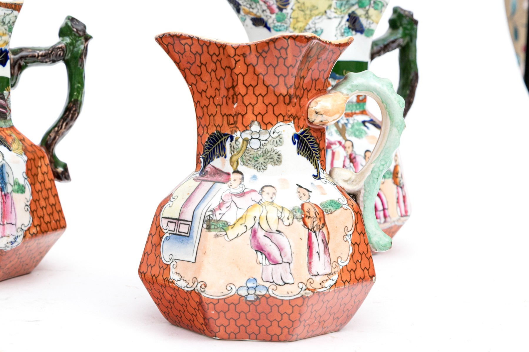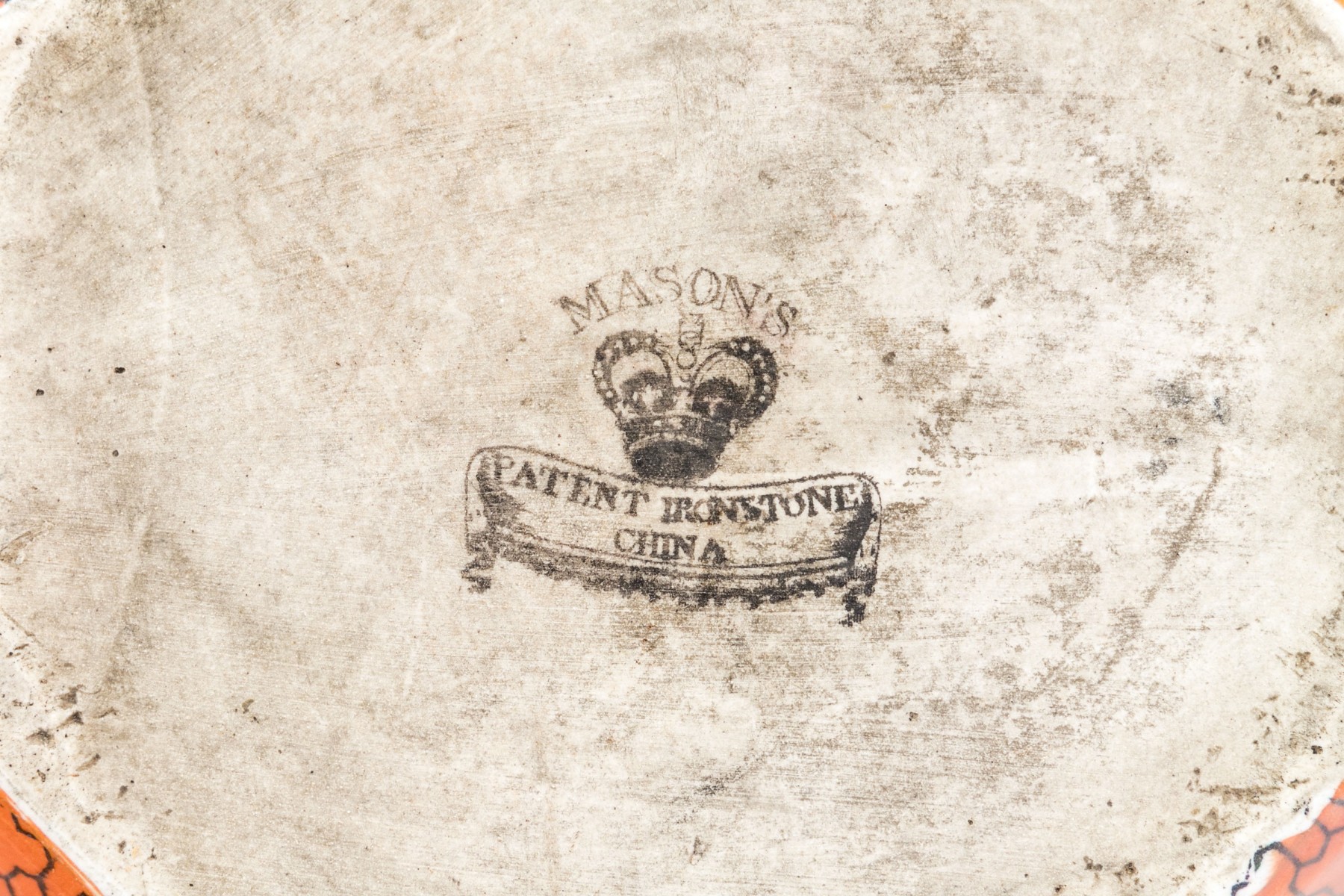 Marked Mason's Patent Ironstone China underfoot with a crown. Each of varied size and slight variations to the decorative motifs but all present charmingly. Dimensions: Largest: 8 1/2 H x 7 3/4 L x 7 1/2 W // Smallest: 3 7/8 H x 3 3/4 L x 3 1/4 W