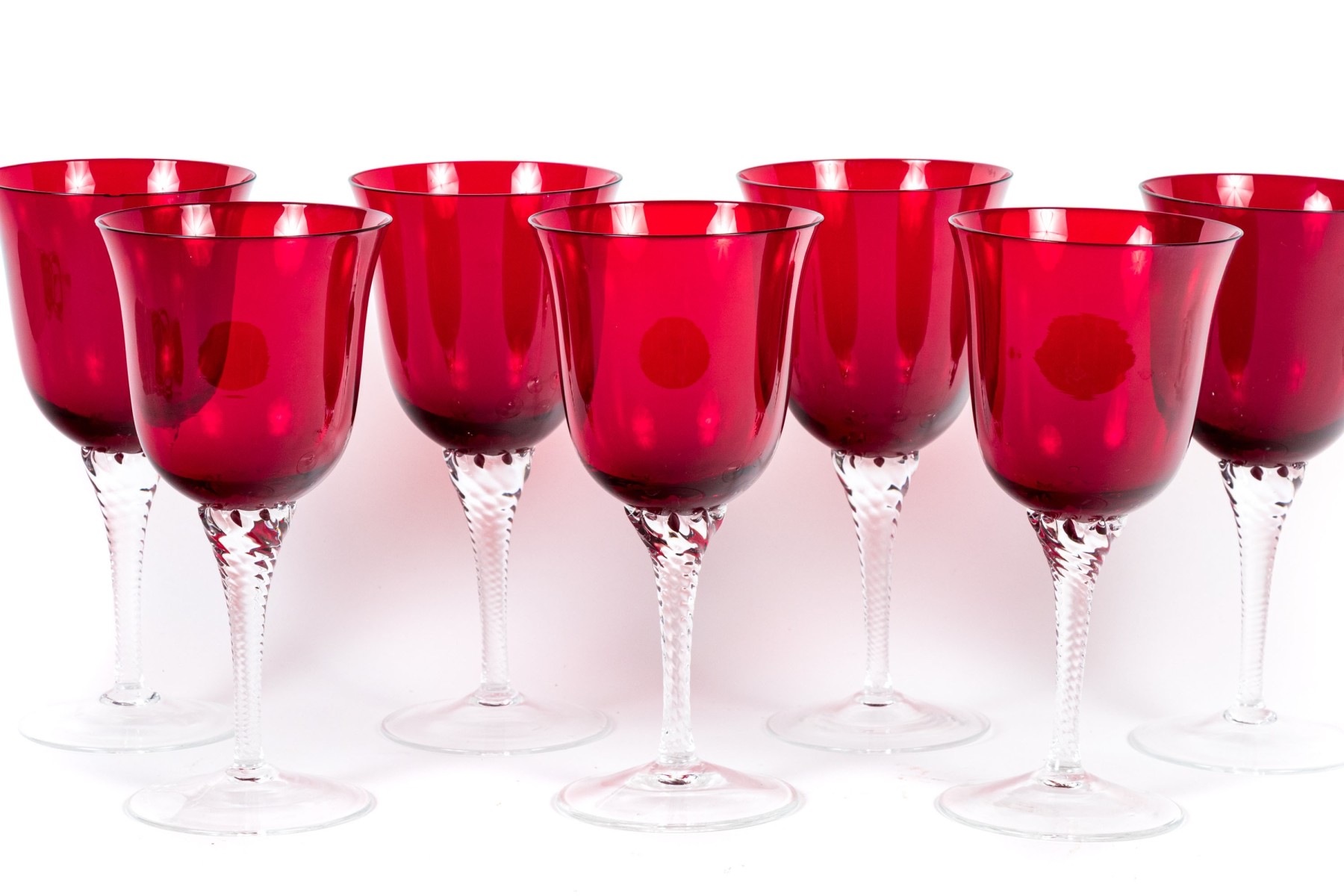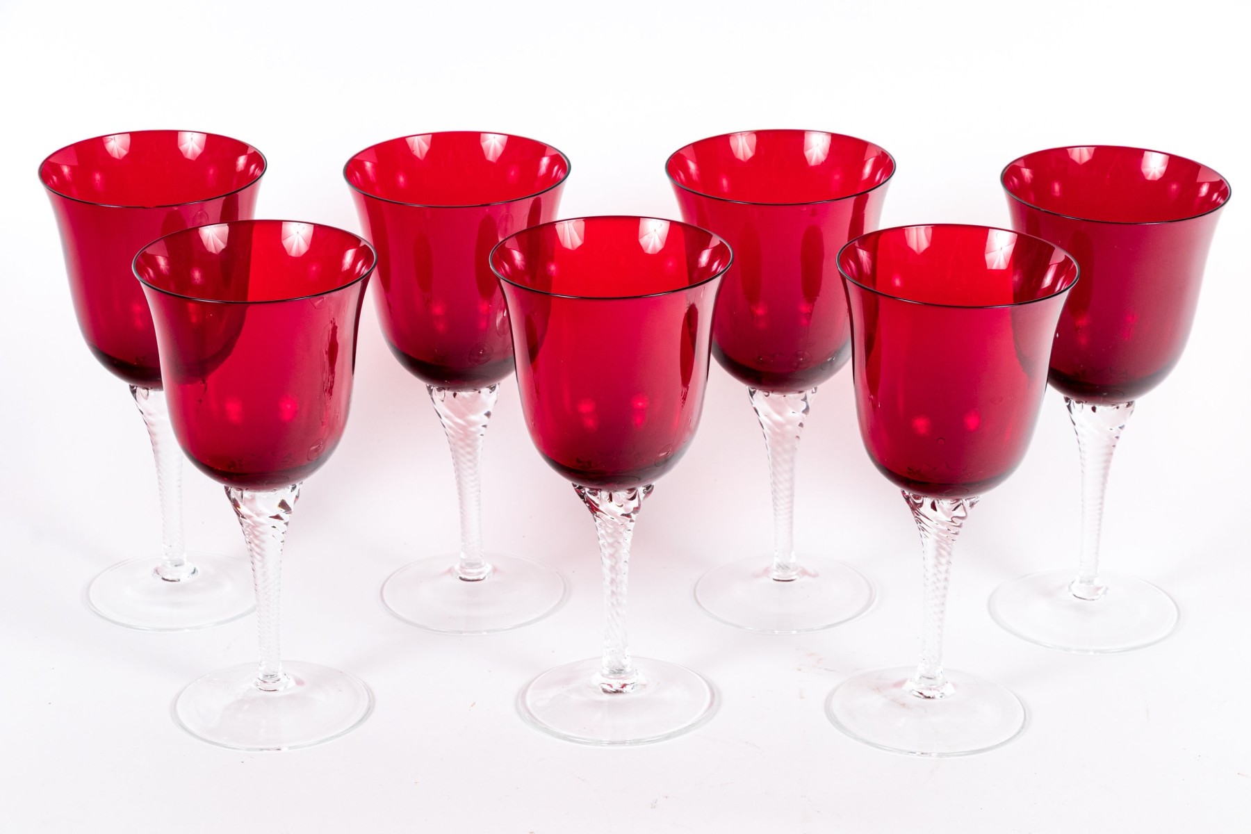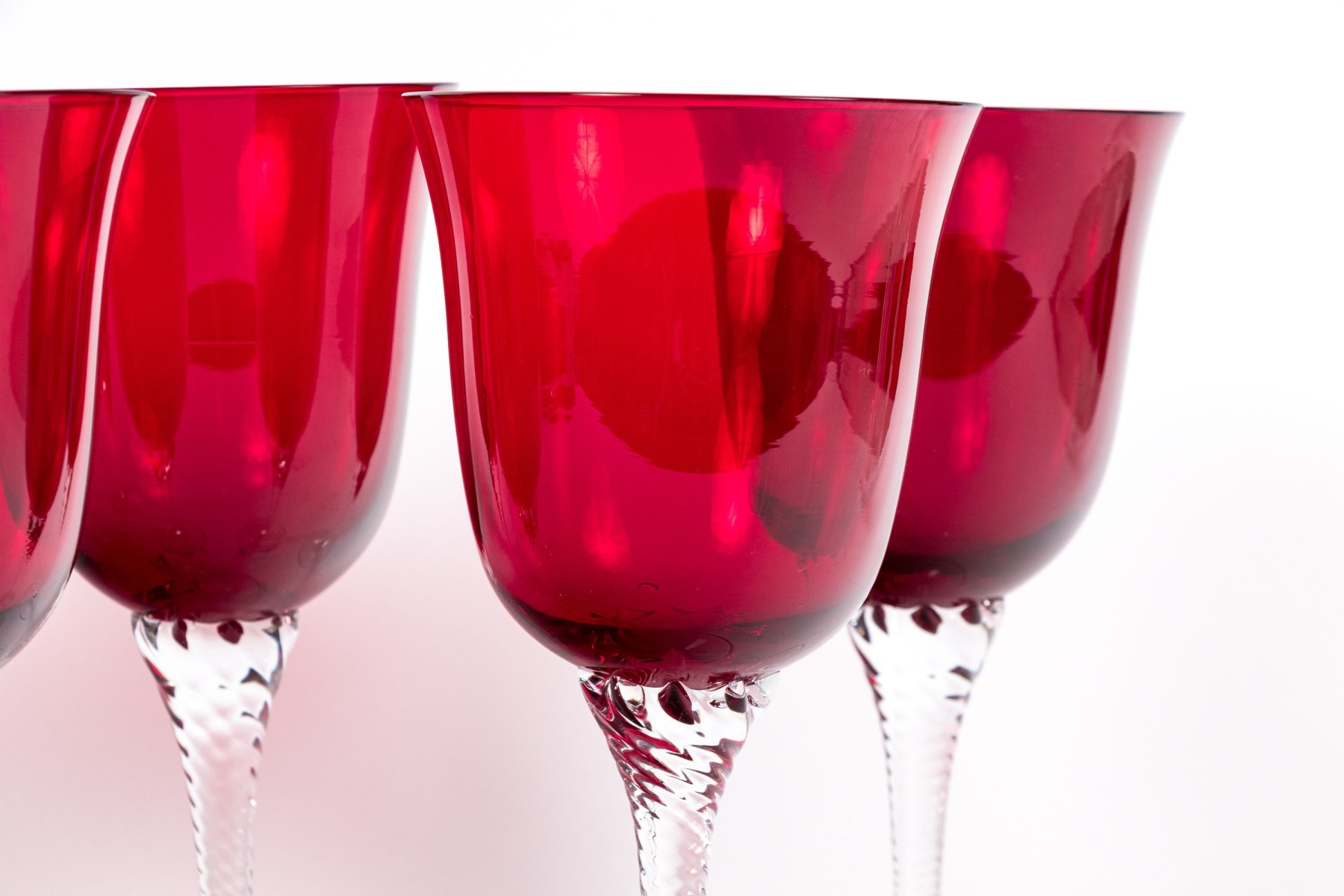 A handsome set of hand-blown glass goblets each on wonderfully ornate stems with swirled motif with vibrant ruby red bell form crystal bowls designed with flared rims. Apparently unmarked.