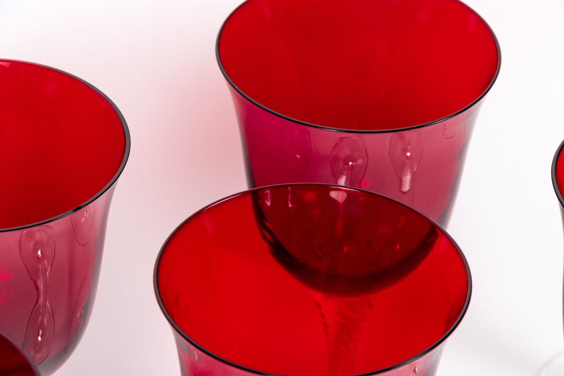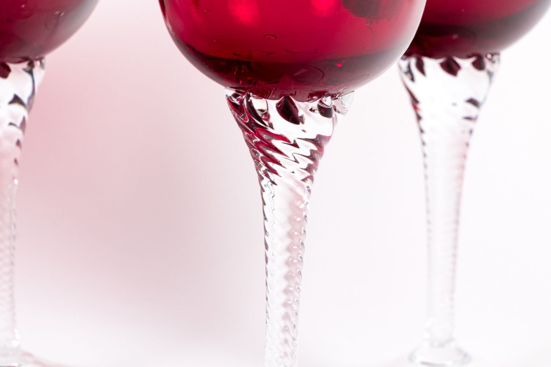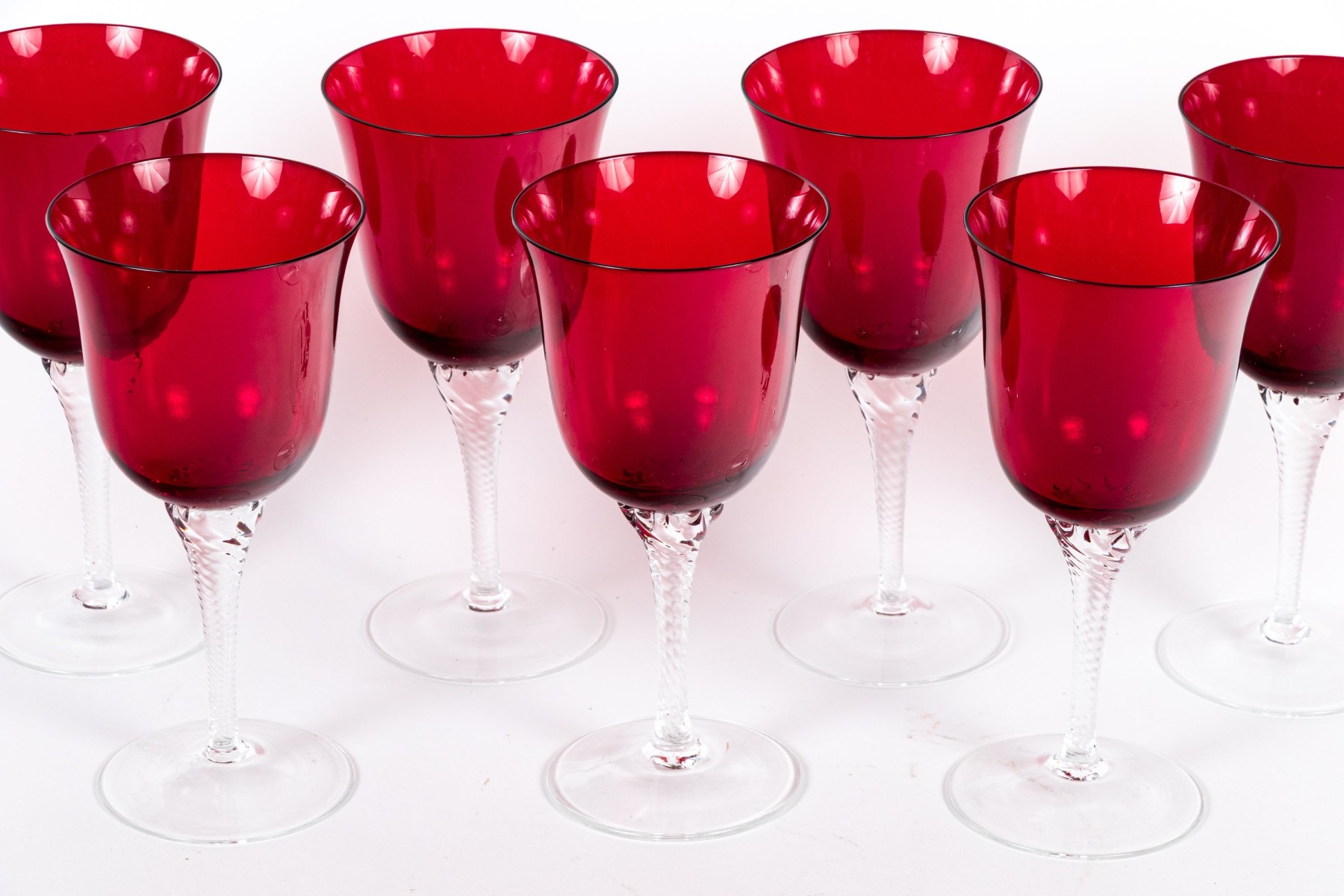 A handsome set of hand-blown glass goblets each on wonderfully ornate stems with swirled motif with vibrant ruby red bell form crystal bowls designed with flared rims. Apparently unmarked.