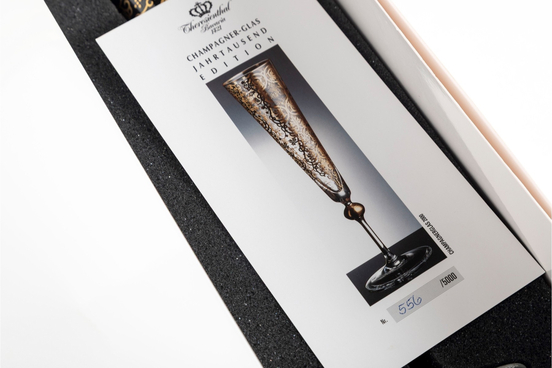 A complete set of seven Theresienthal "Master Glass of the Millennium" edition glasses, released in 1998 to mark the turn of the millennium. Each glass is handblown and individually tinted in a different luminous hue, showcasing the craftsmanship of Bavarian glassworks.