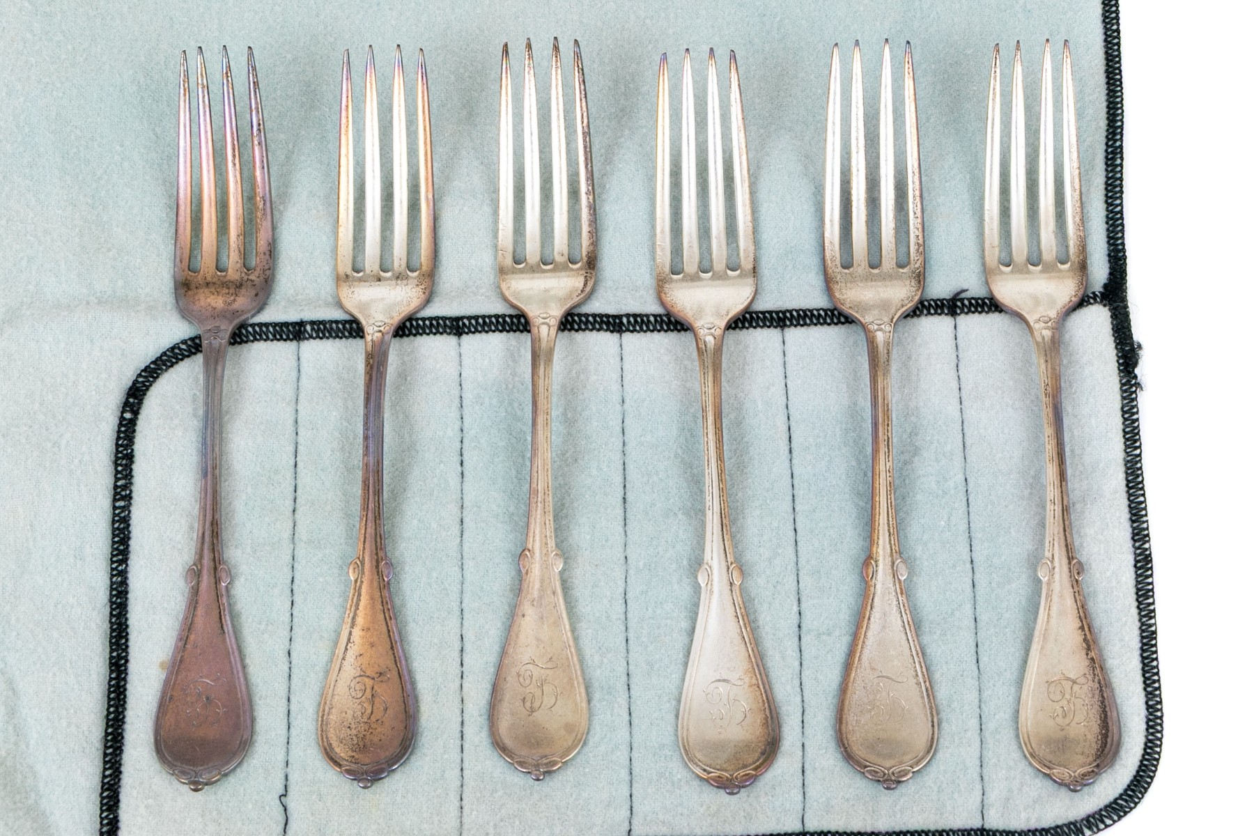 A wonderful collection of six antique sterling silver forks with gently tapered and rounded handles with dainty scrolled accents at the lower waists and handle crests. Monogrammed on the handles and marked on the stems.