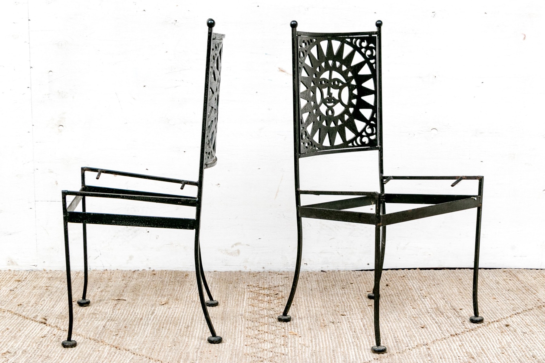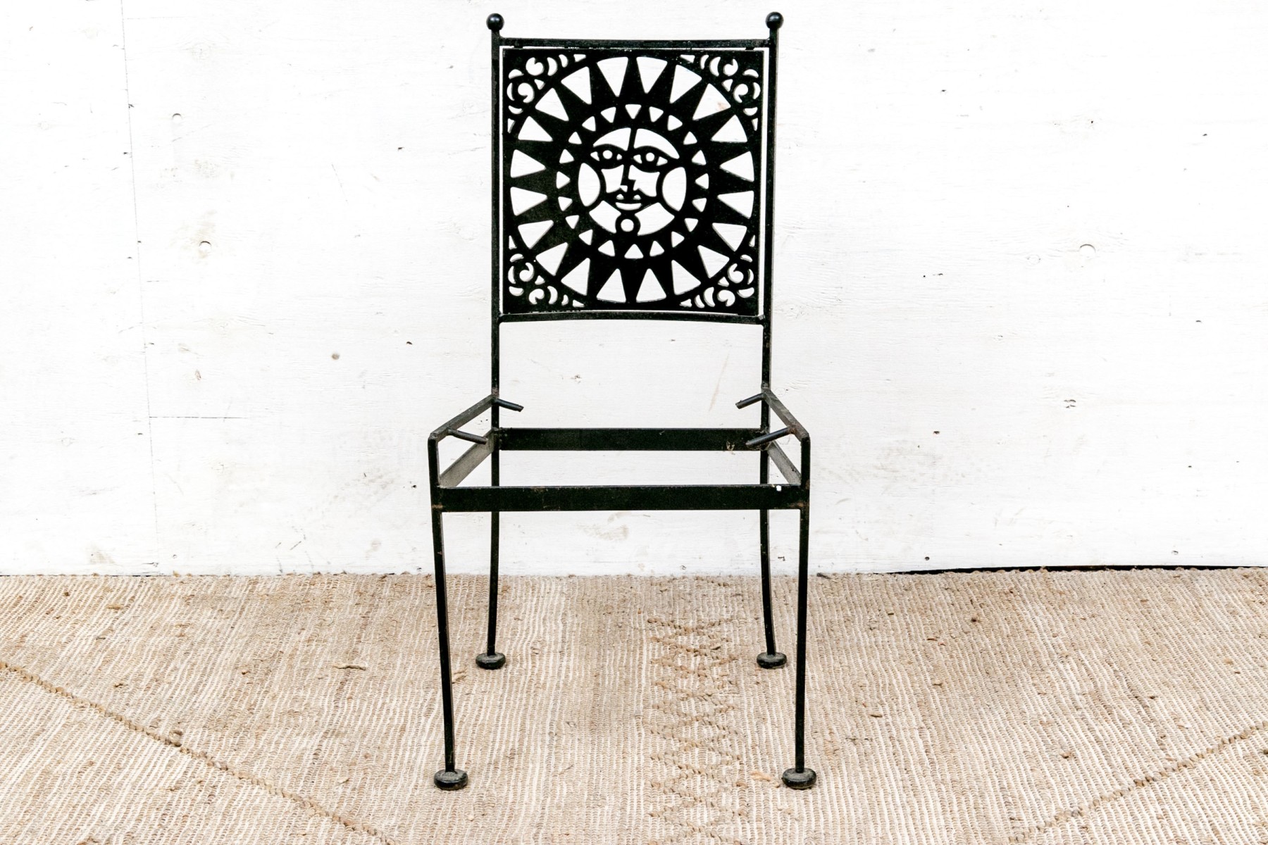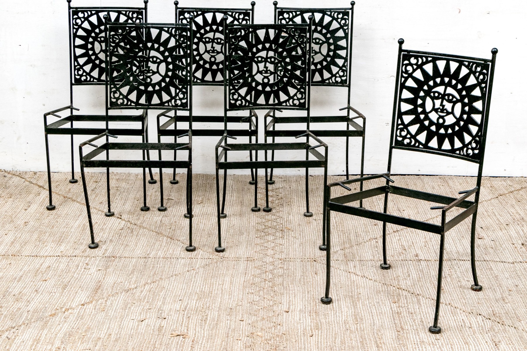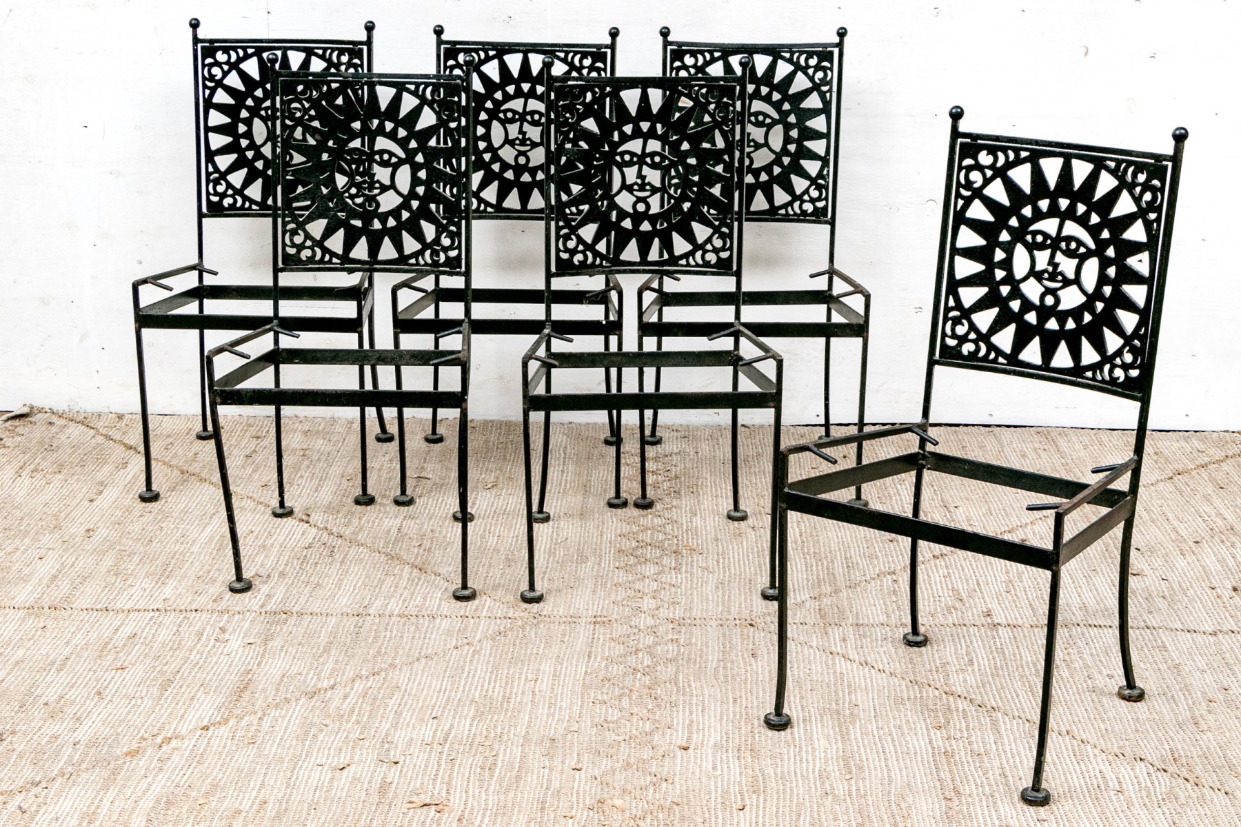 A delightful set of six Arthur Umanoff mid-century chair frames in black finished iron, showcasing eye-catching, pierced Mayan sun motifs along the backs with spherical finals over minimalist dowel posts and legs. Beautifully designed and finely crafted with sleek forms and traditional motifs making for a very stylish aesthetic.