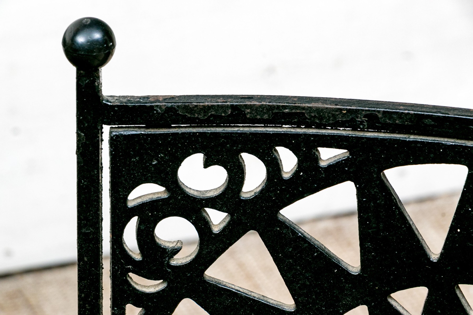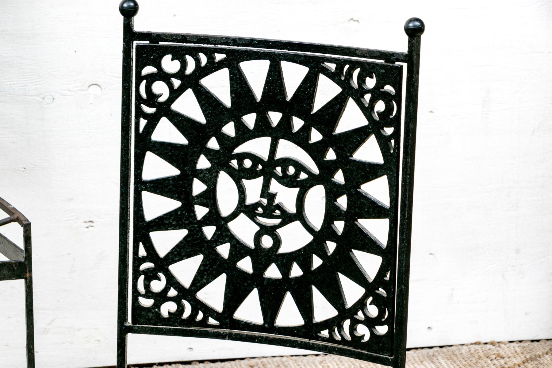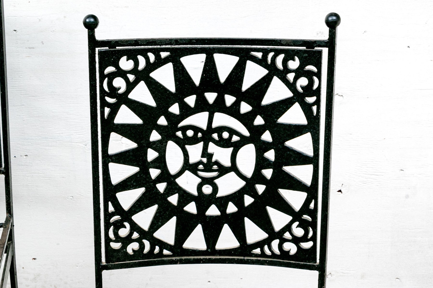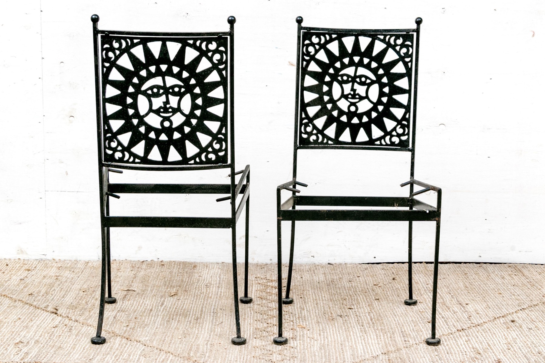 A delightful set of six Arthur Umanoff mid-century chair frames in black finished iron, showcasing eye-catching, pierced Mayan sun motifs along the backs with spherical finals over minimalist dowel posts and legs. Beautifully designed and finely crafted with sleek forms and traditional motifs making for a very stylish aesthetic.
