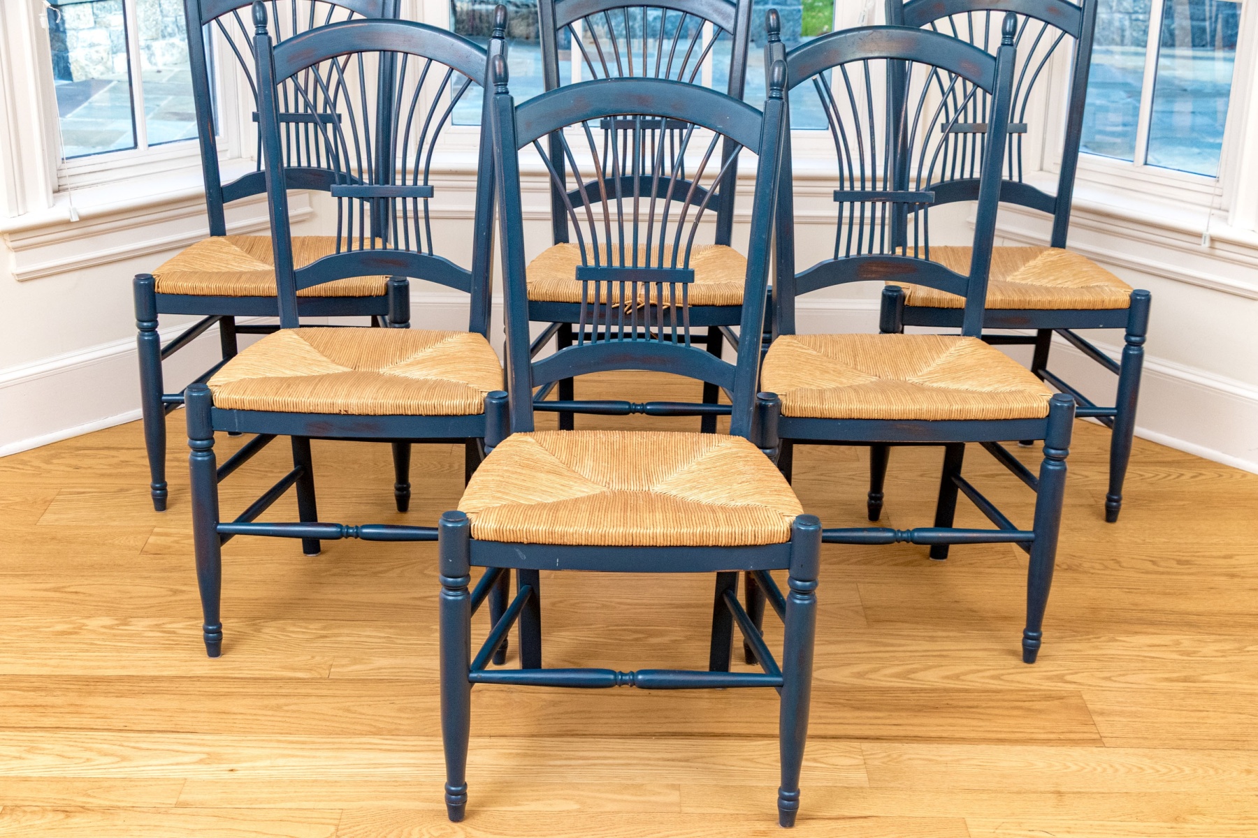 A fabulous set of six side dining chairs with great French country and farmhouse chic appeal, designed with dark blue painted frames sporting arched top rails, wheat sheaf or harp motif splats, and natural woven rush seats adding a wonderful pop of honeyed brown color for contrast. Raised on simply turned and tapered legs with box stretchers.