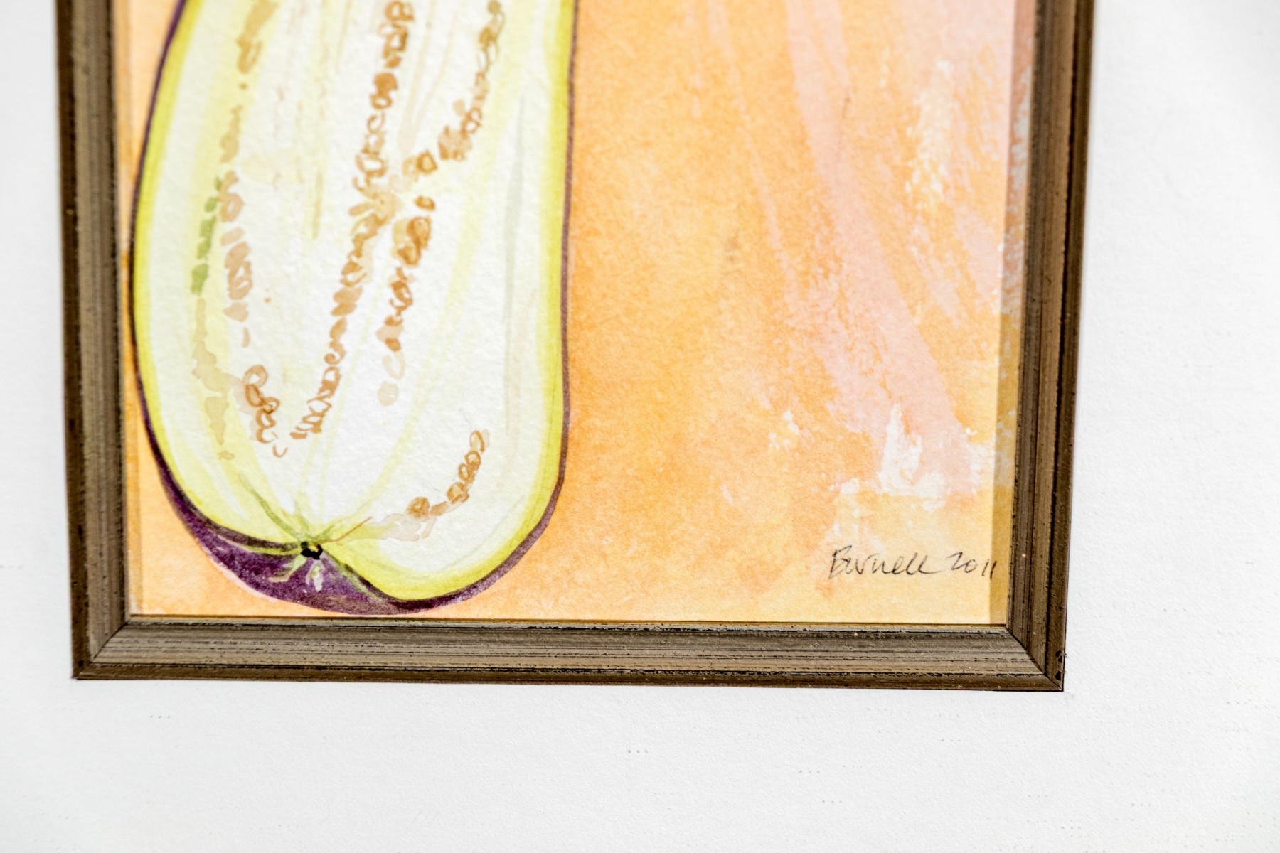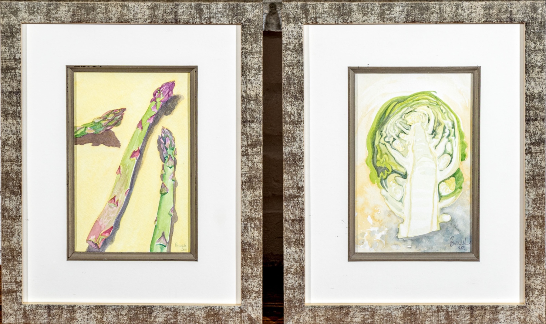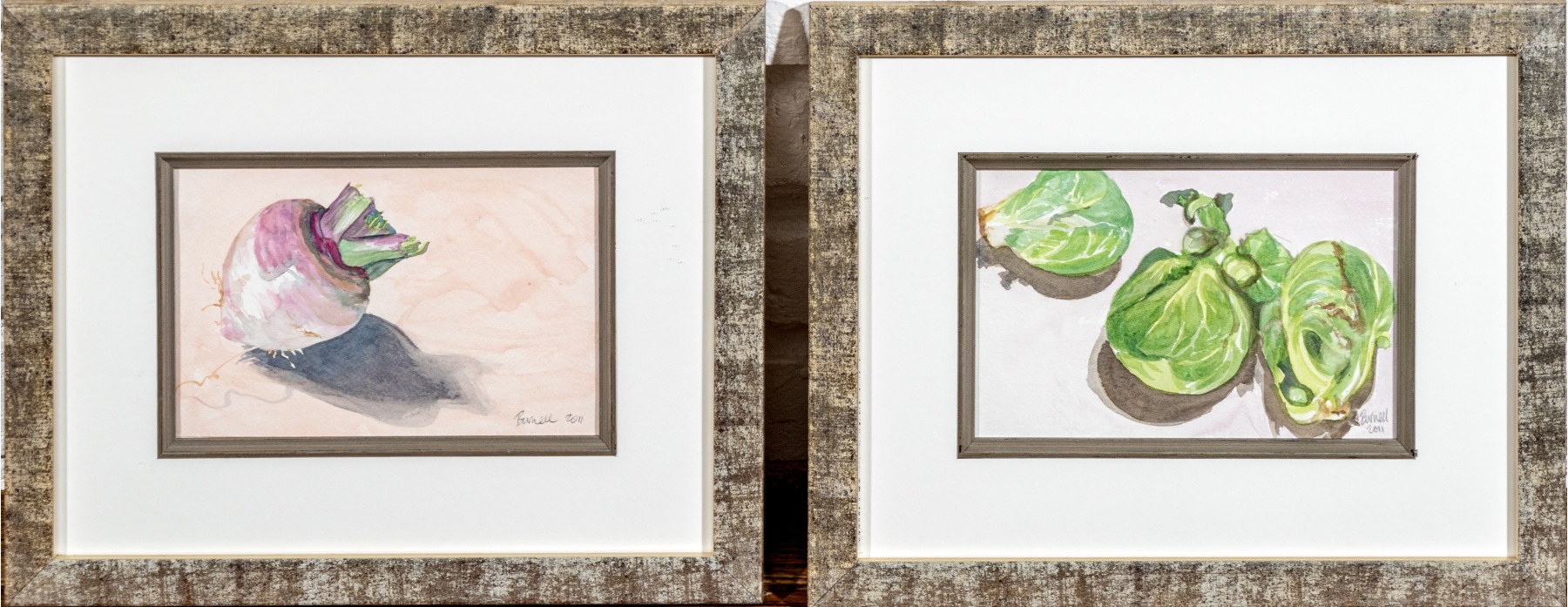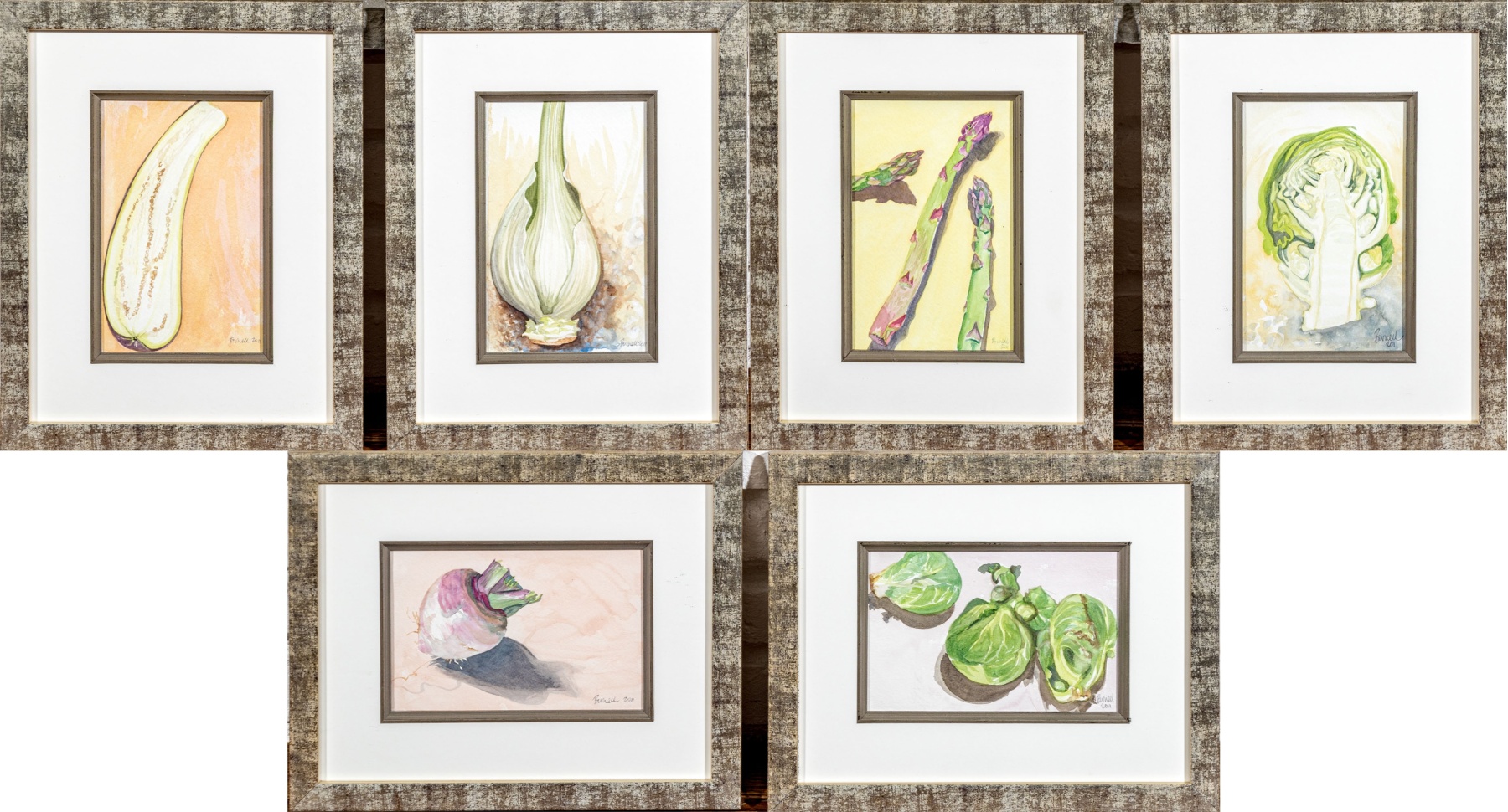 A fabulous collection of six watercolor paintings on paper depicting various vegetables in rich detail and vibrant color including an eggplant, squash, asparagus, brussels sprout, turnip, and cabbage. Each pencil signed Burnell and dated 2011 lower right.