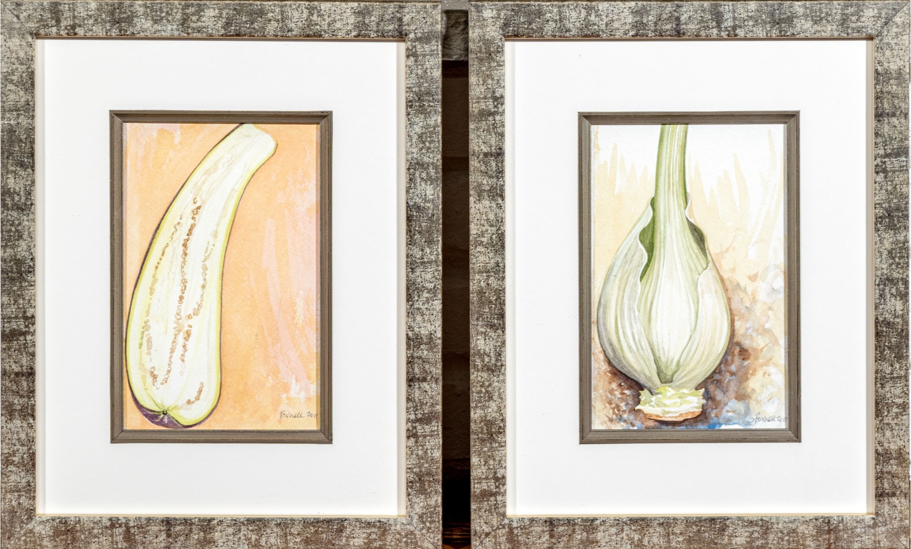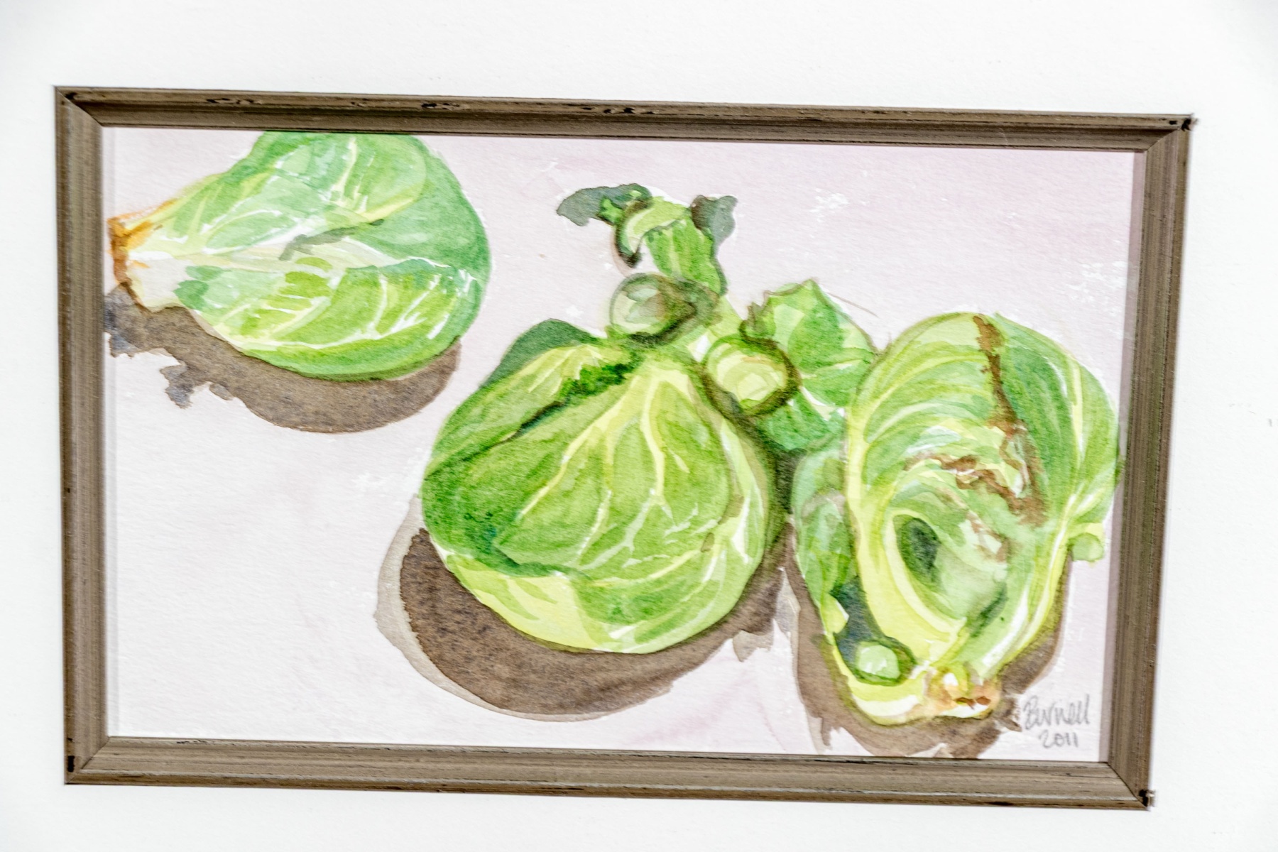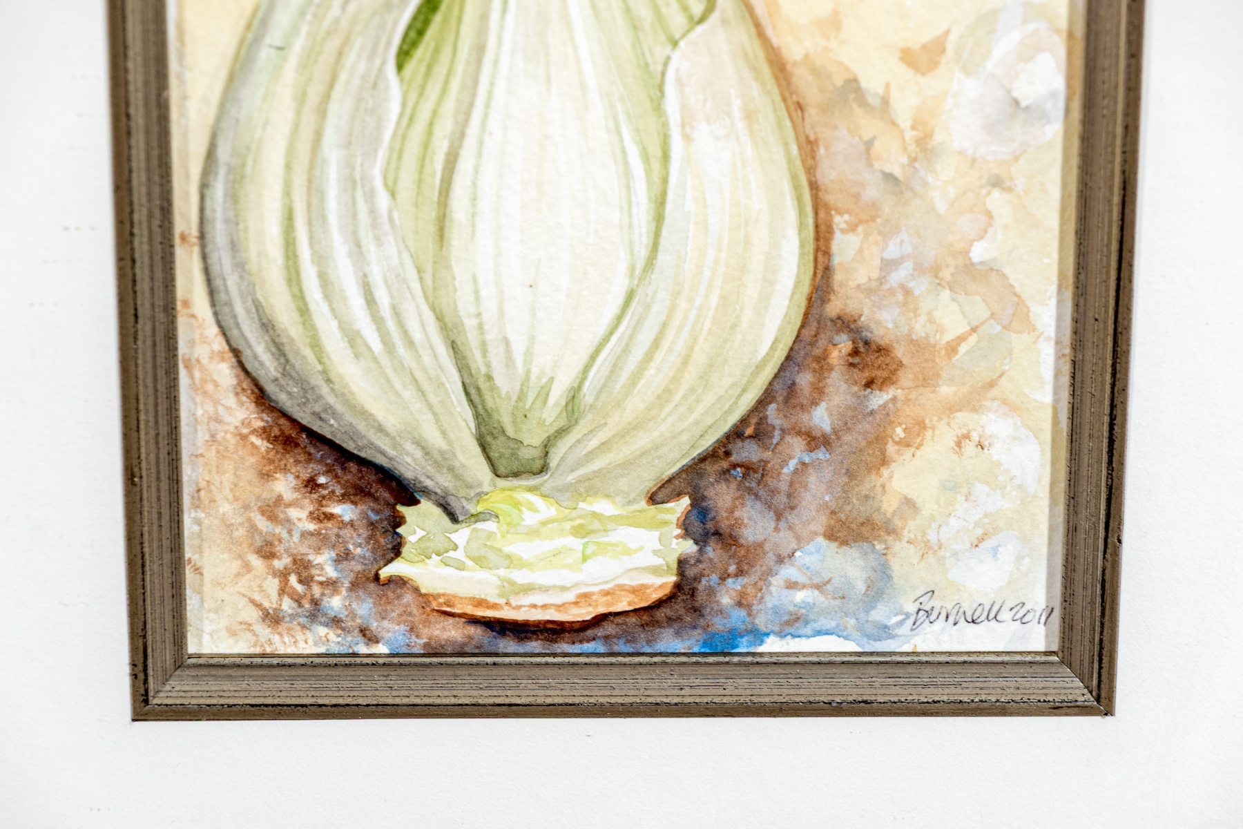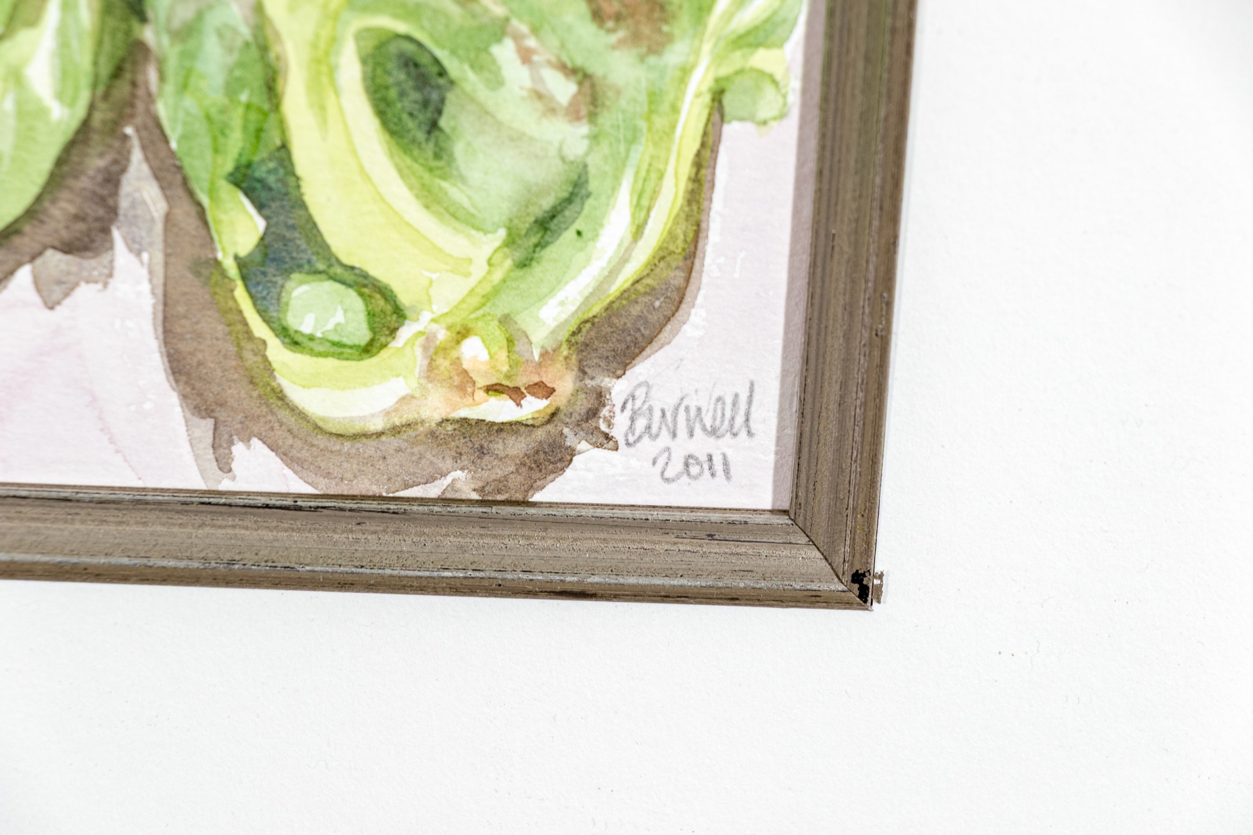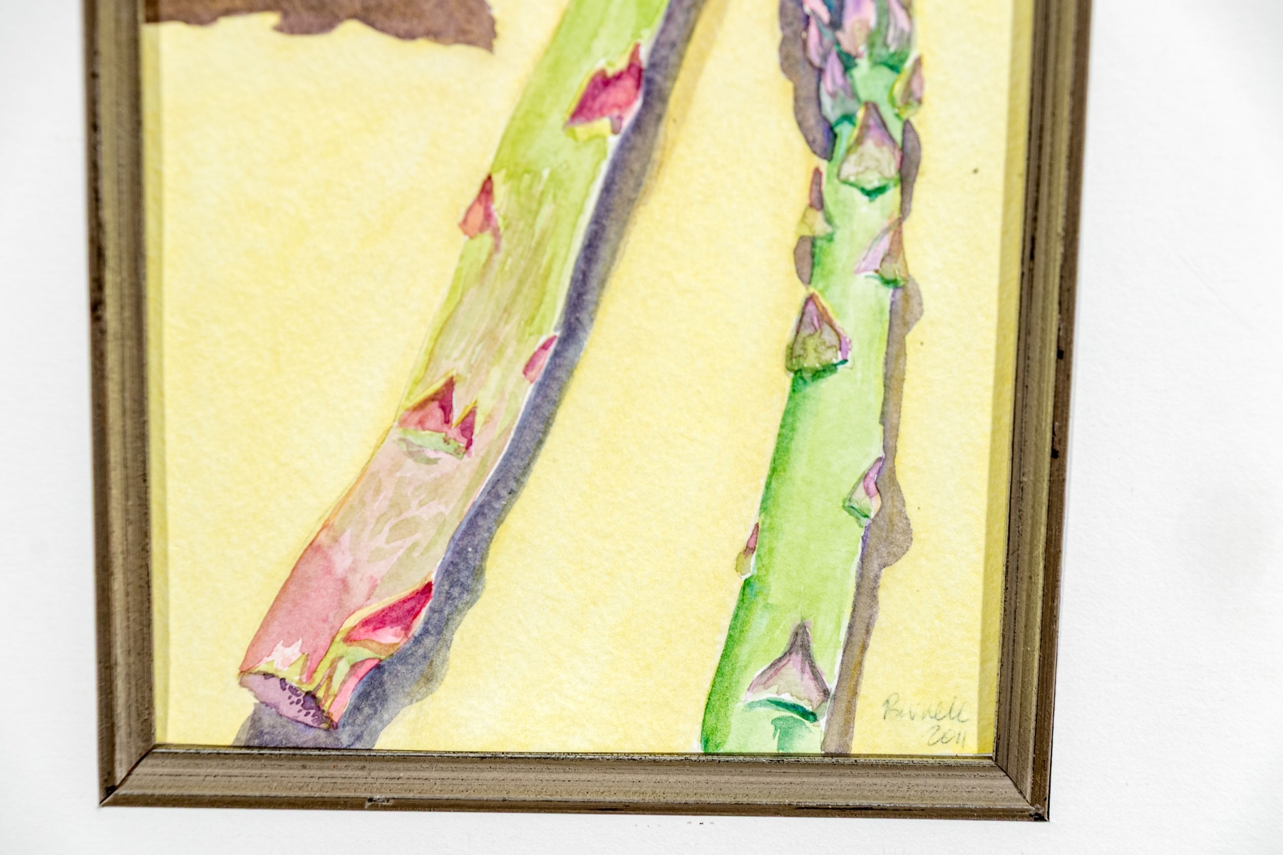 A fabulous collection of six watercolor paintings on paper depicting various vegetables in rich detail and vibrant color including an eggplant, squash, asparagus, brussels sprout, turnip, and cabbage. Each pencil signed Burnell and dated 2011 lower right.