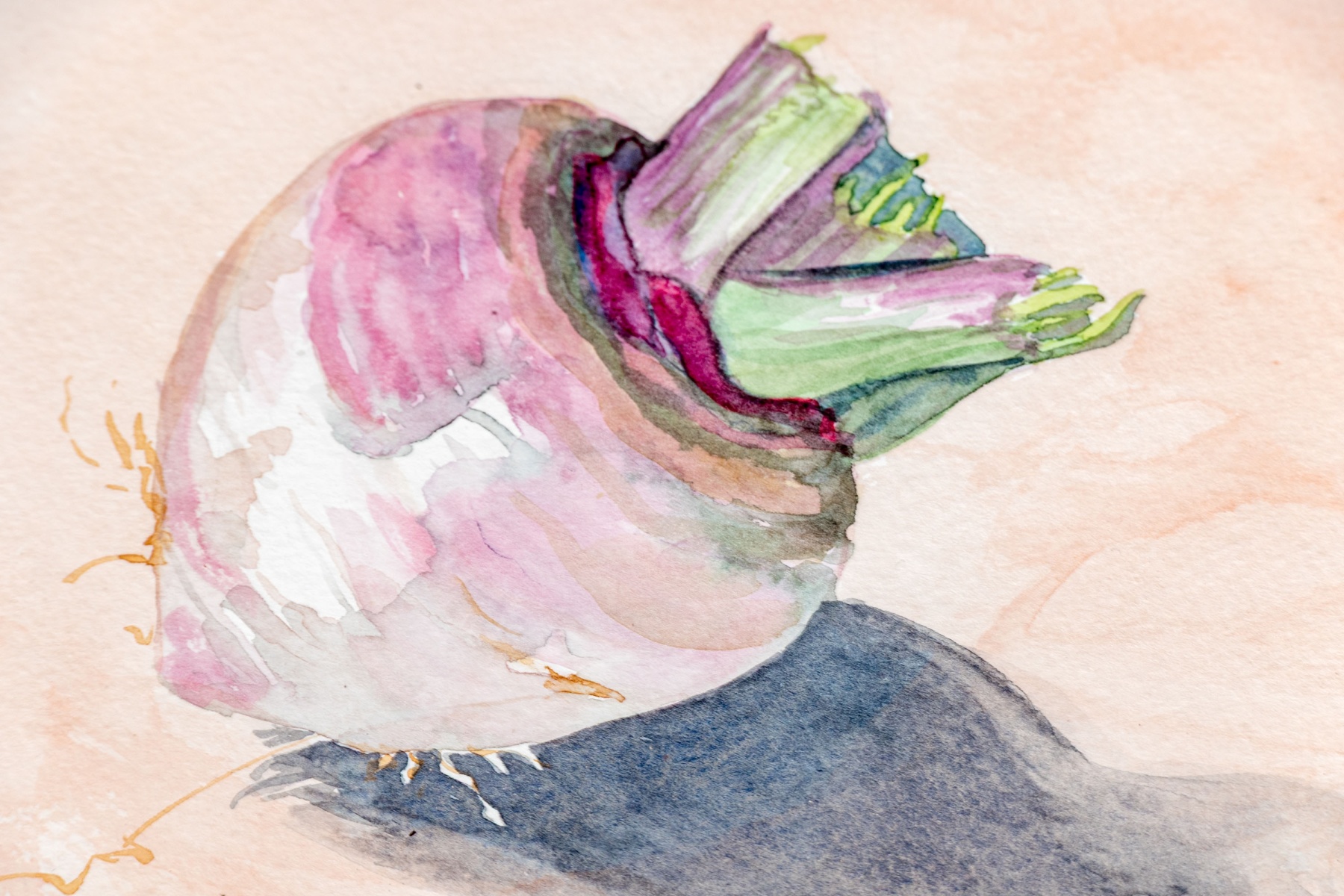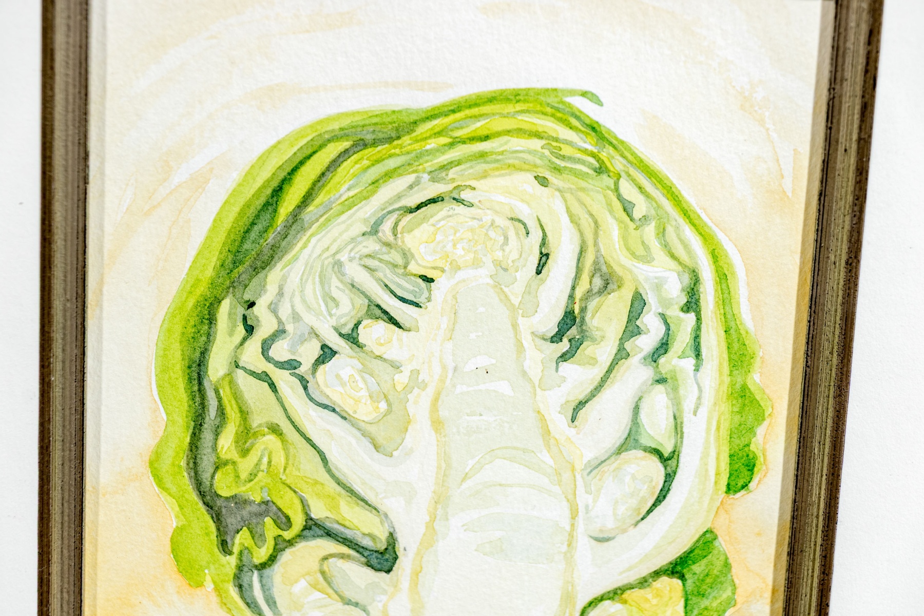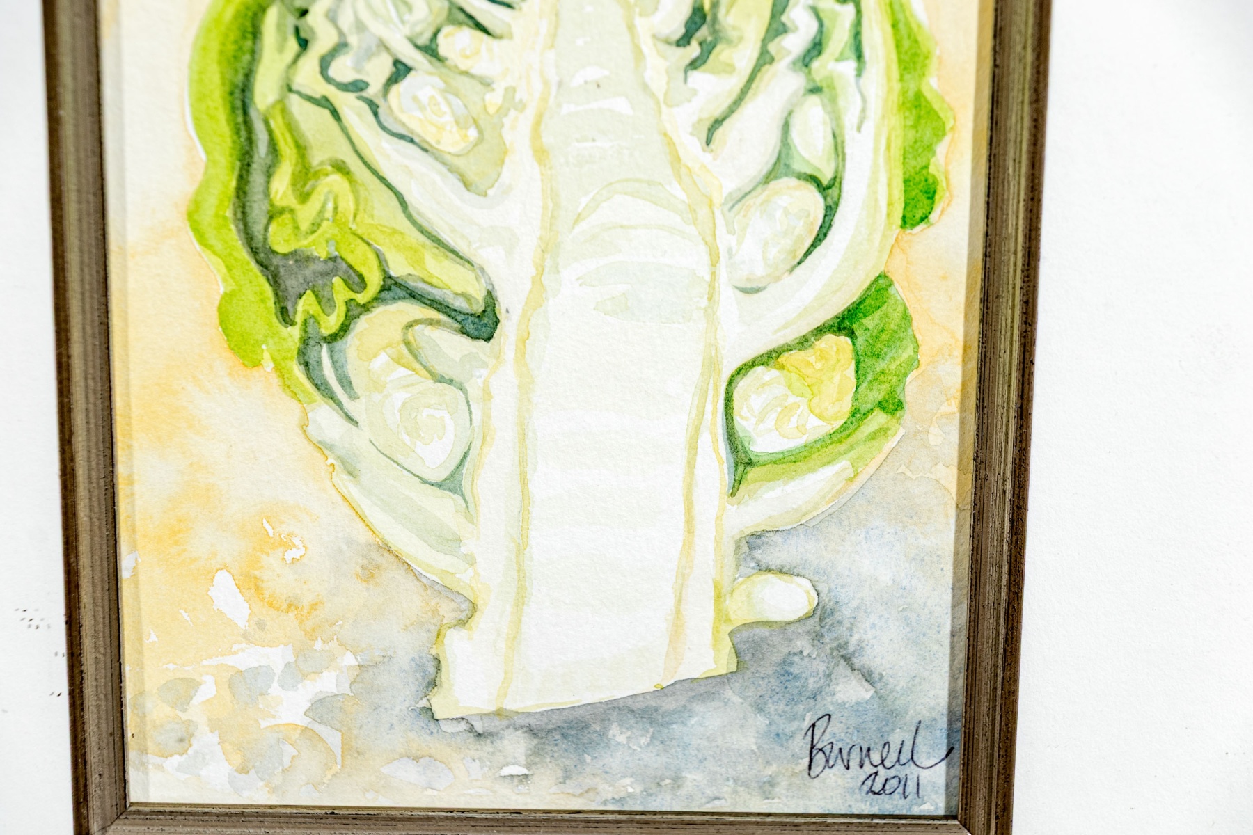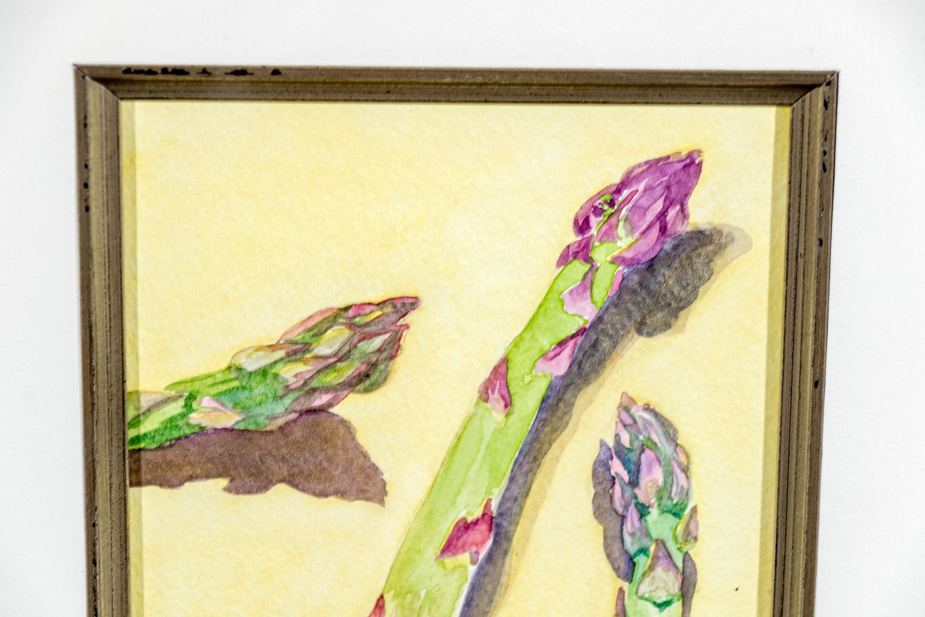 A fabulous collection of six watercolor paintings on paper depicting various vegetables in rich detail and vibrant color including an eggplant, squash, asparagus, brussels sprout, turnip, and cabbage. Each pencil signed Burnell and dated 2011 lower right.