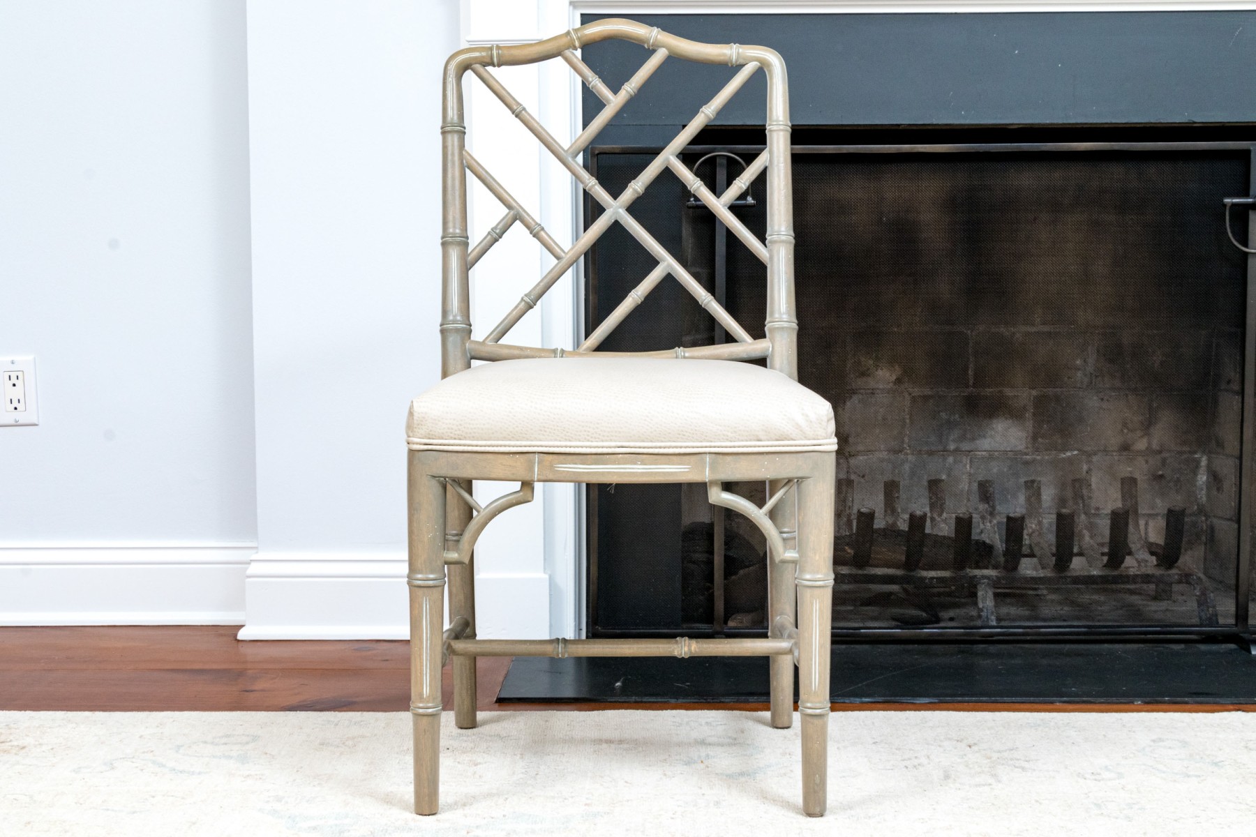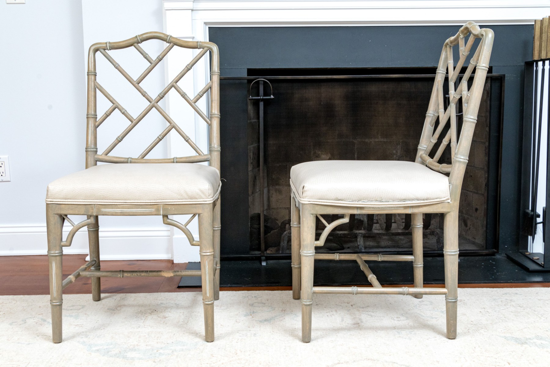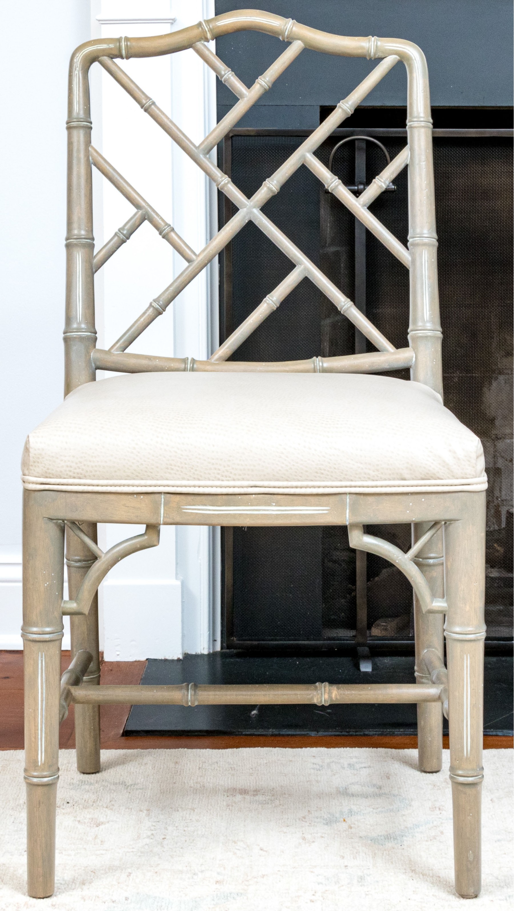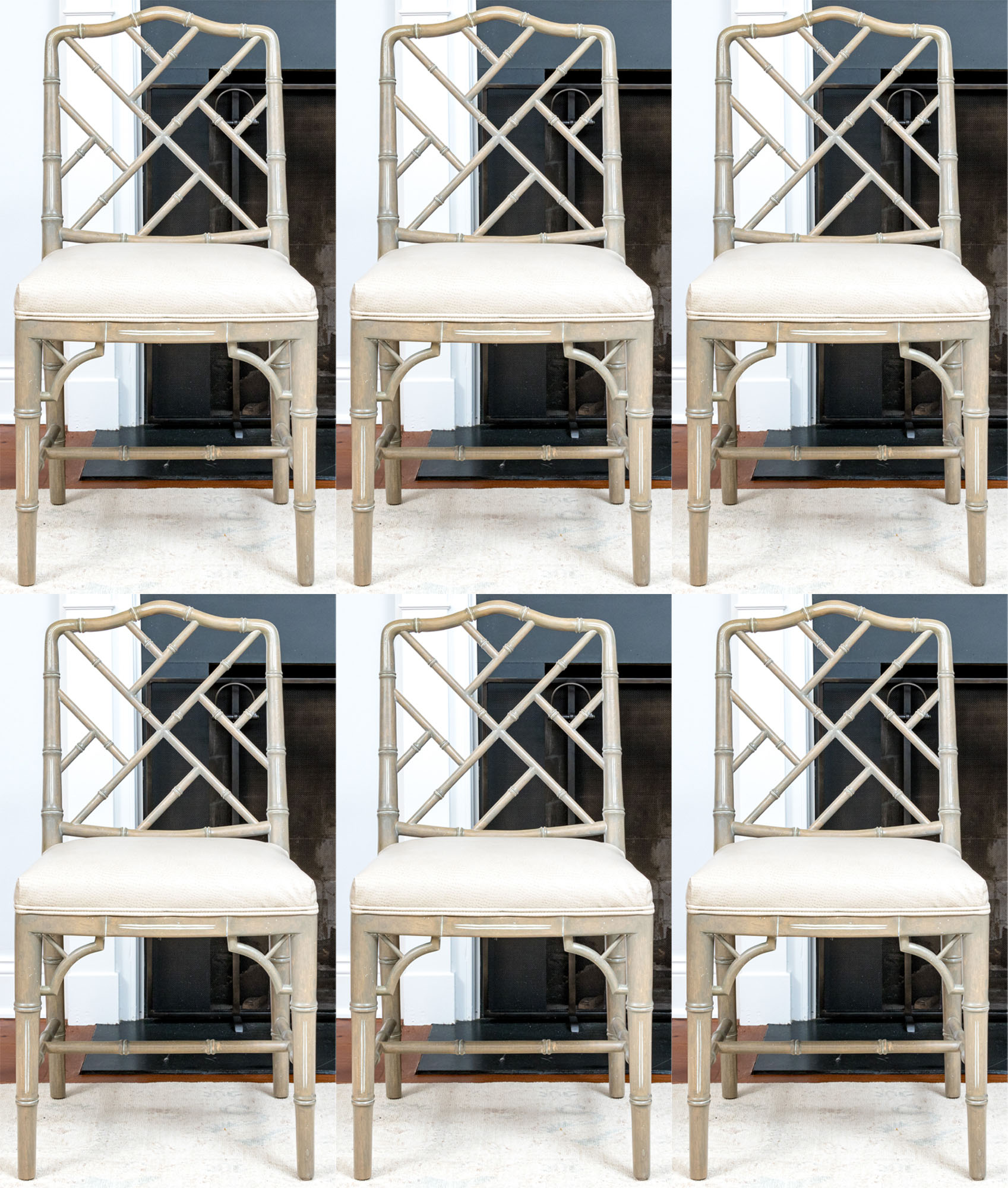 A stylish set of six CR Laine "Betty" Chinese Chippendale style dining side chairs with chic, faux bamboo frames painted in a cream-beige finish.