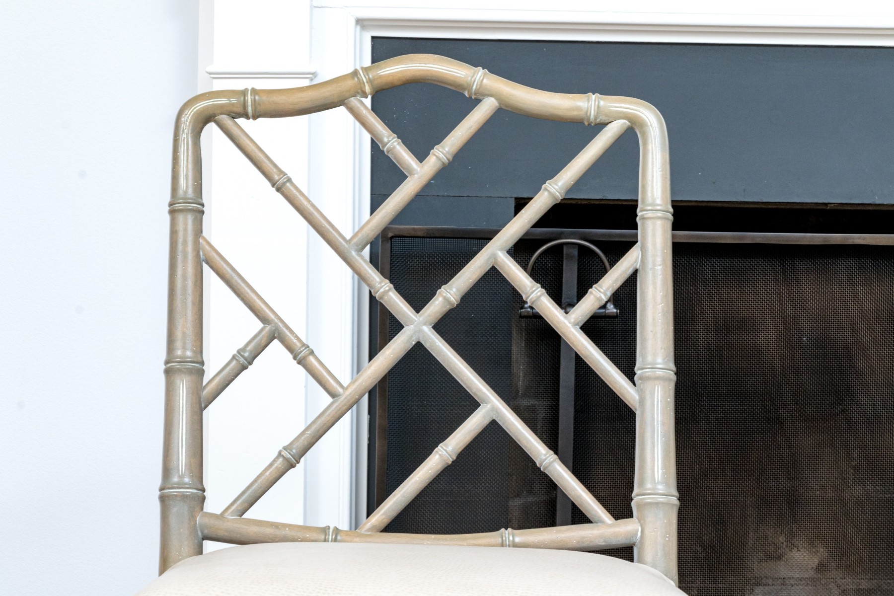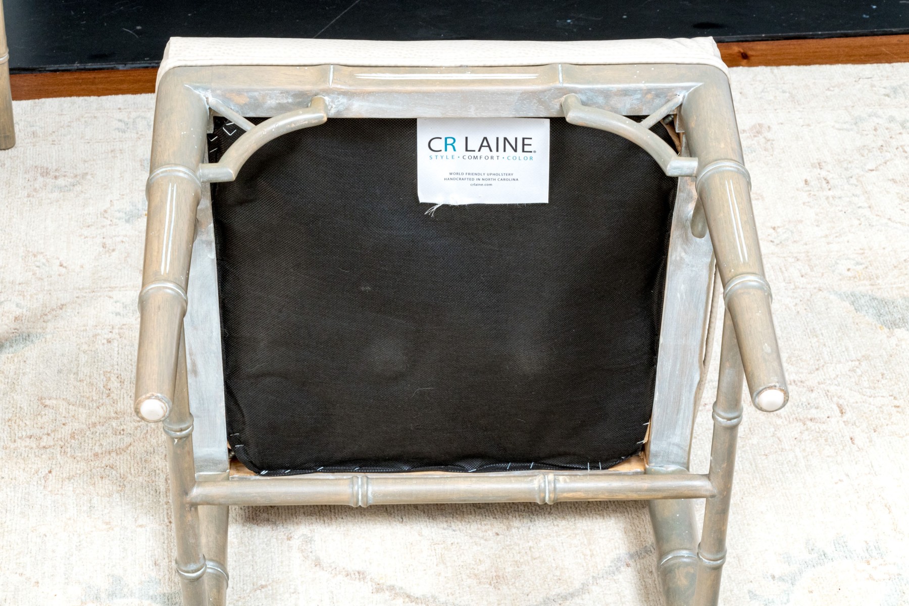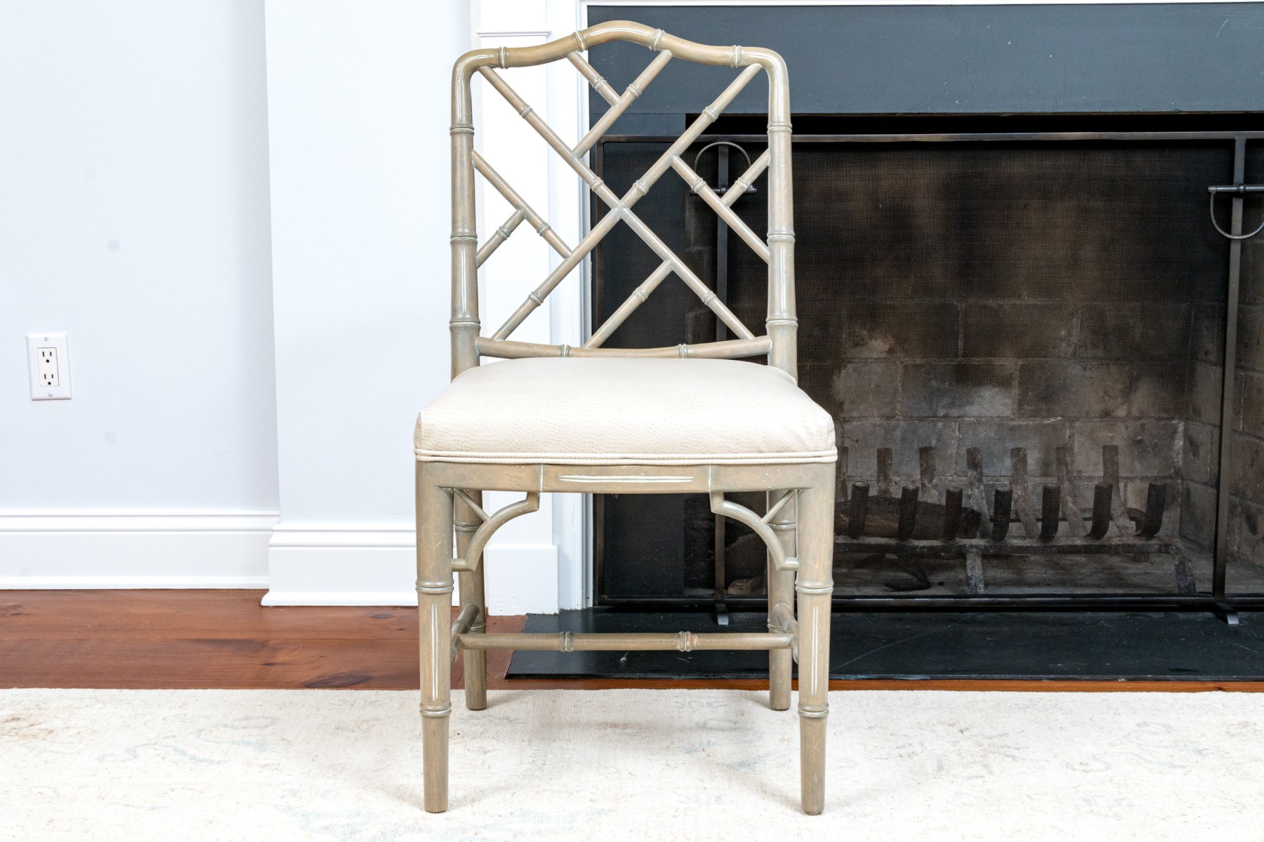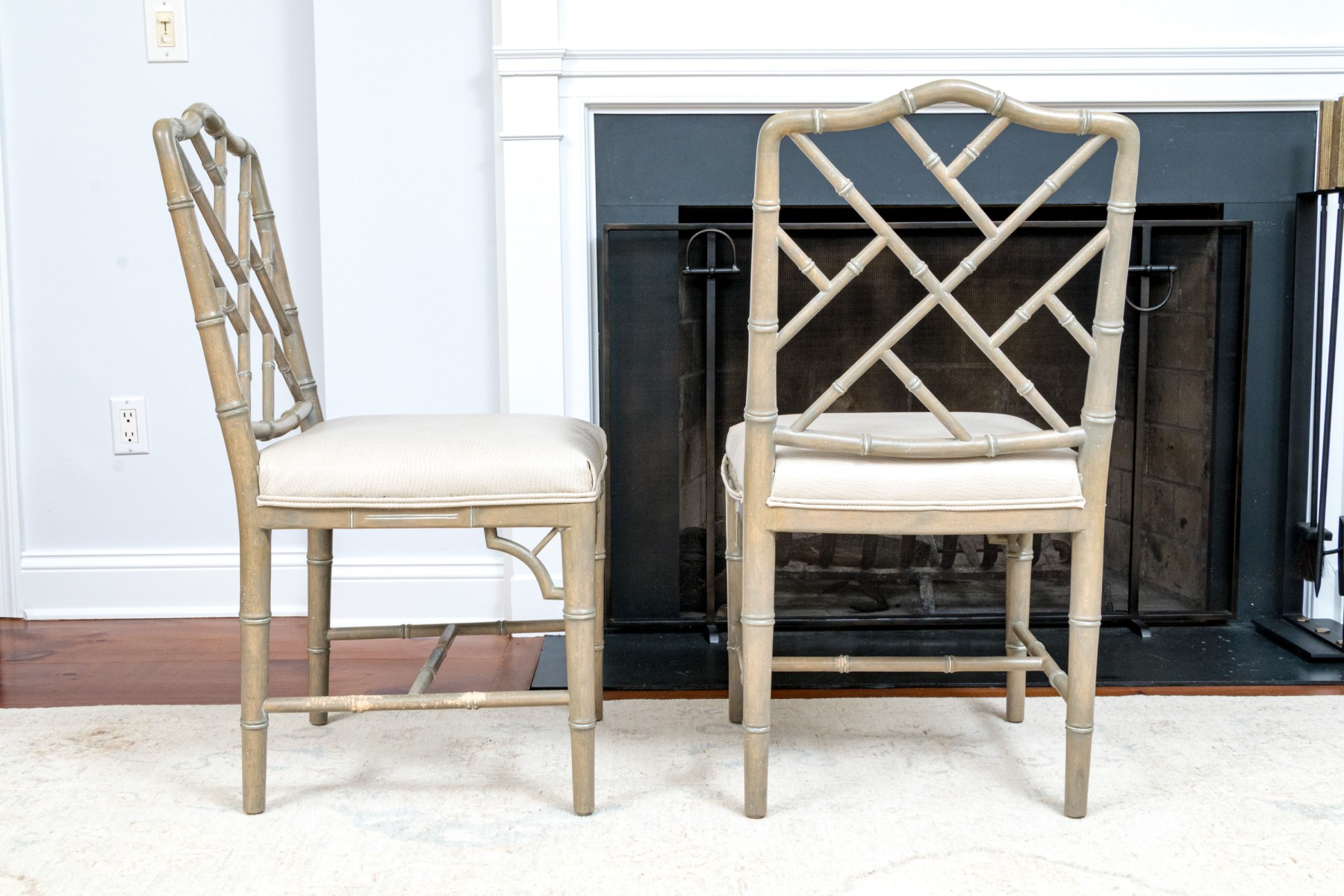 A stylish set of six CR Laine "Betty" Chinese Chippendale style dining side chairs with chic, faux bamboo frames painted in a cream-beige finish.