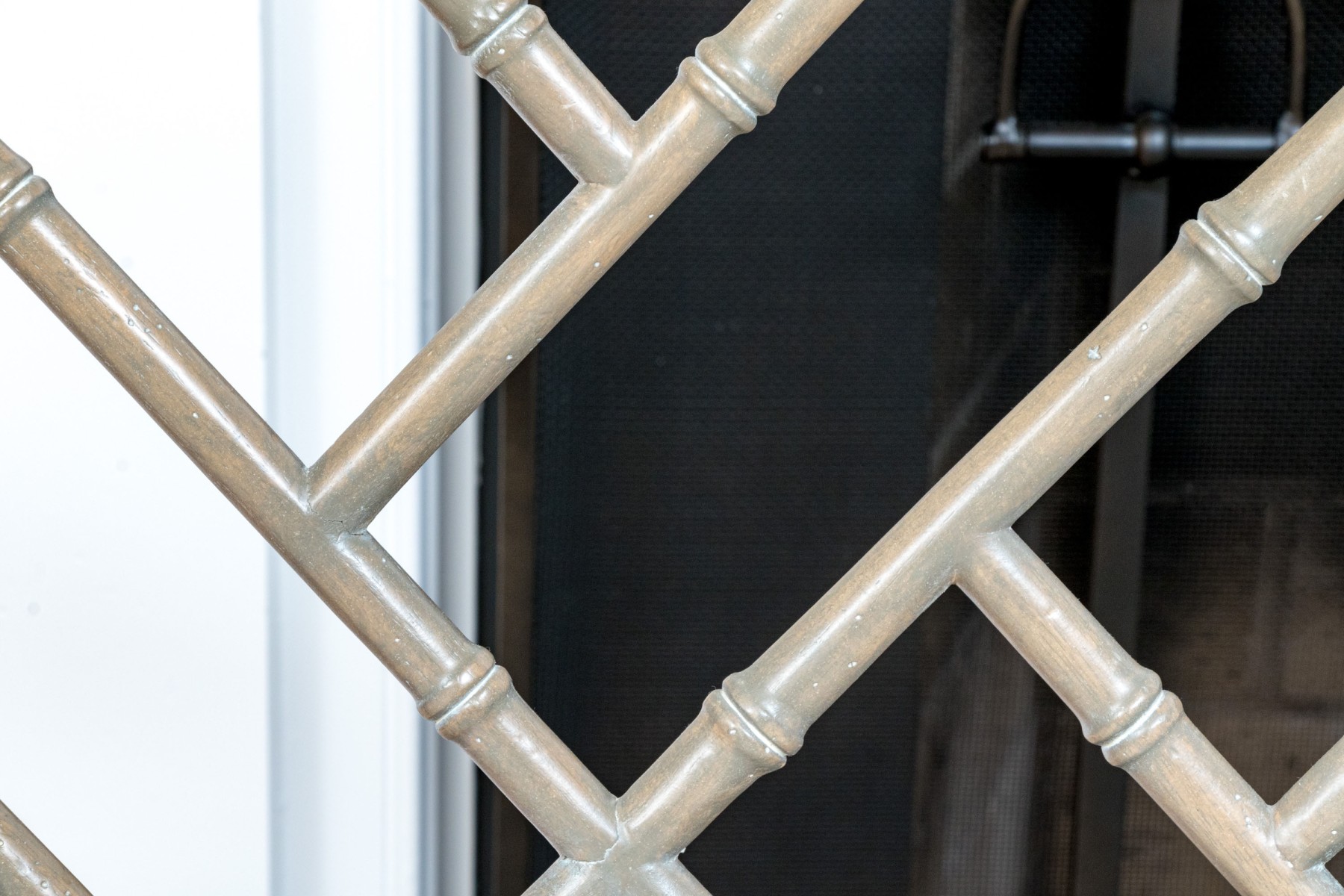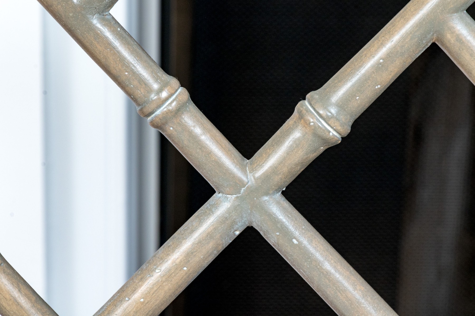 The chairs feature chic camelback form top rails with geometric latticed seat backs.