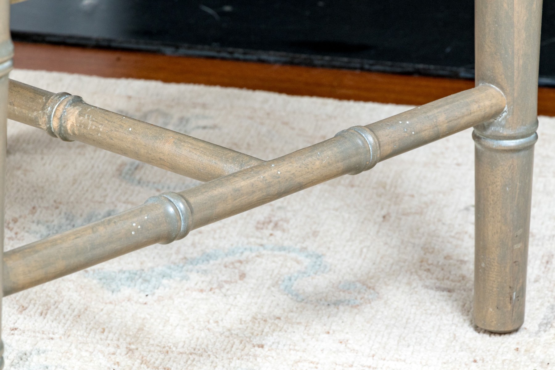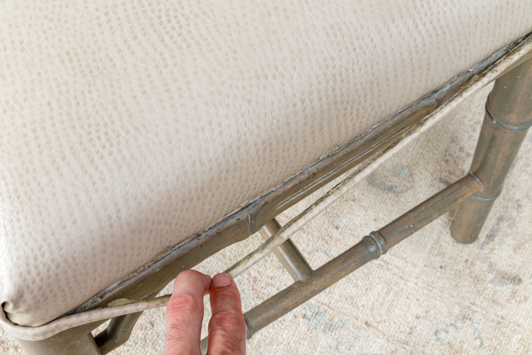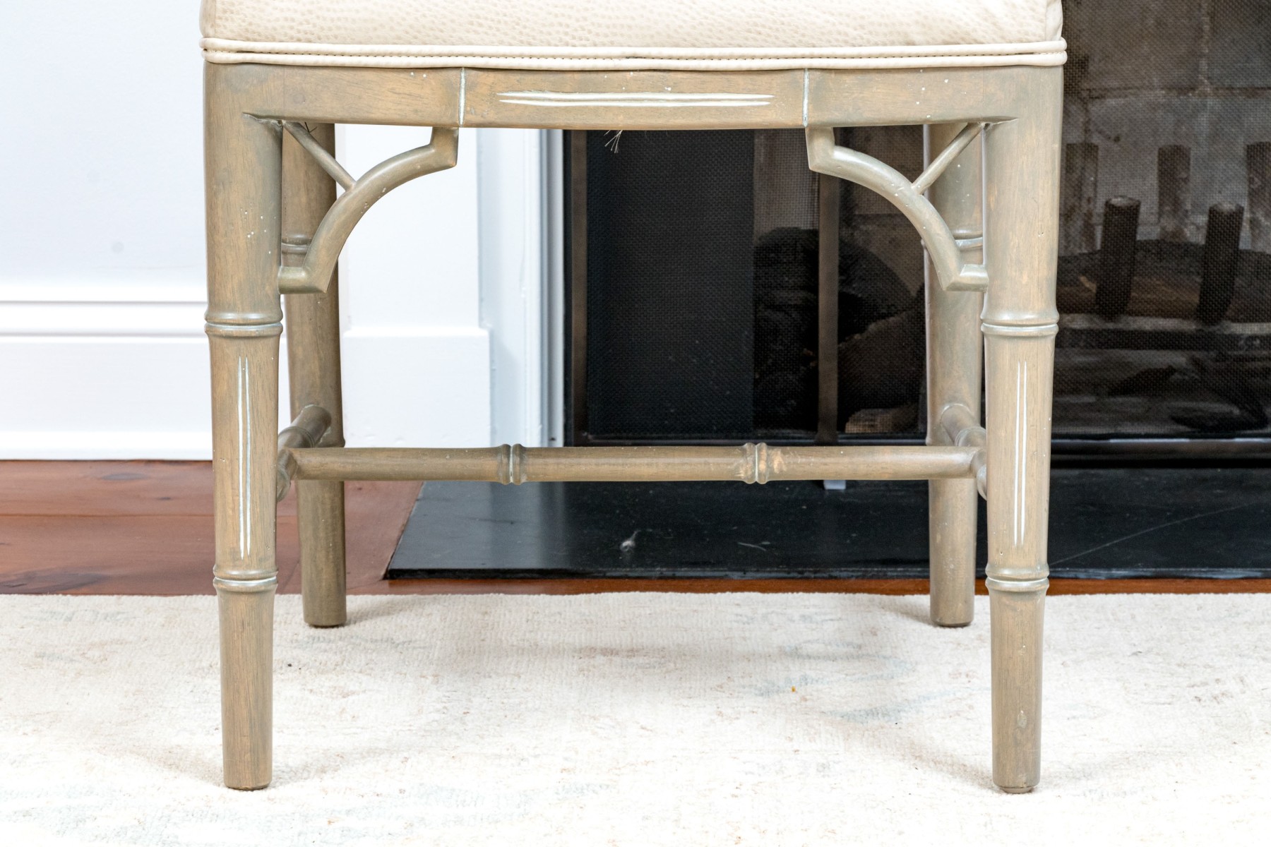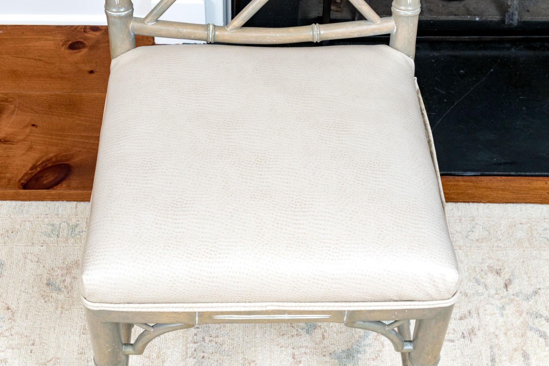 Additionally the chairs have ringed faux bamboo legs adorned with decorative corner brackets and H-stretchers. Upholstered in elegant white leatherette.