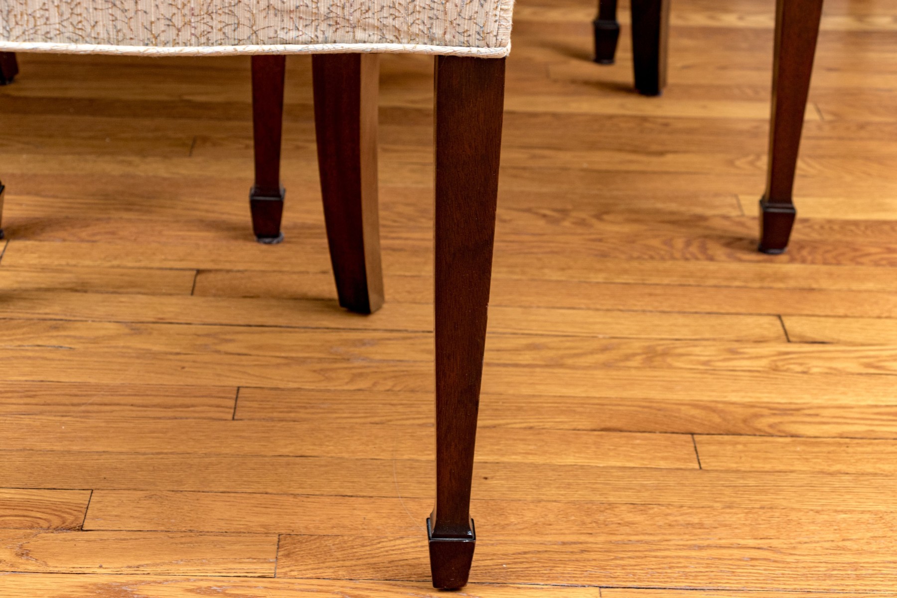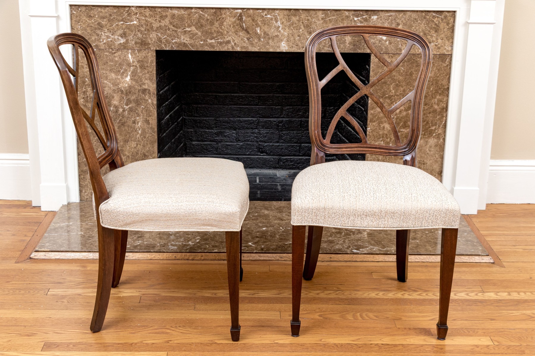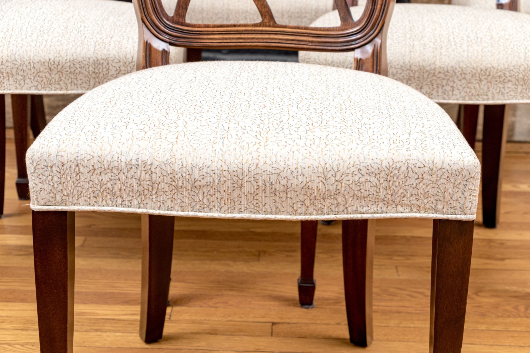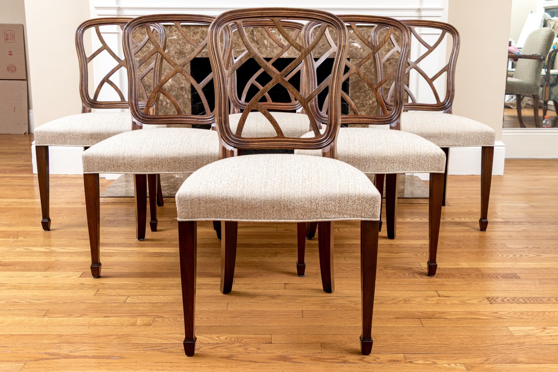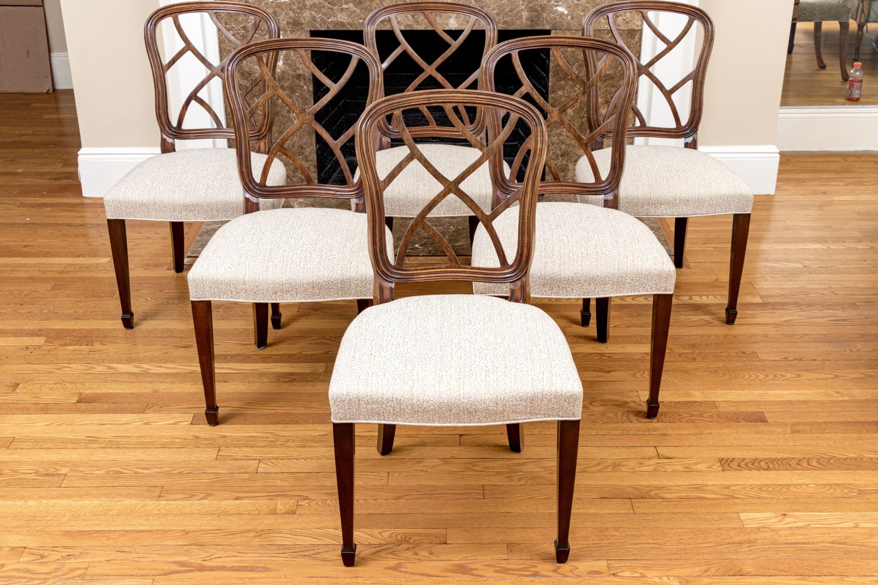 A fantastic set of six Hepplewhite style dining chairs raised on front square tapered legs with spade form feet and back square saber form legs. Custom upholstered seat cushions and pierced openwork seat backs make for timelessly elegant designs.