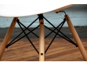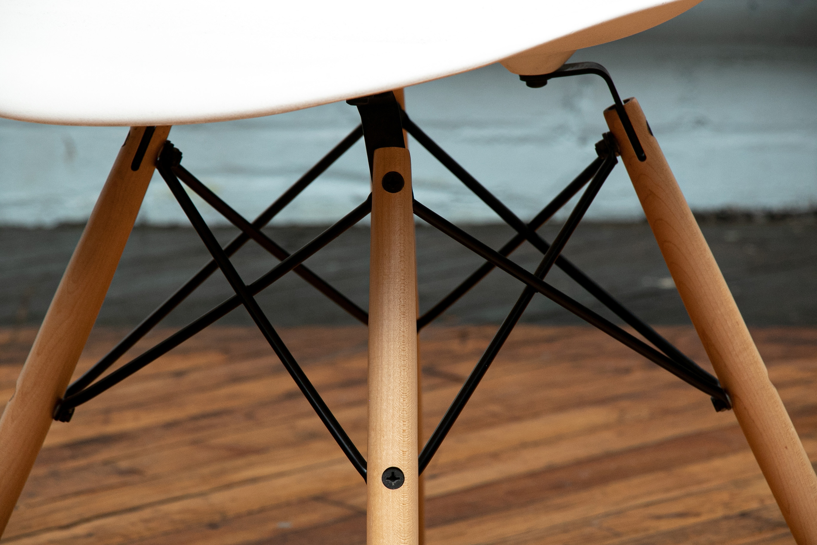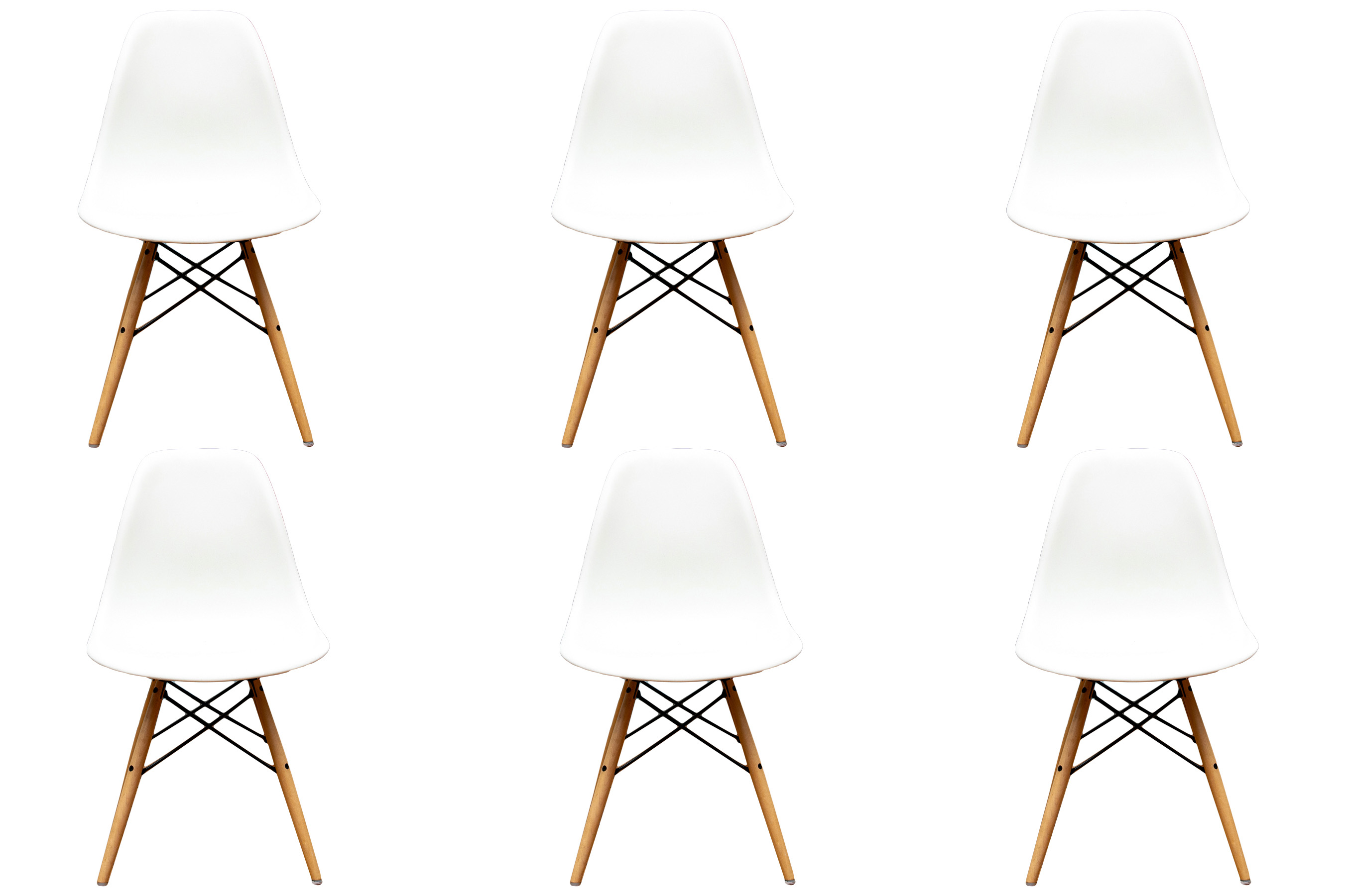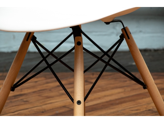 Marked on the bottom. Molded white plastic chairs, dowel construction. Raised on pale wood splayed tubular legs. With black criss-cross stretchers.