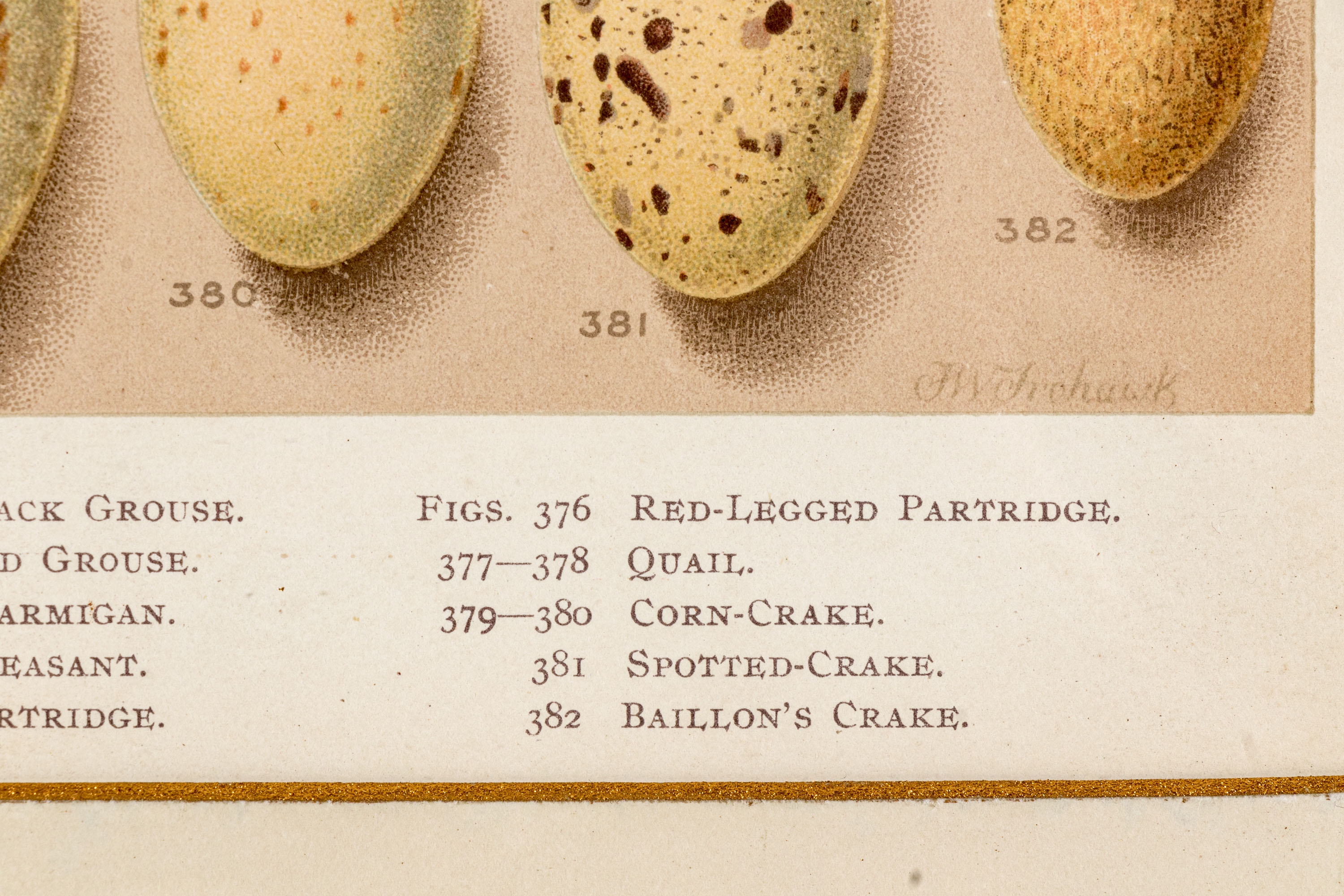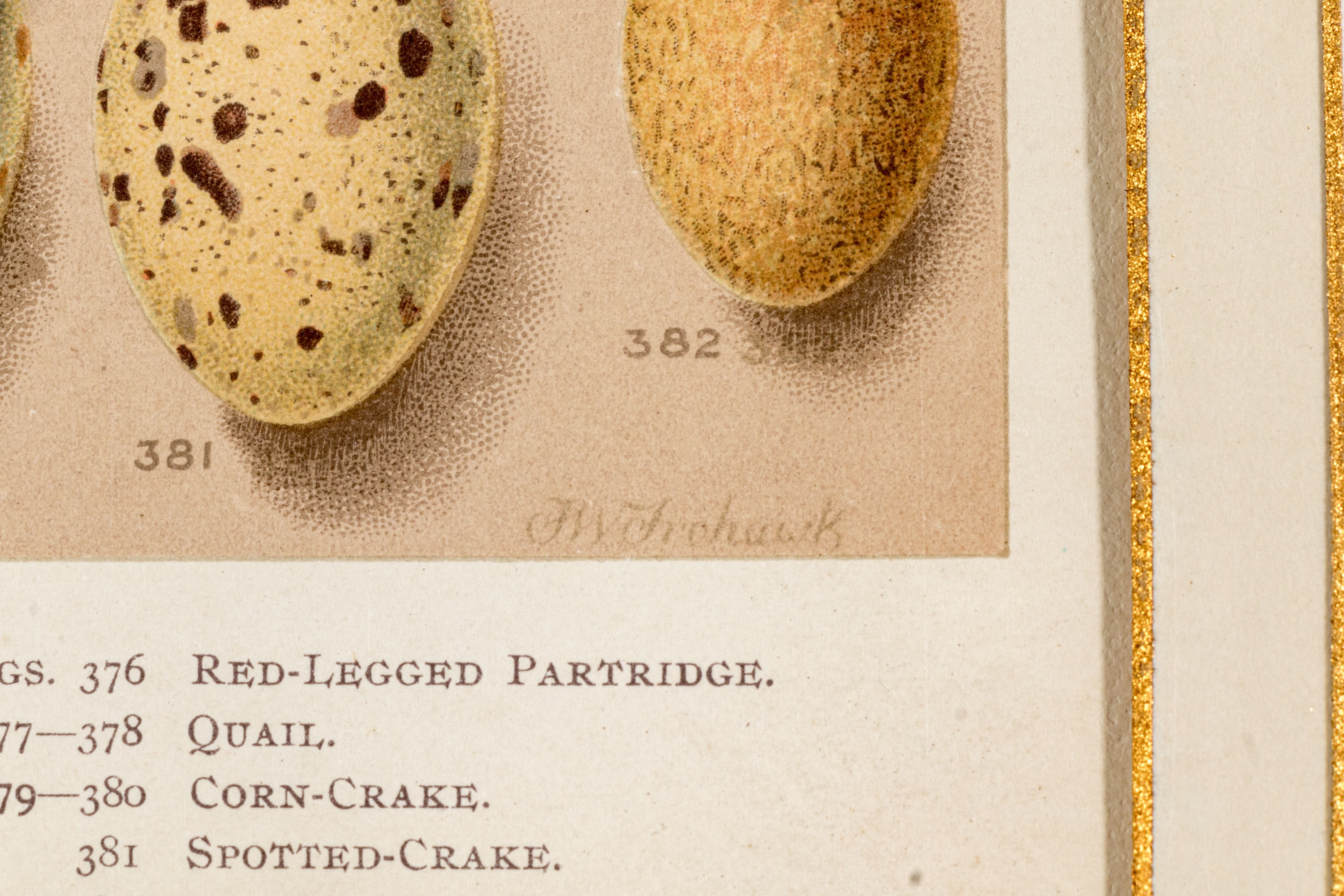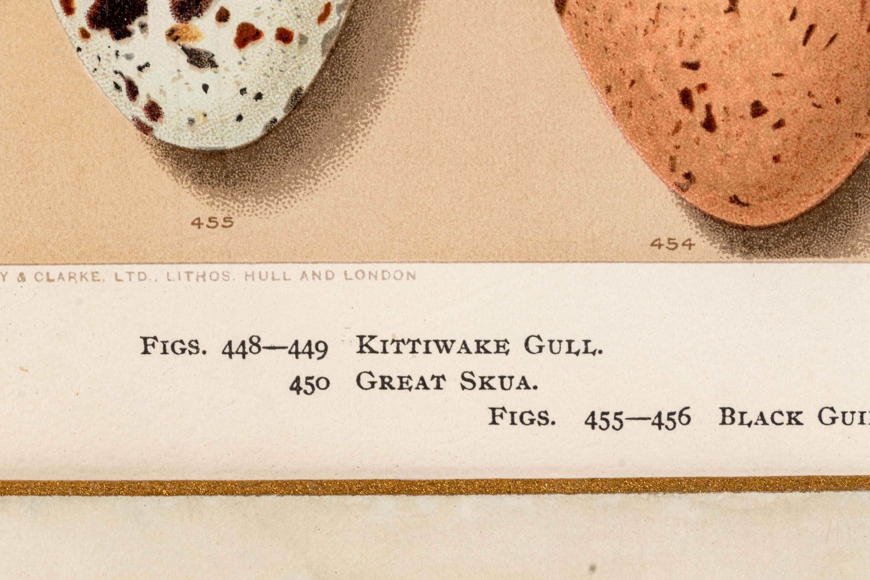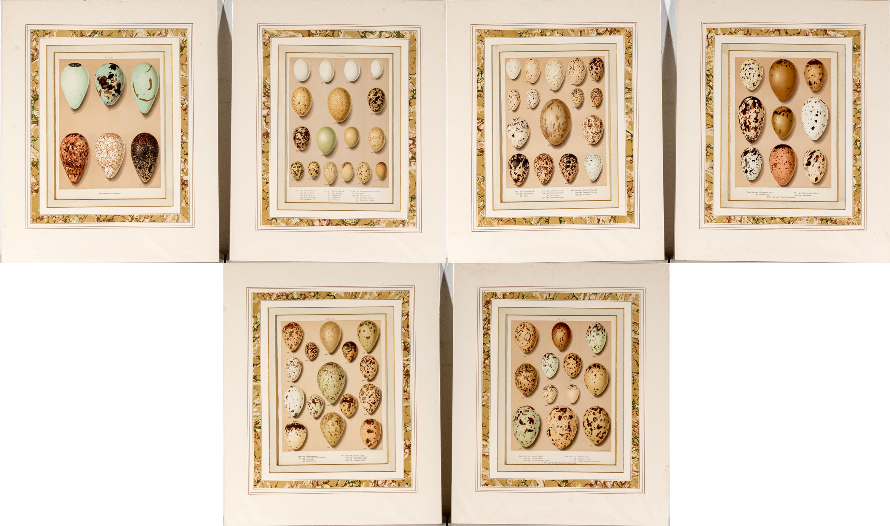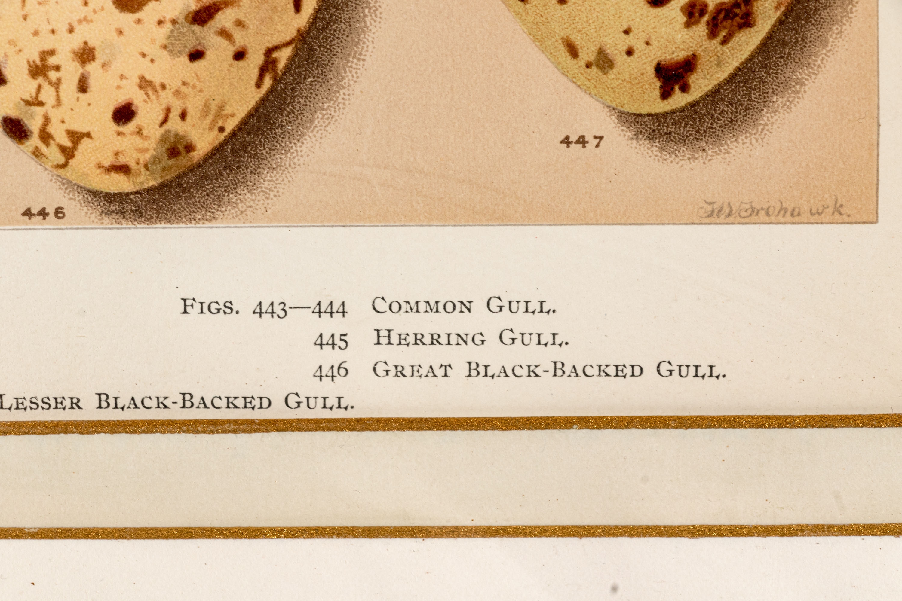 Printed in London by Grumby & Clarke after F.W. Frohawk (UK, 1861-1946) zoological artworks. Colorful eggs from a variety of shore and game birds Including pheasant, dove, terns, plovers, gulls, et al. Unframed and presented finely matted and wrapped in plastic.