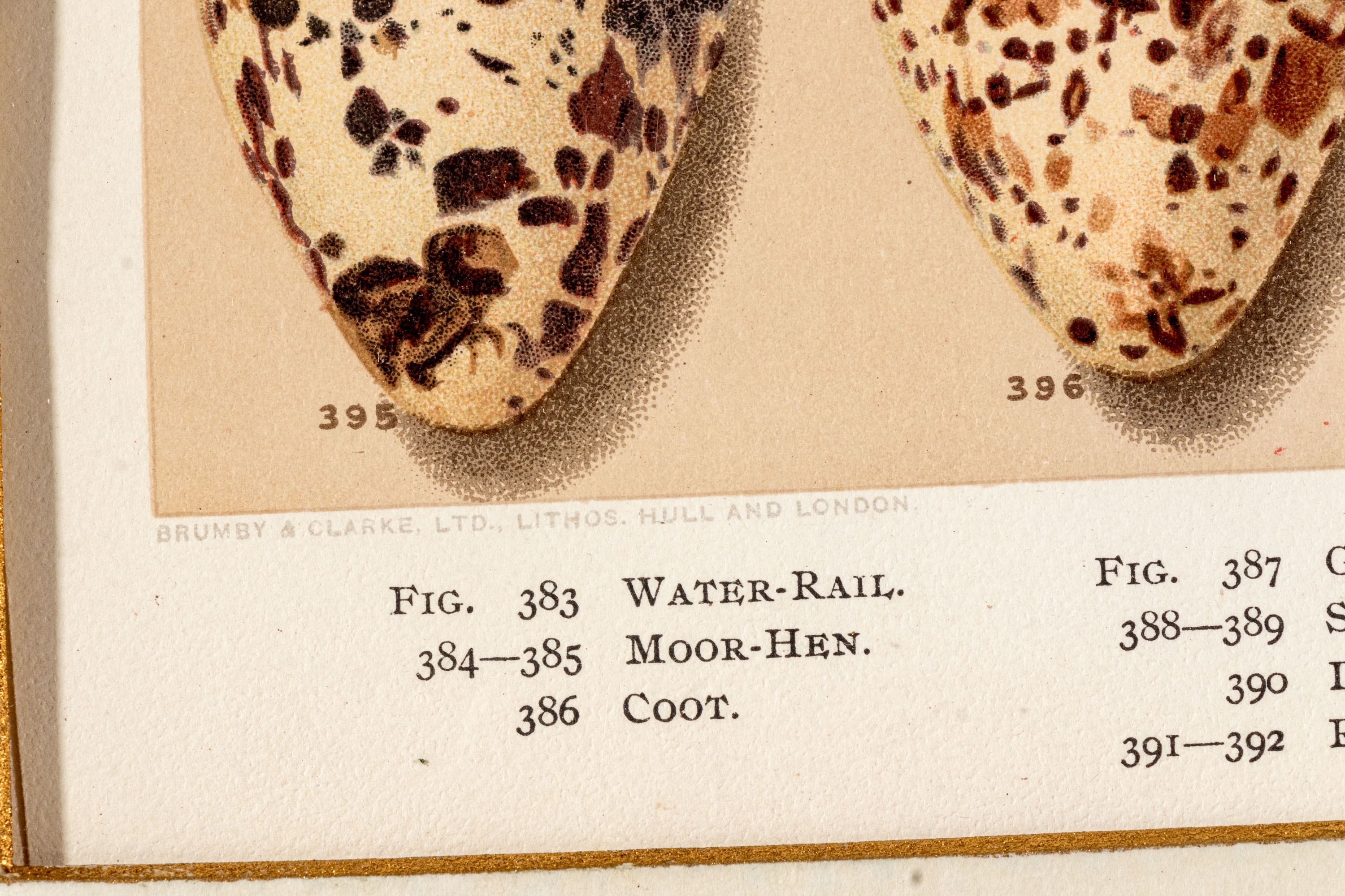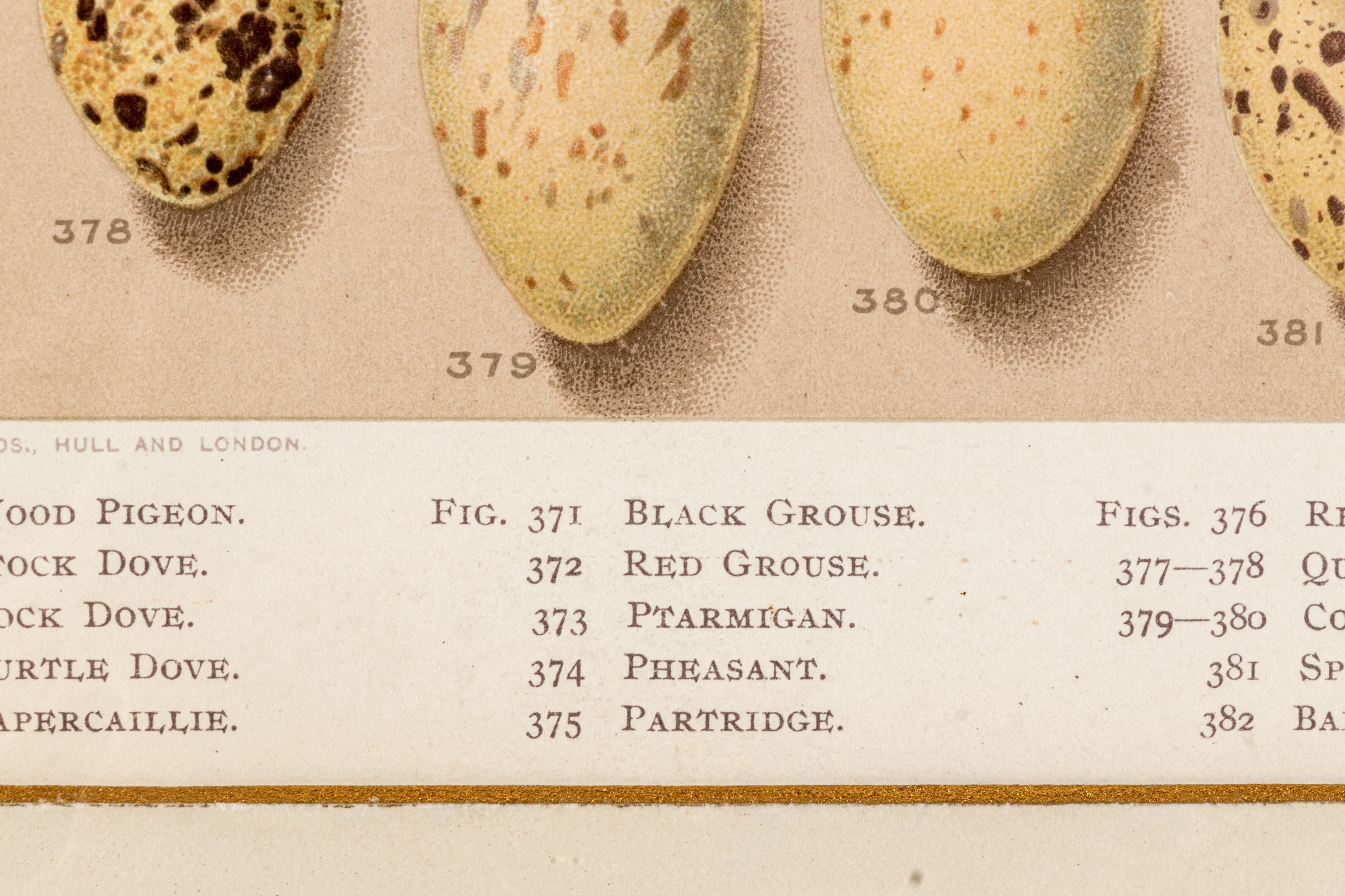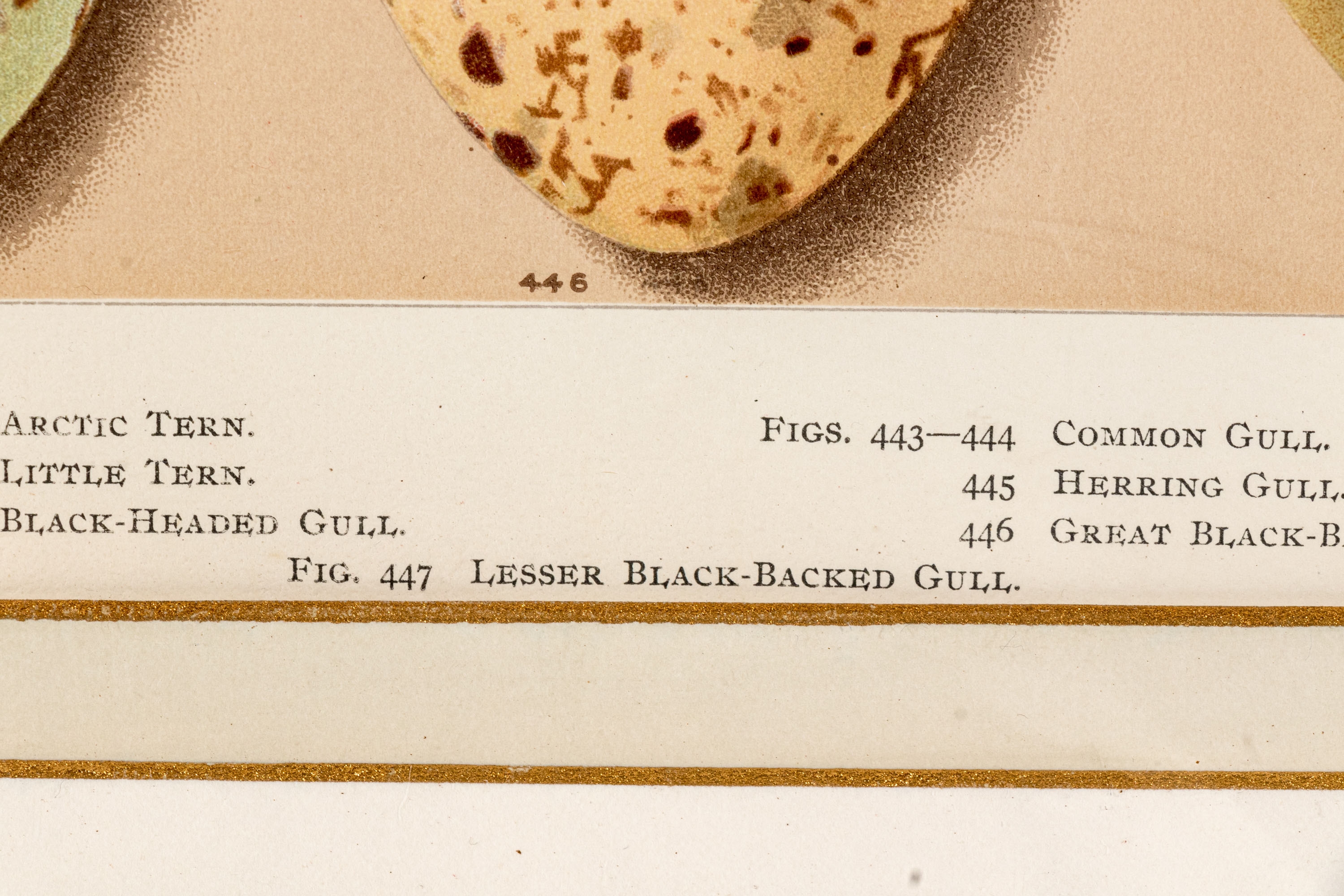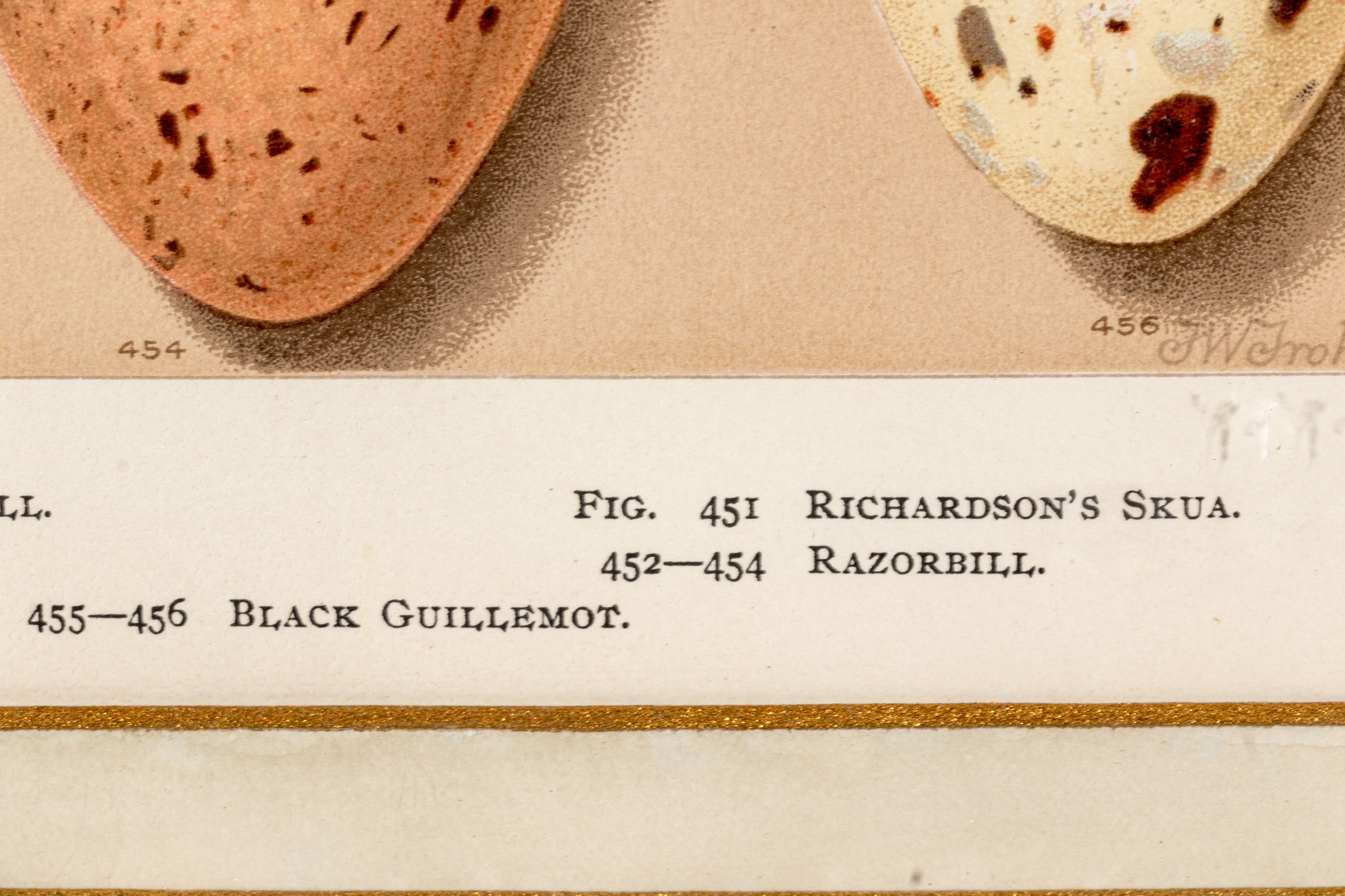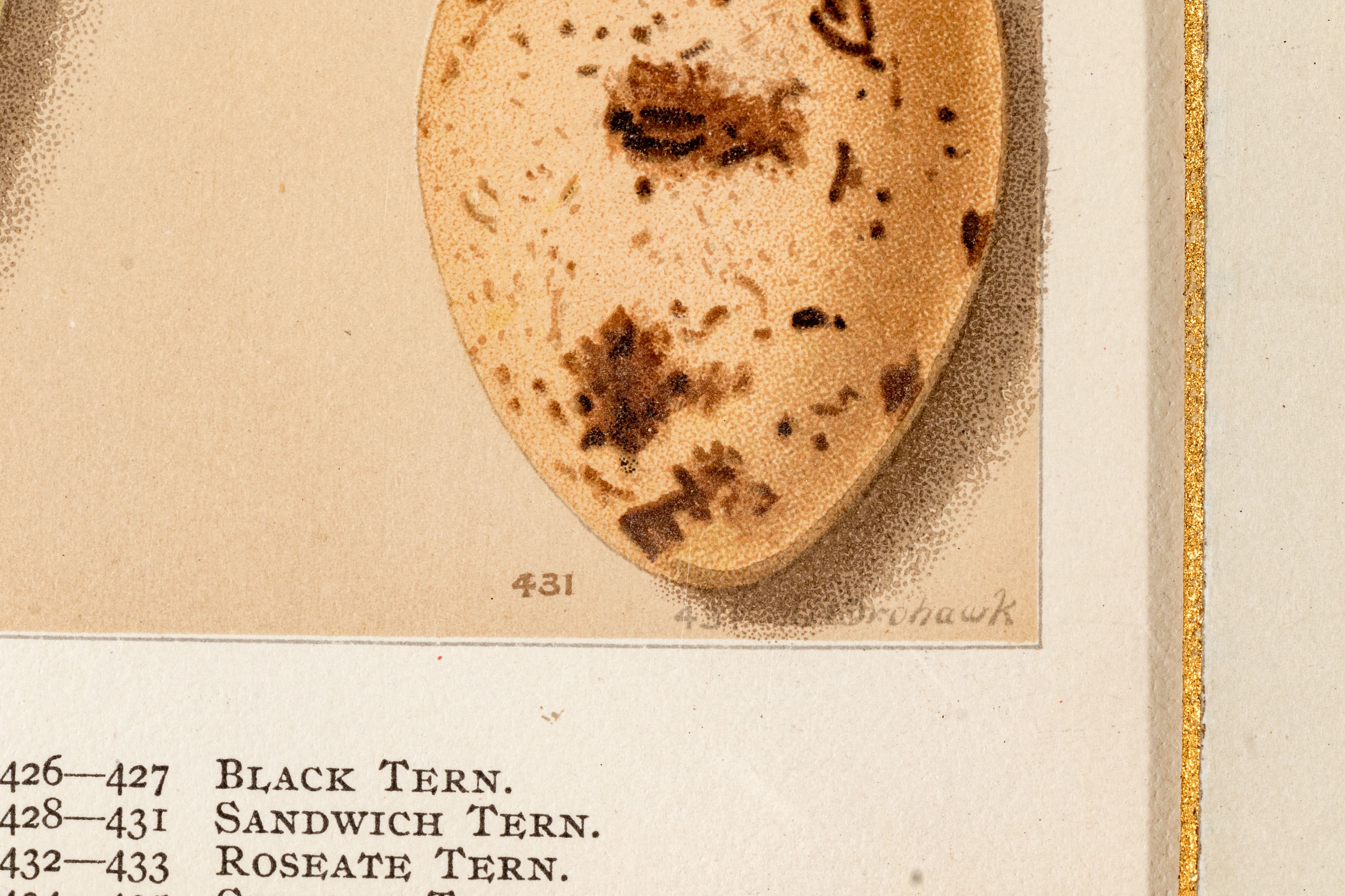 Printed in London by Grumby & Clarke after F.W. Frohawk (UK, 1861-1946) zoological artworks. Colorful eggs from a variety of shore and game birds Including pheasant, dove, terns, plovers, gulls, et al. Unframed and presented finely matted and wrapped in plastic.