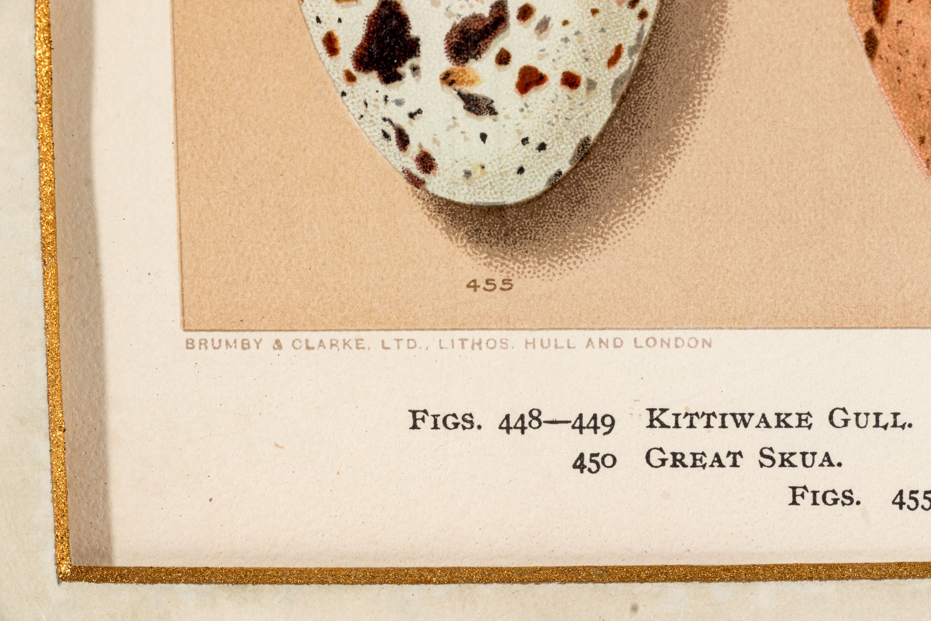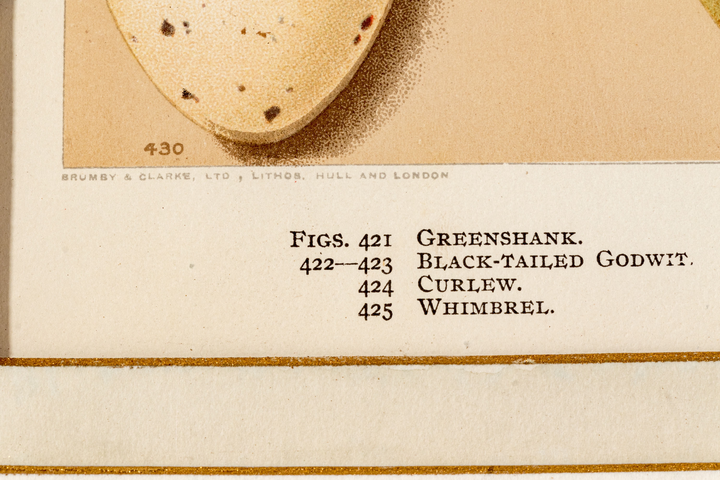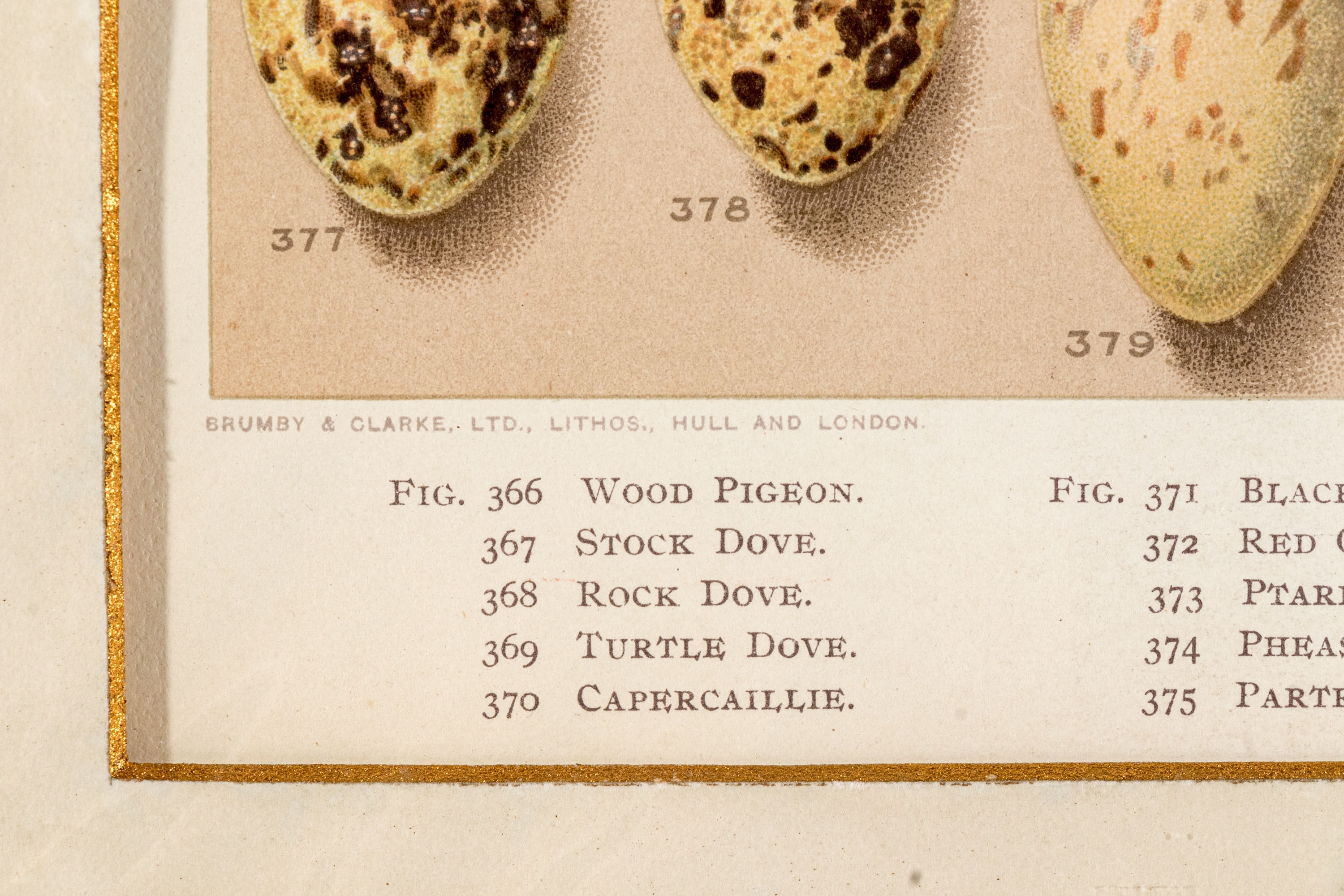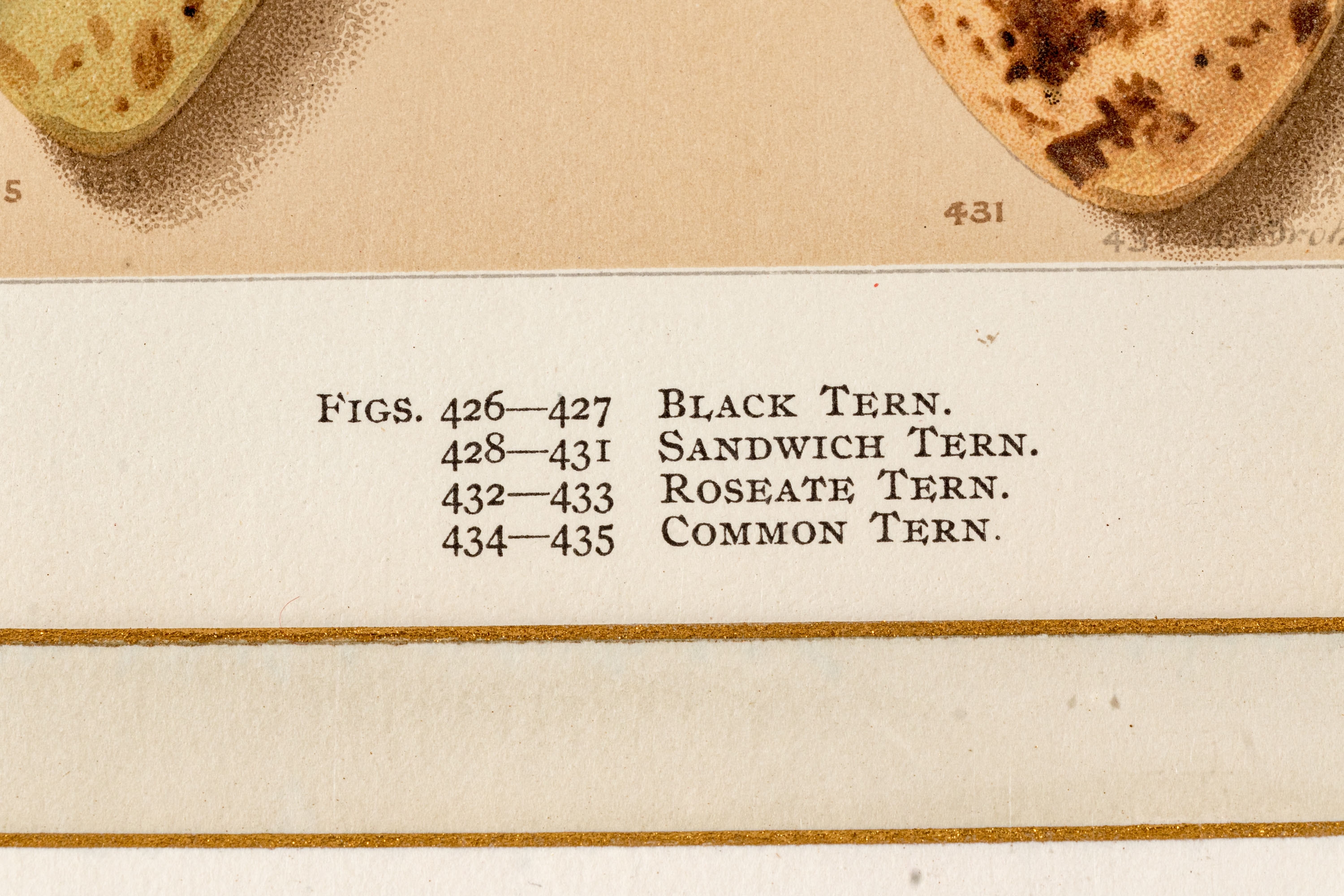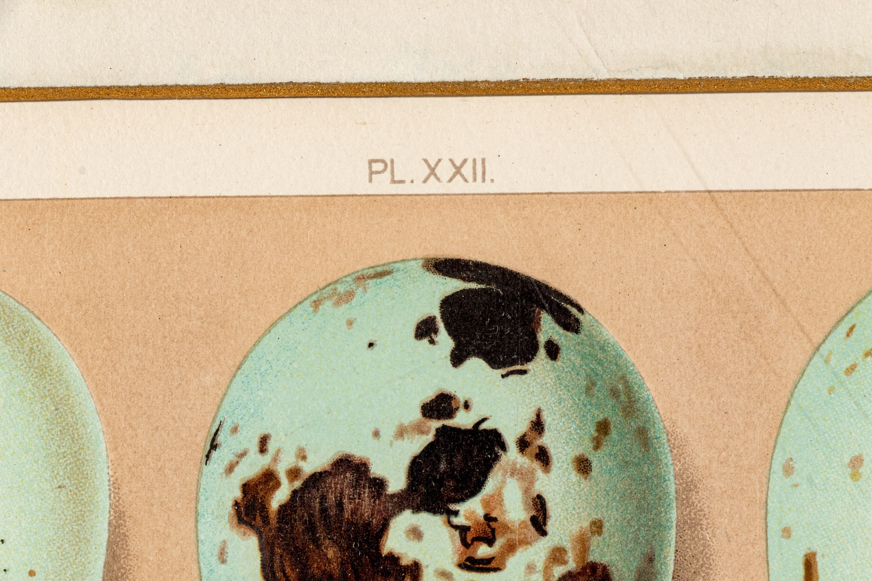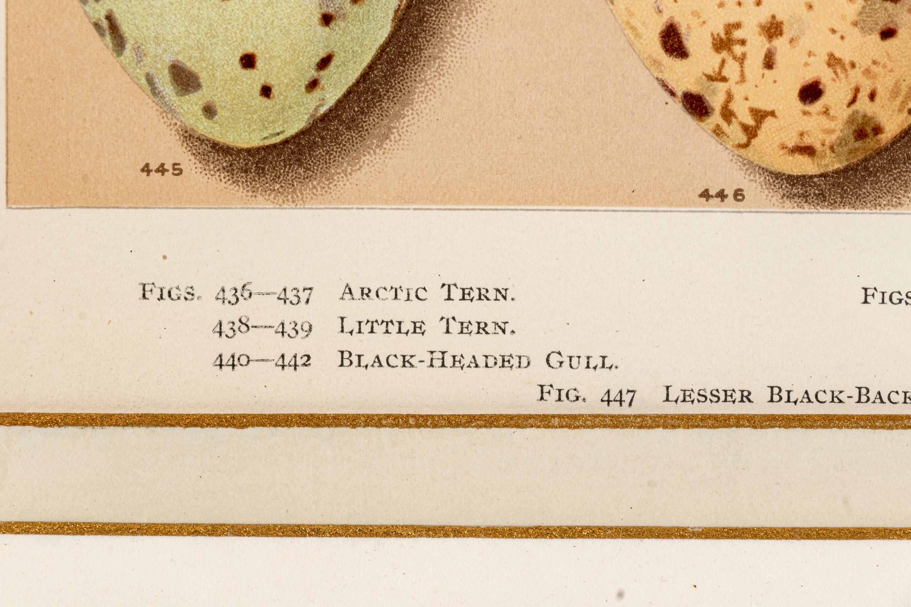 Printed in London by Grumby & Clarke after F.W. Frohawk (UK, 1861-1946) zoological artworks. Colorful eggs from a variety of shore and game birds Including pheasant, dove, terns, plovers, gulls, et al. Unframed and presented finely matted and wrapped in plastic.