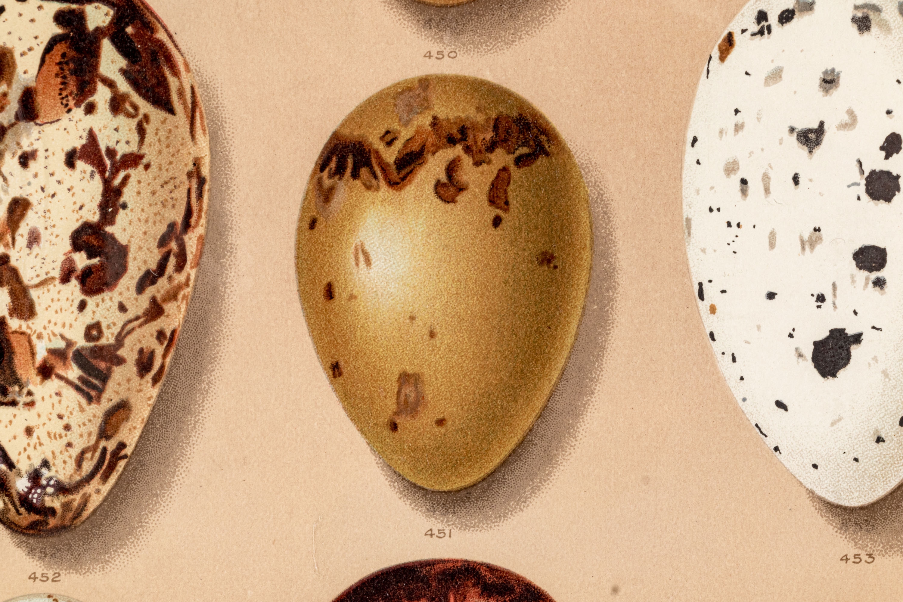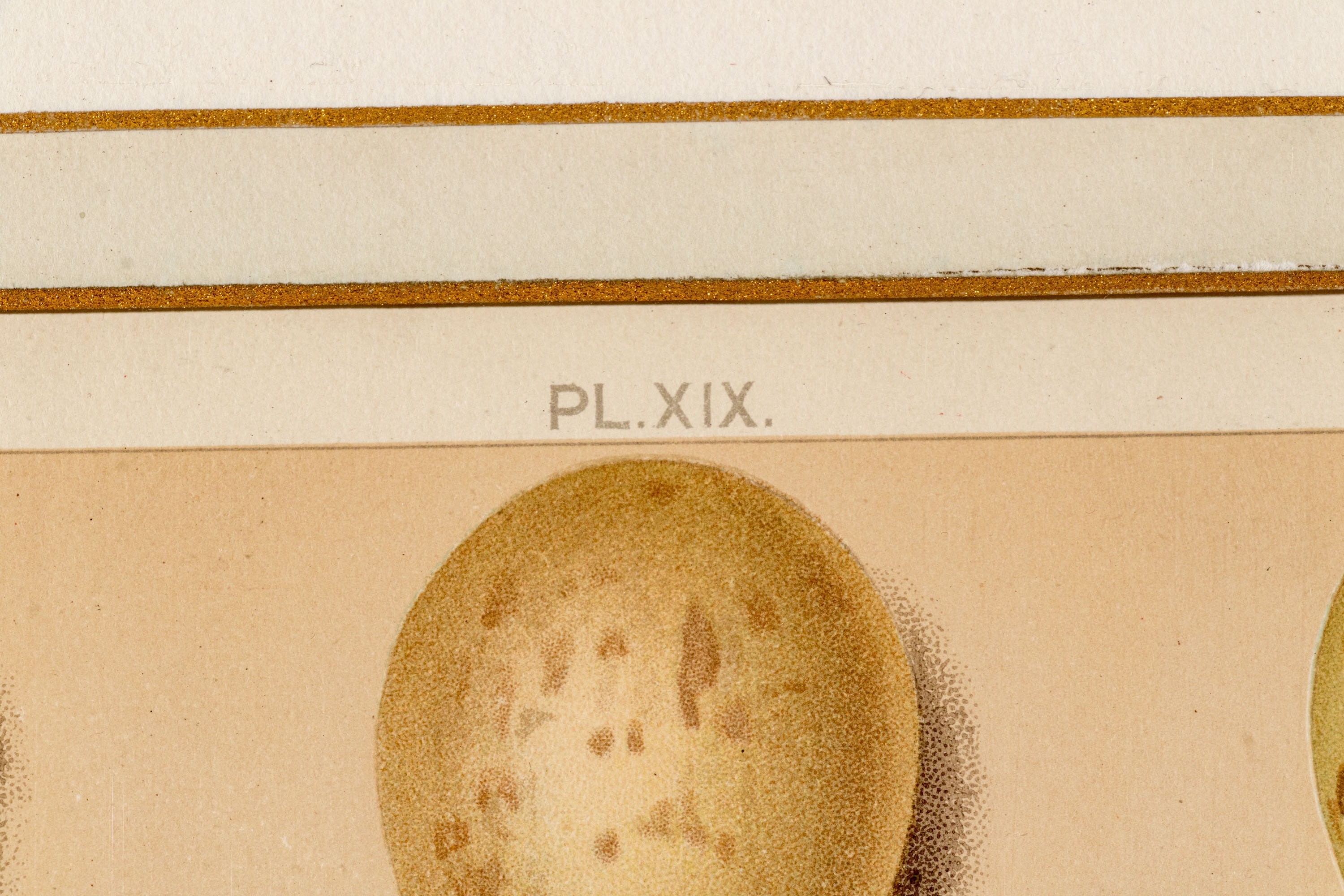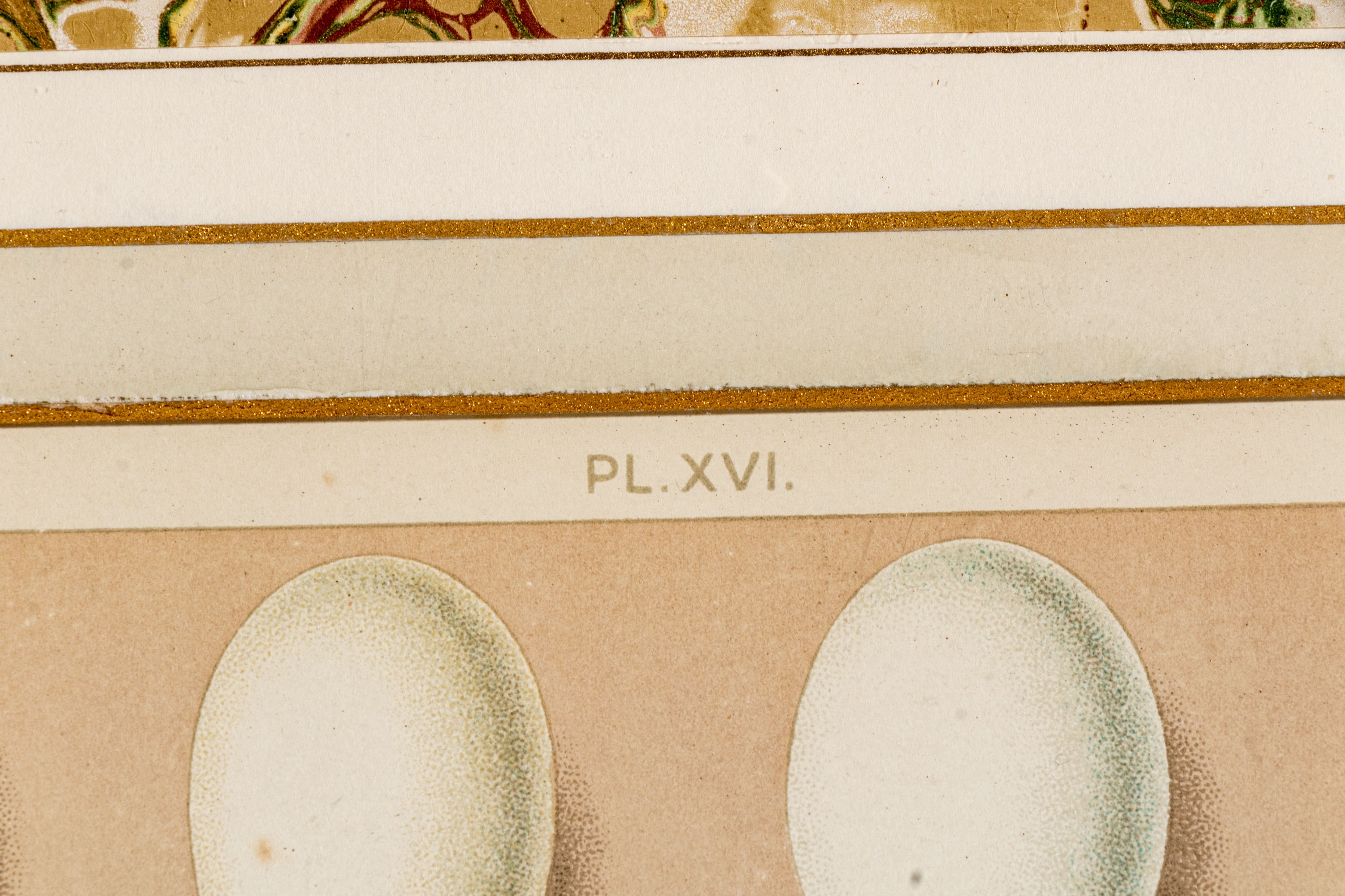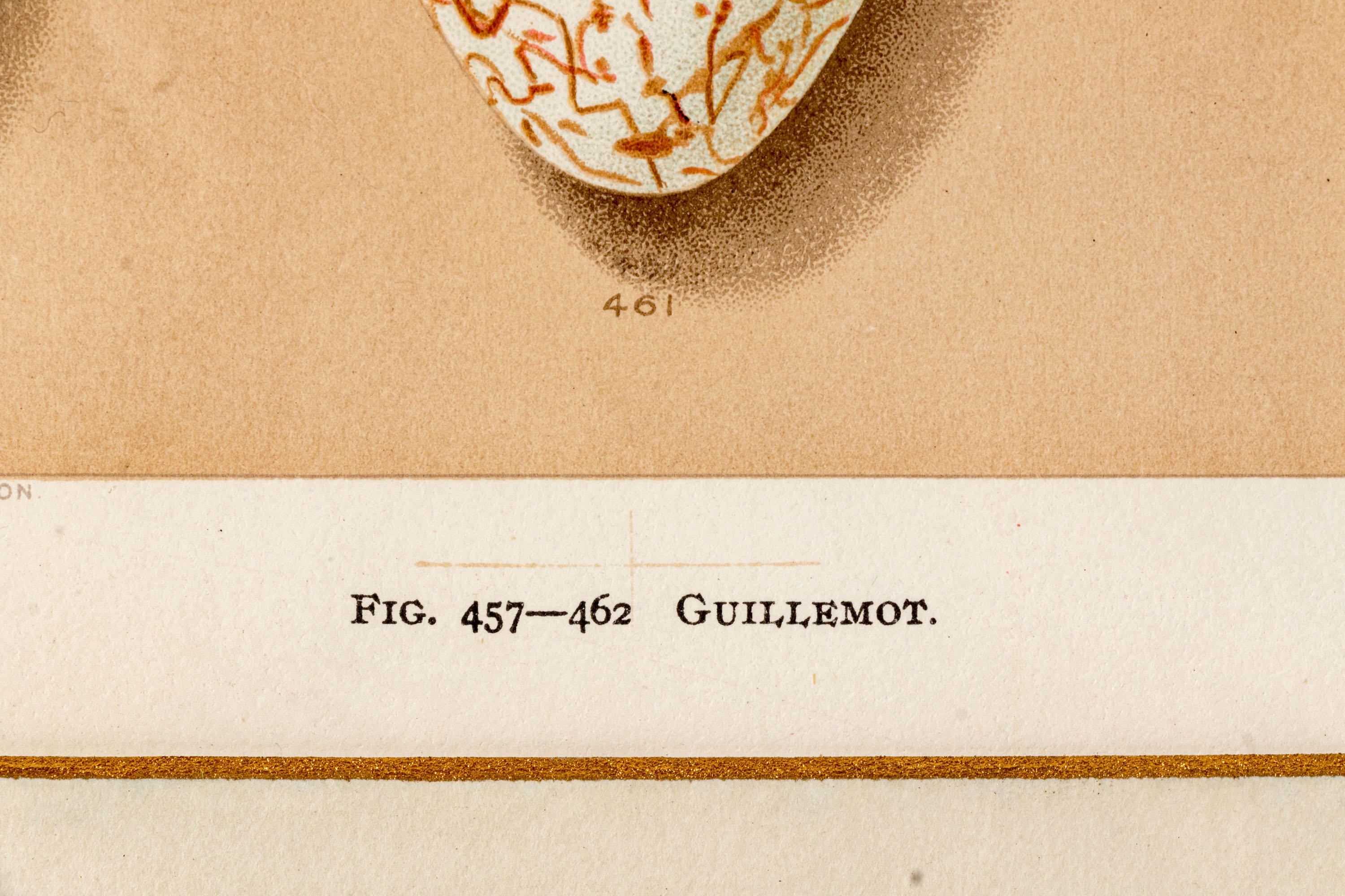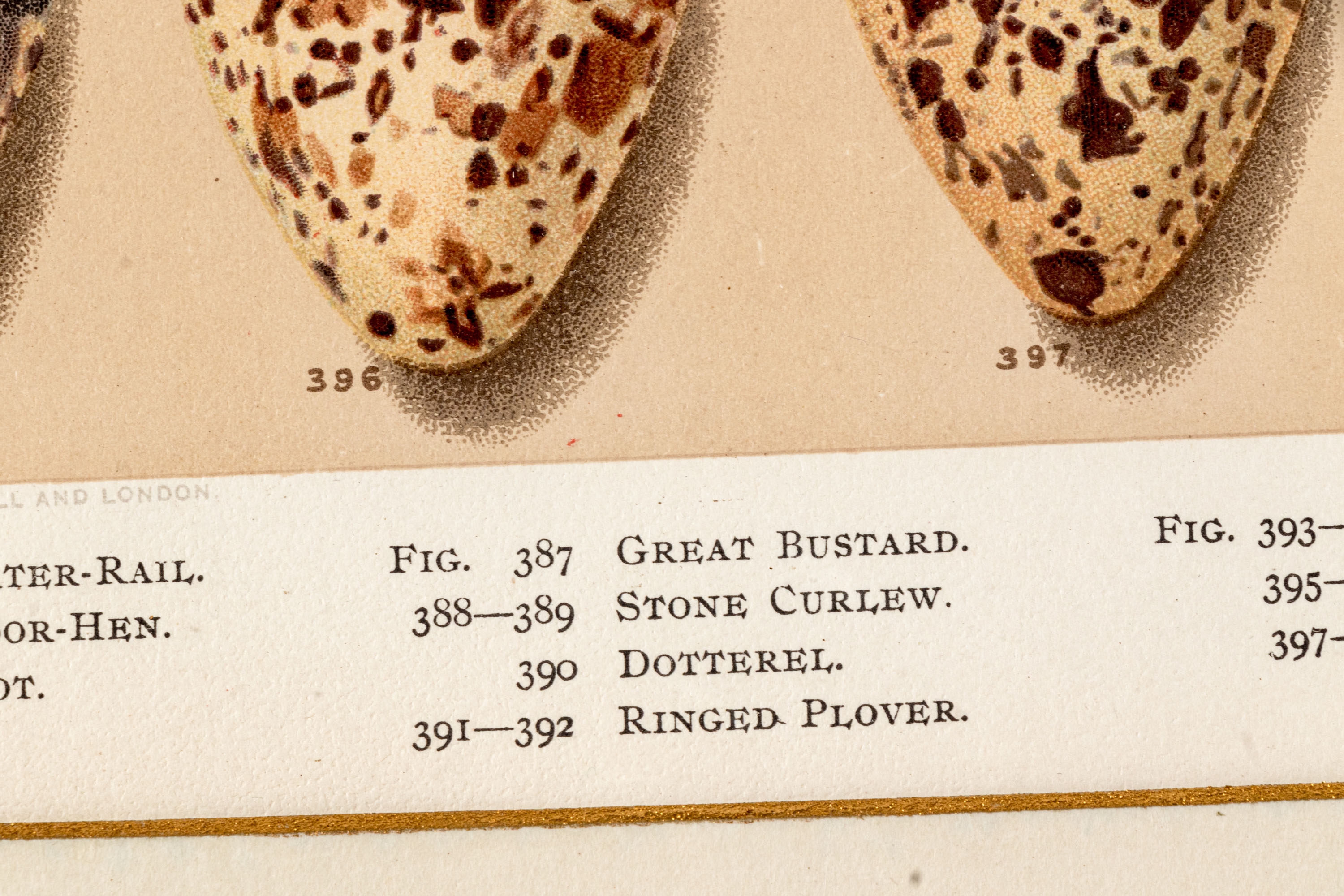 Printed in London by Grumby & Clarke after F.W. Frohawk (UK, 1861-1946) zoological artworks. Colorful eggs from a variety of shore and game birds Including pheasant, dove, terns, plovers, gulls, et al. Unframed and presented finely matted and wrapped in plastic.