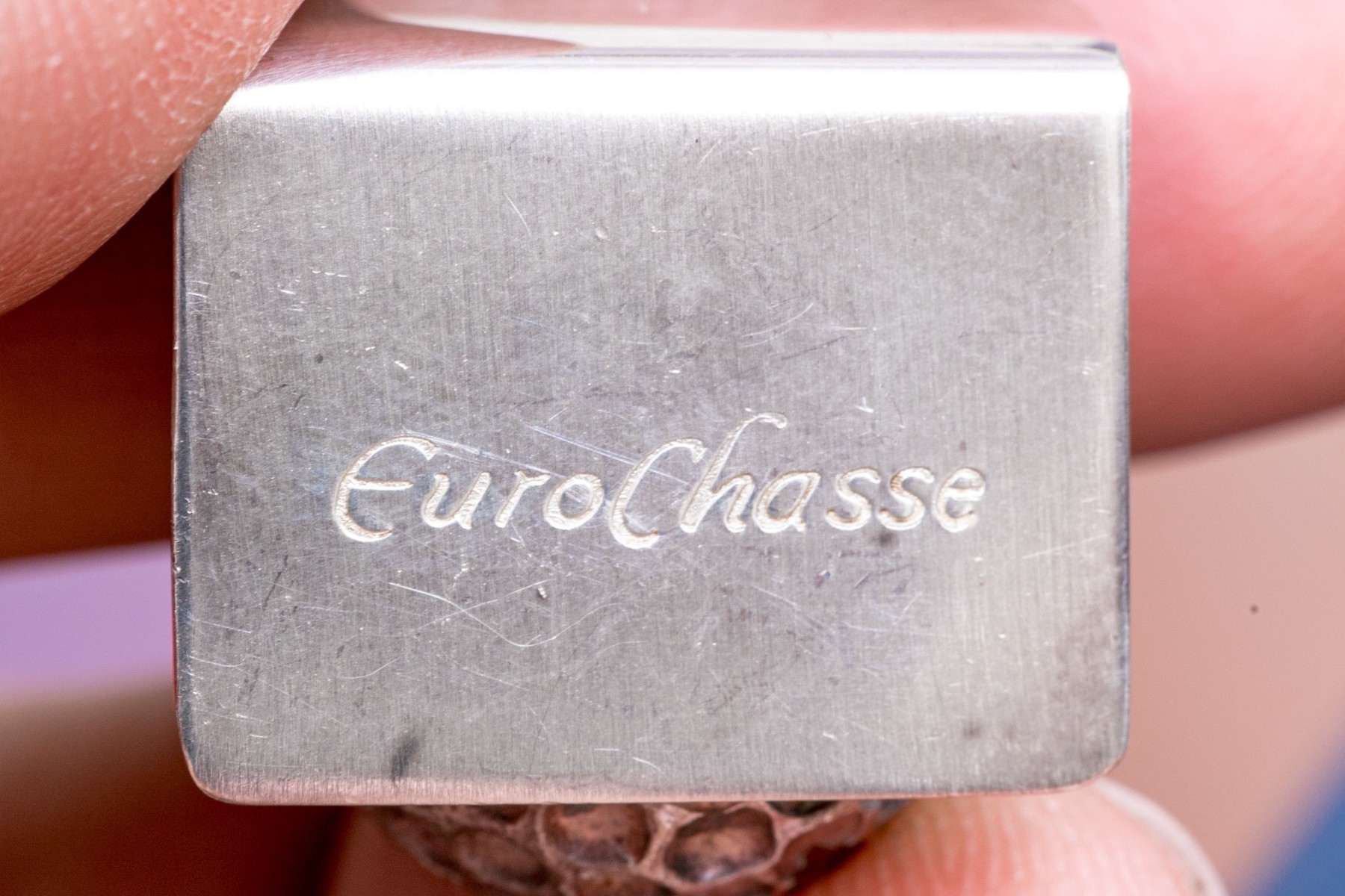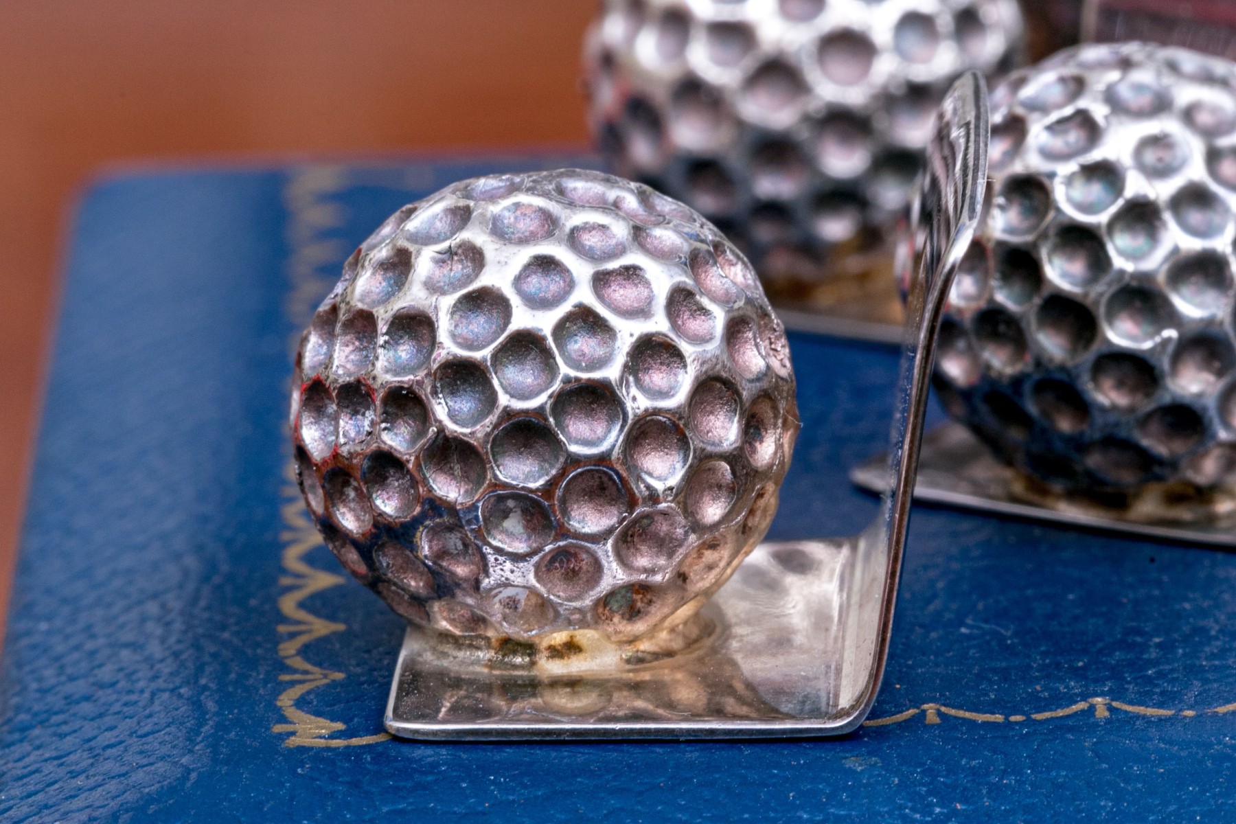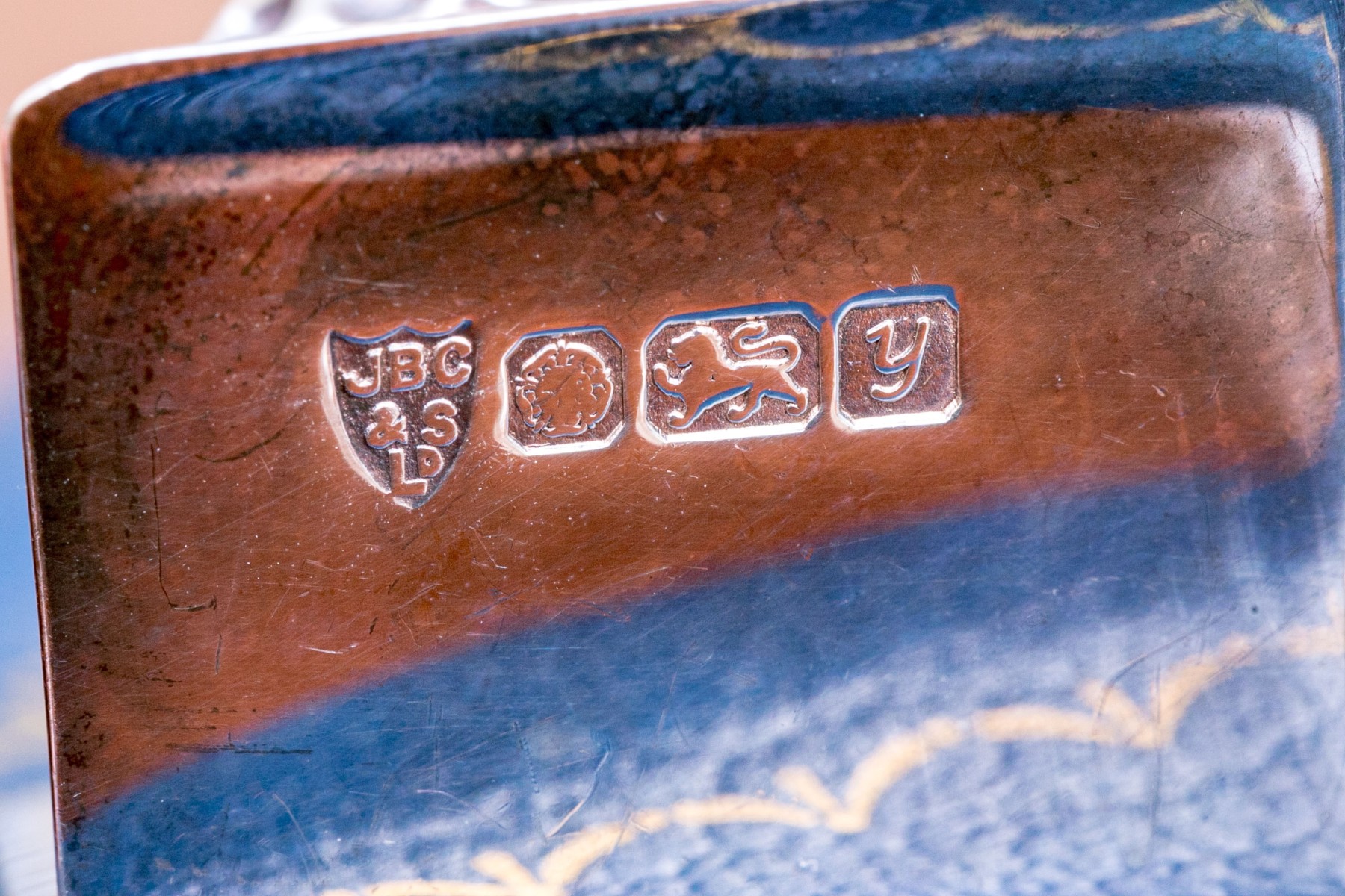 Stippled balls on "L" form bases. Etched "Euro Chasse" and marked with English hallmarks, denoting the maker as J.B. Chatterley & Sons Ltd. (JBC & SL).