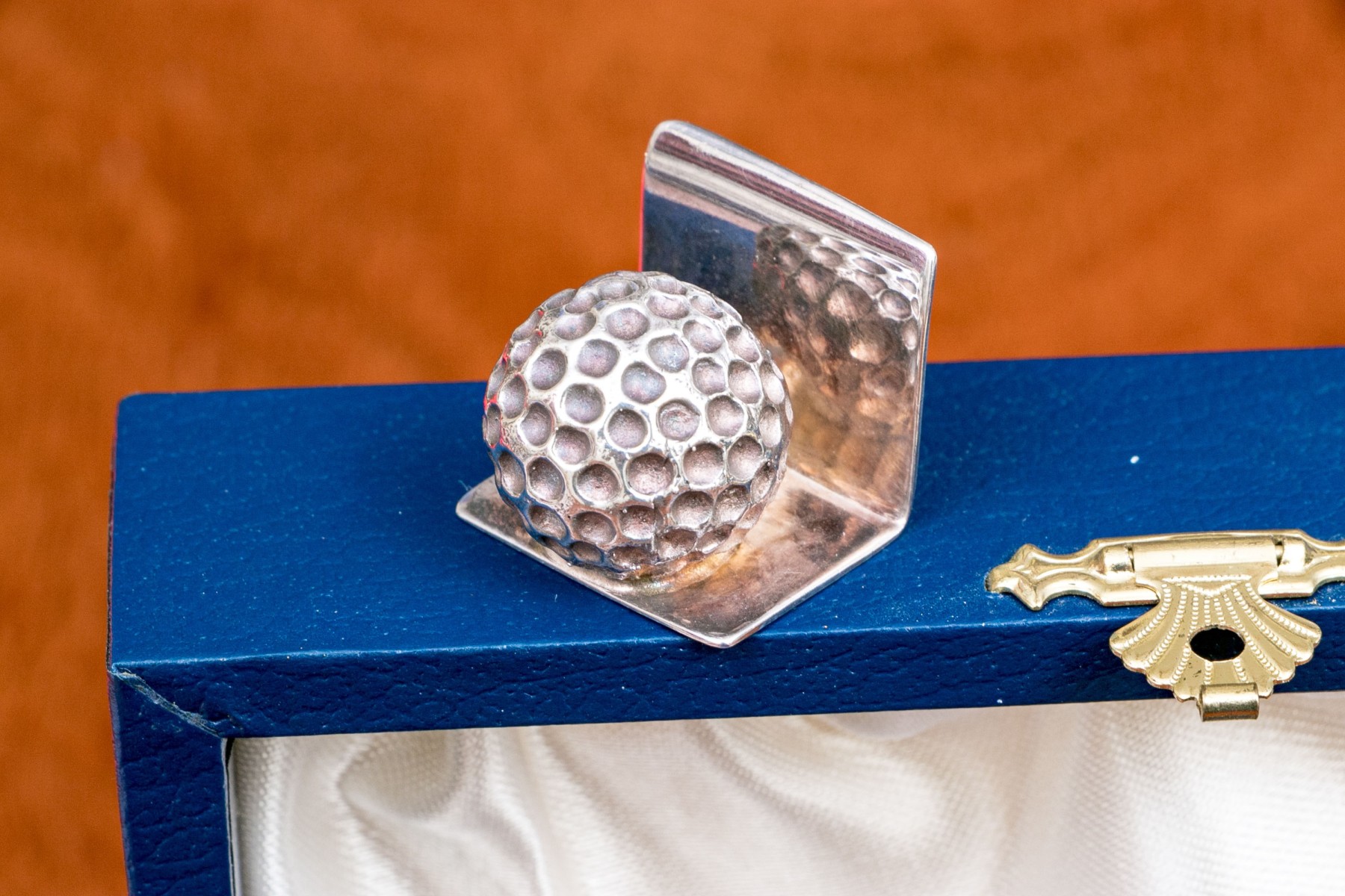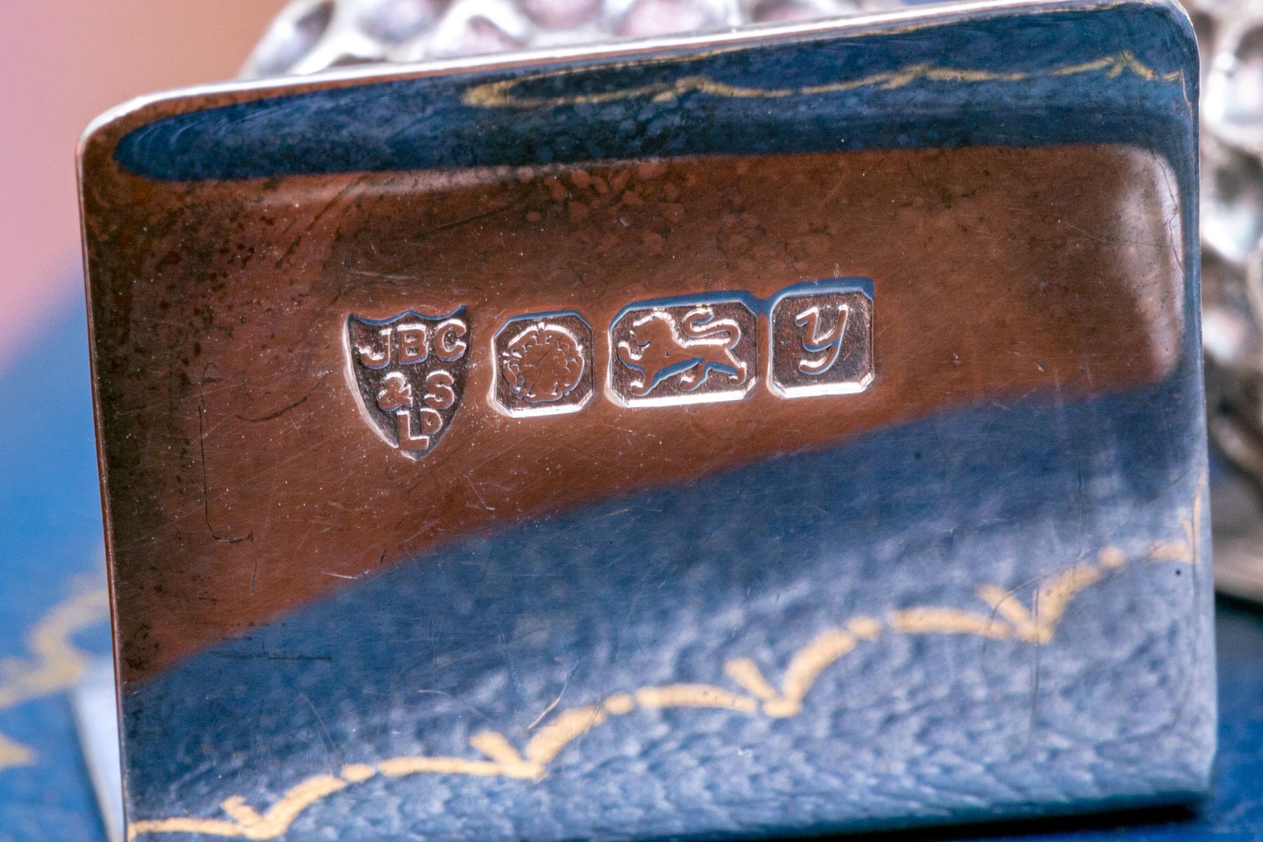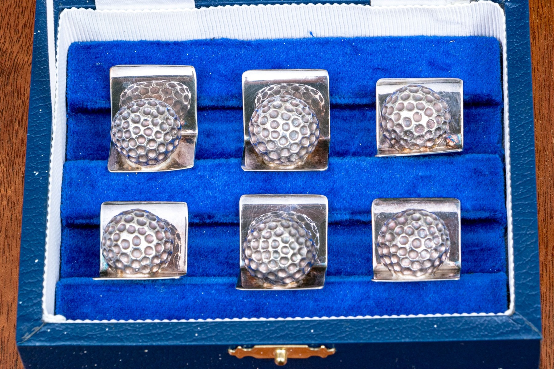 Stippled balls on "L" form bases. Etched "Euro Chasse" and marked with English hallmarks, denoting the maker as J.B. Chatterley & Sons Ltd. (JBC & SL).