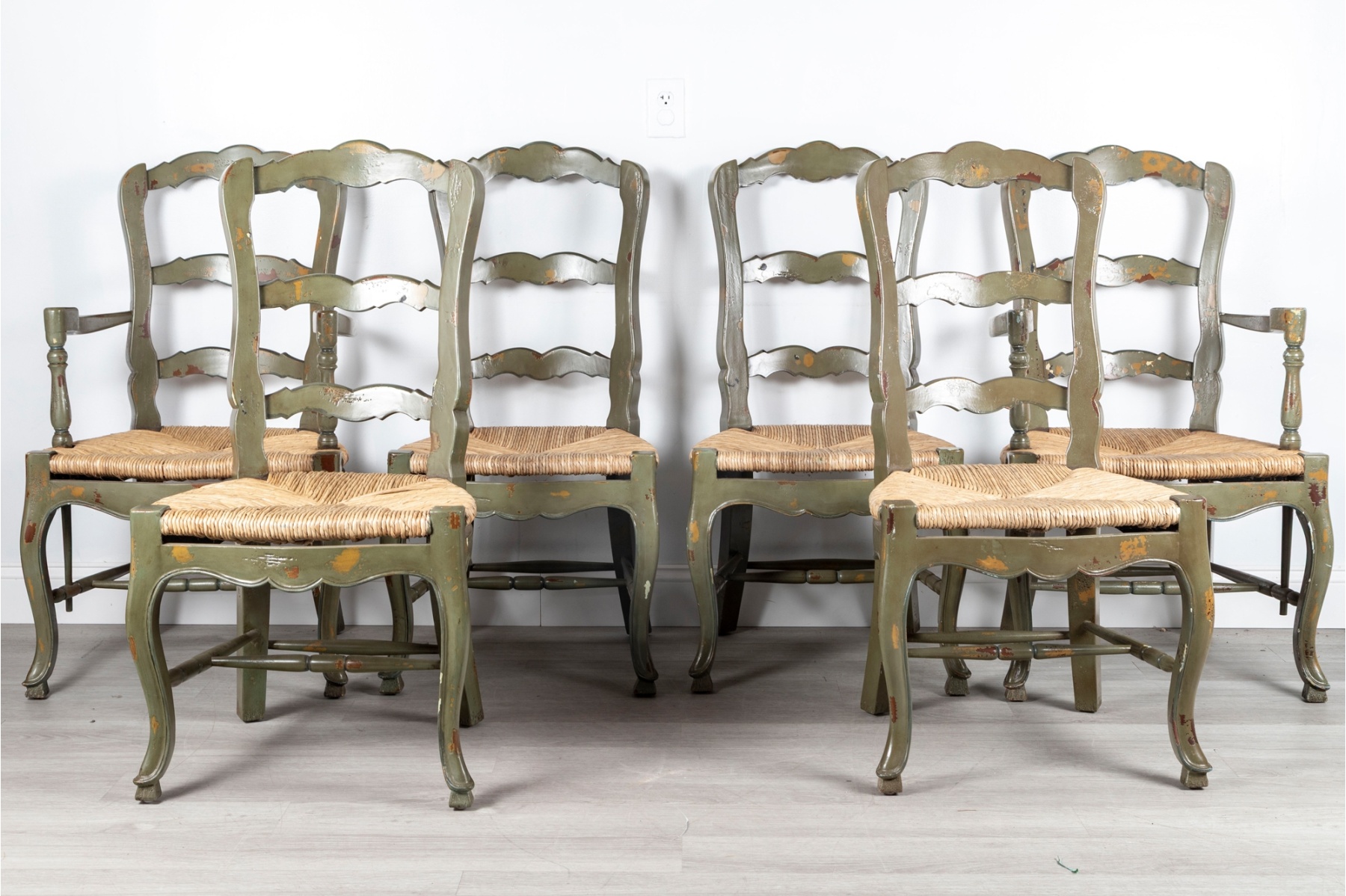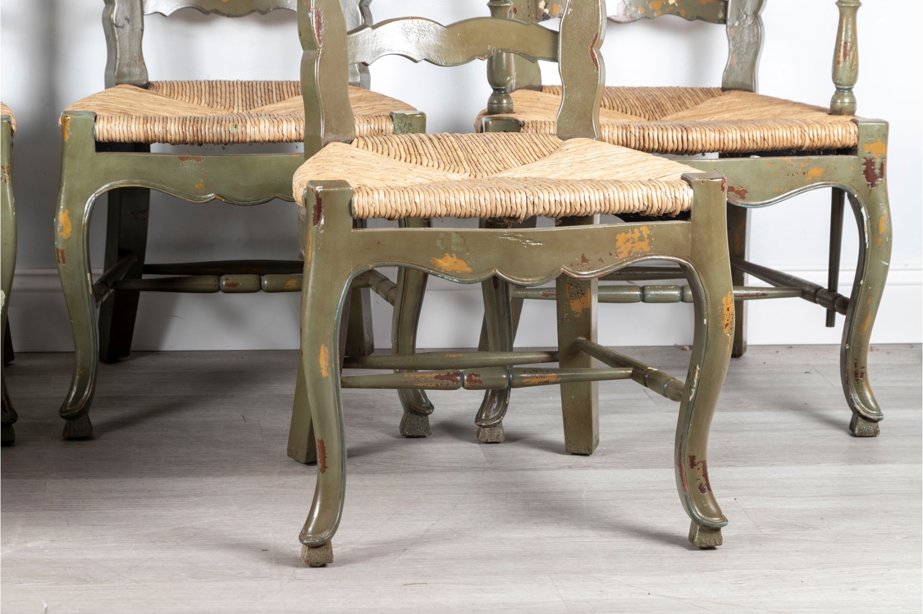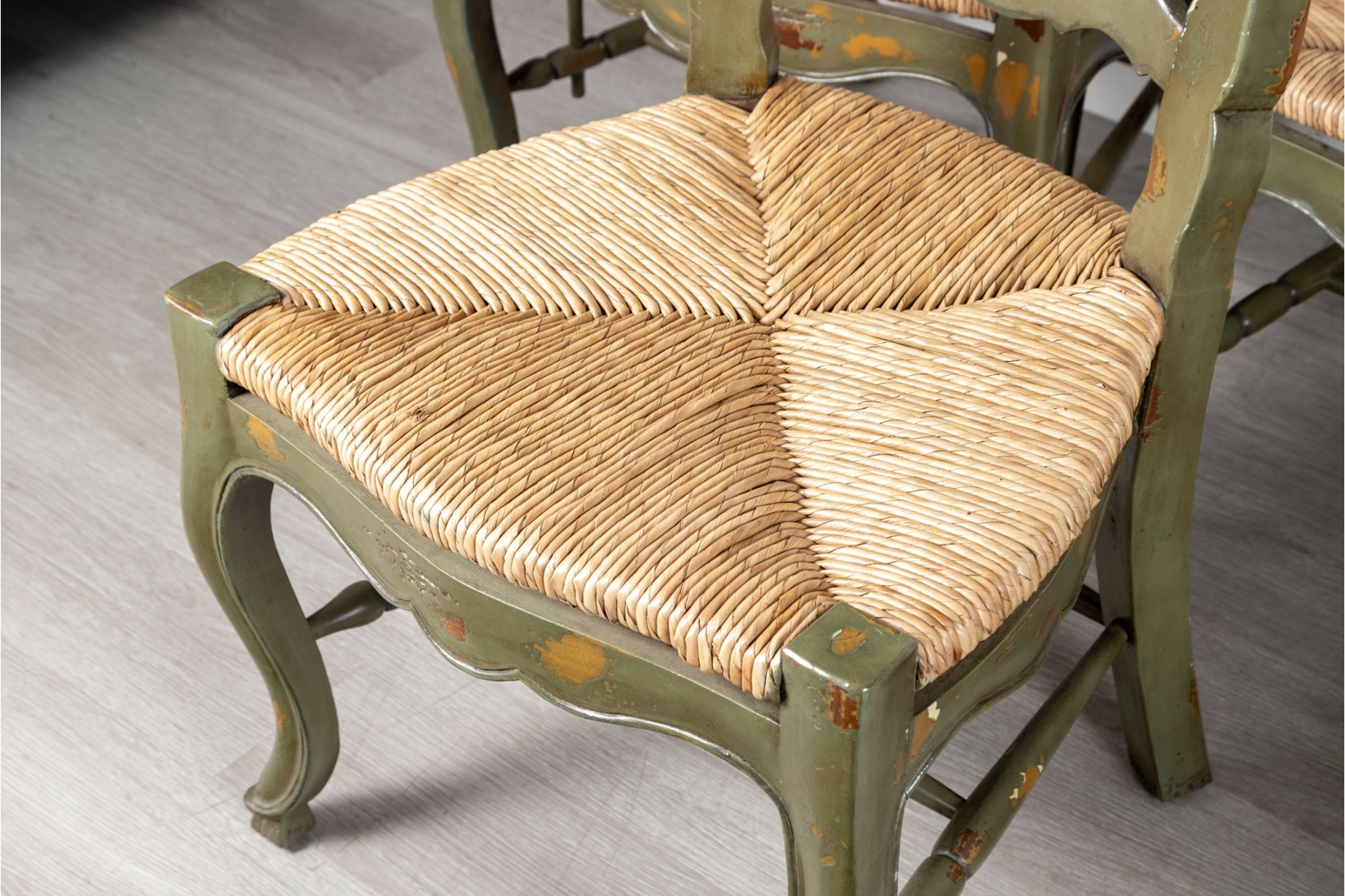 Set of four French Provincial ladder-back dining chairs, including two armchairs and two side chairs. Each features a carved wooden frame with a painted finish, curved legs, and woven rush seats in a classic provincial style. Produced by Furniture Classics Limited, Virginia.