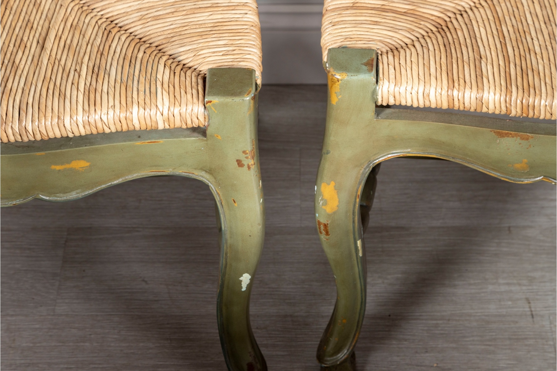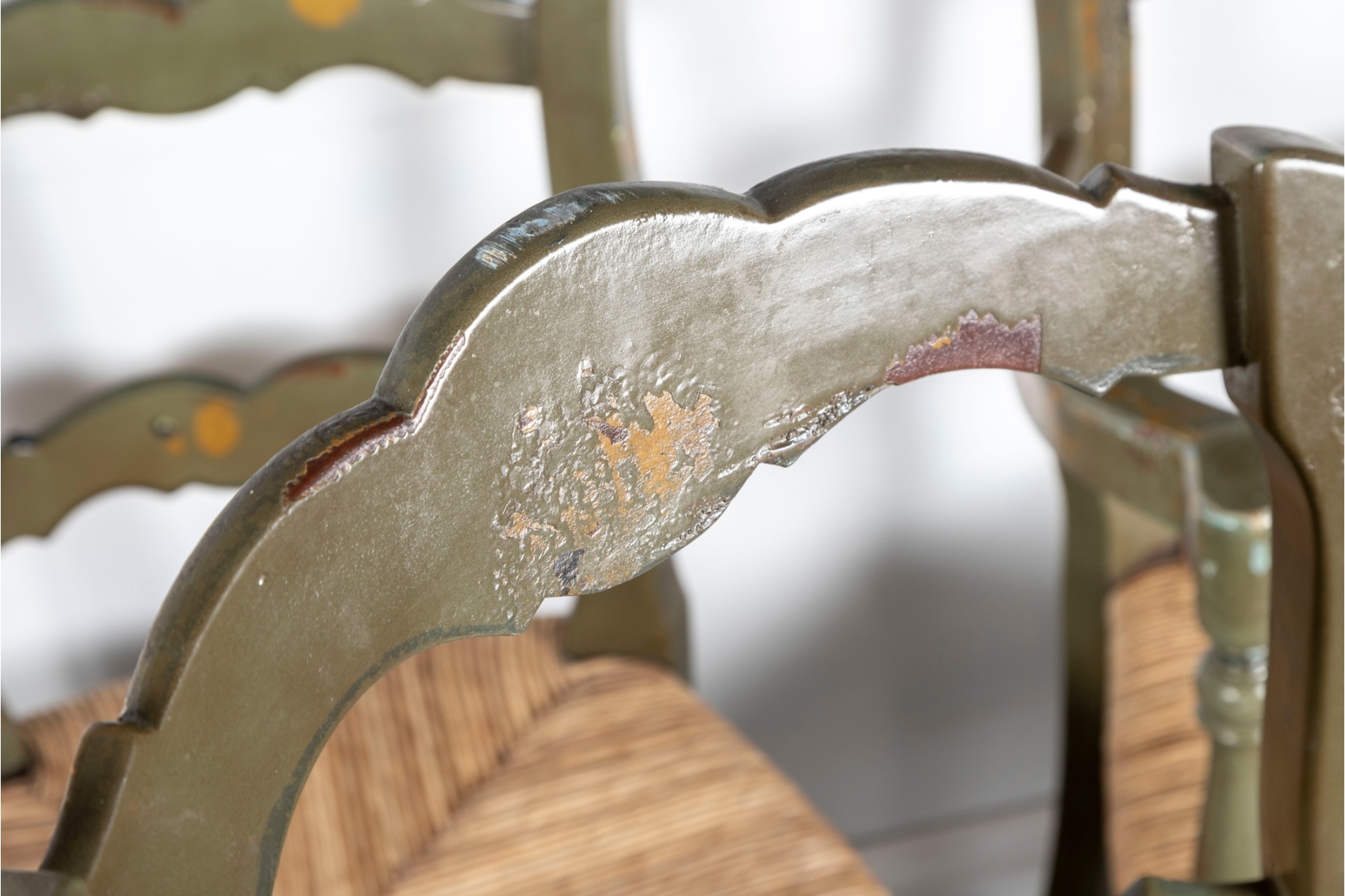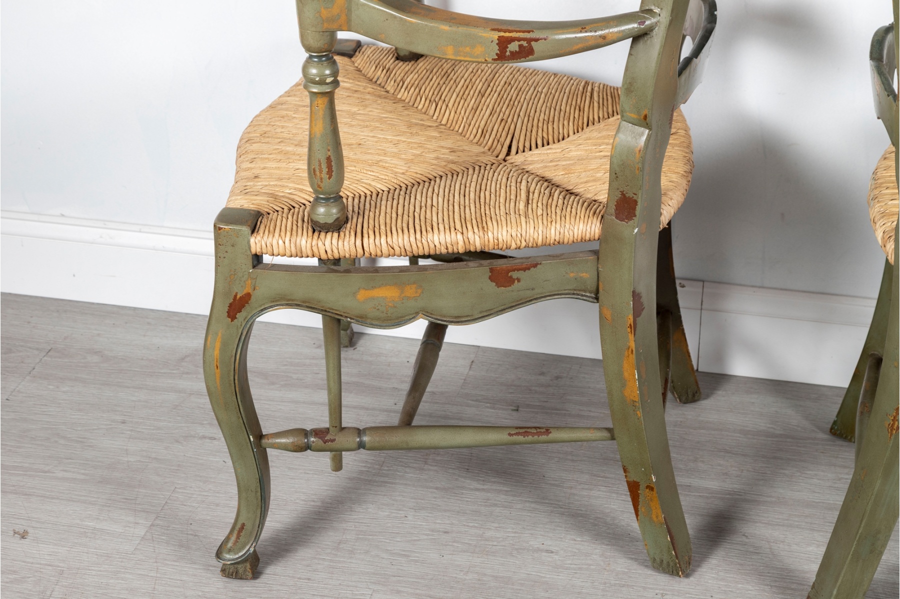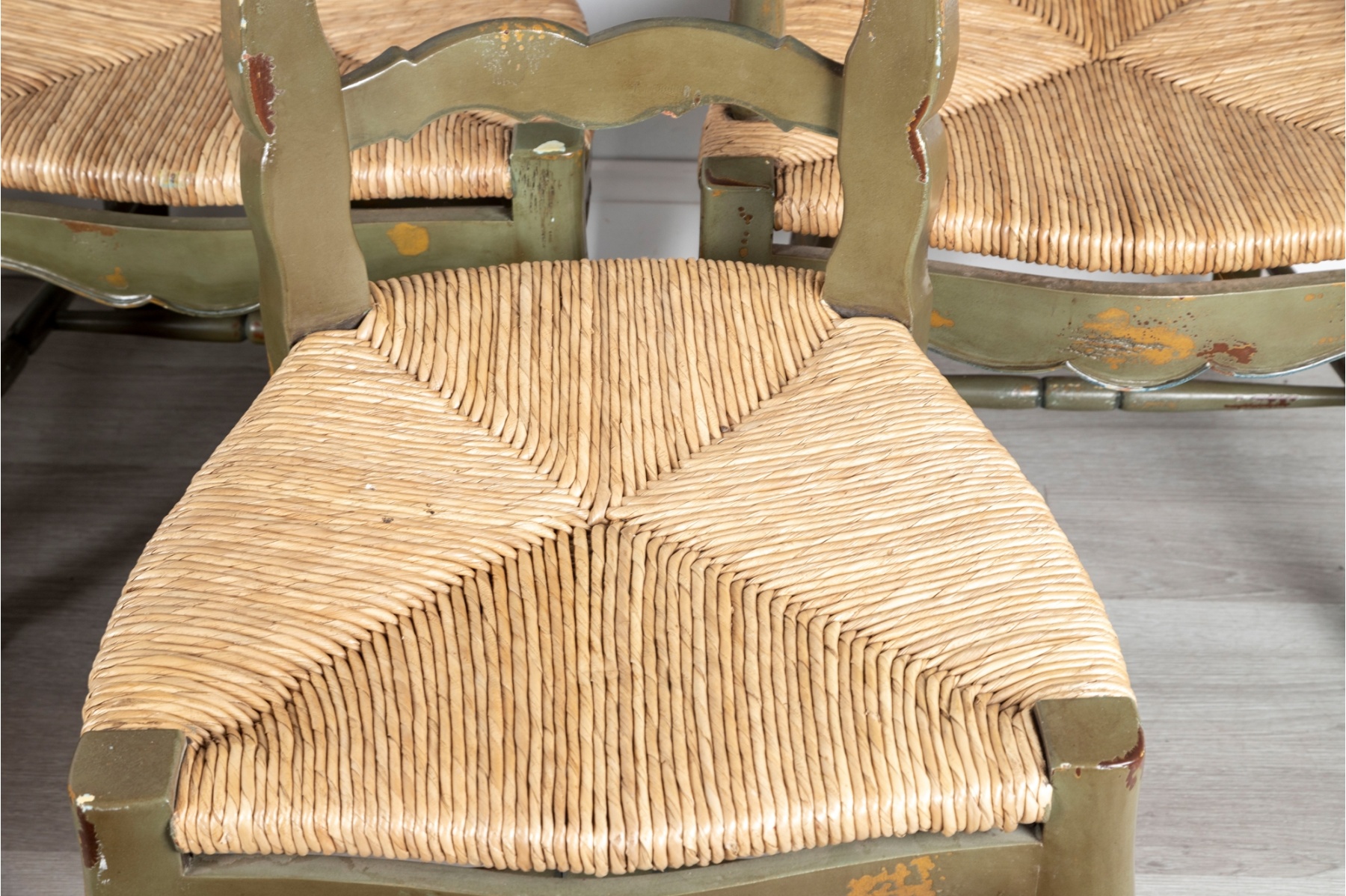 Set of four French Provincial ladder-back dining chairs, including two armchairs and two side chairs. Each features a carved wooden frame with a painted finish, curved legs, and woven rush seats in a classic provincial style. Produced by Furniture Classics Limited, Virginia.