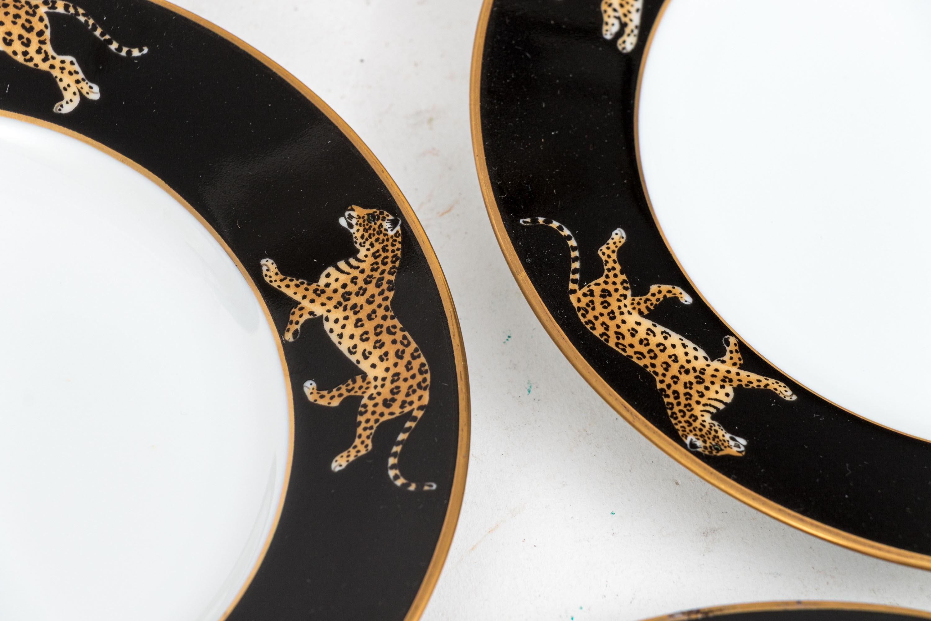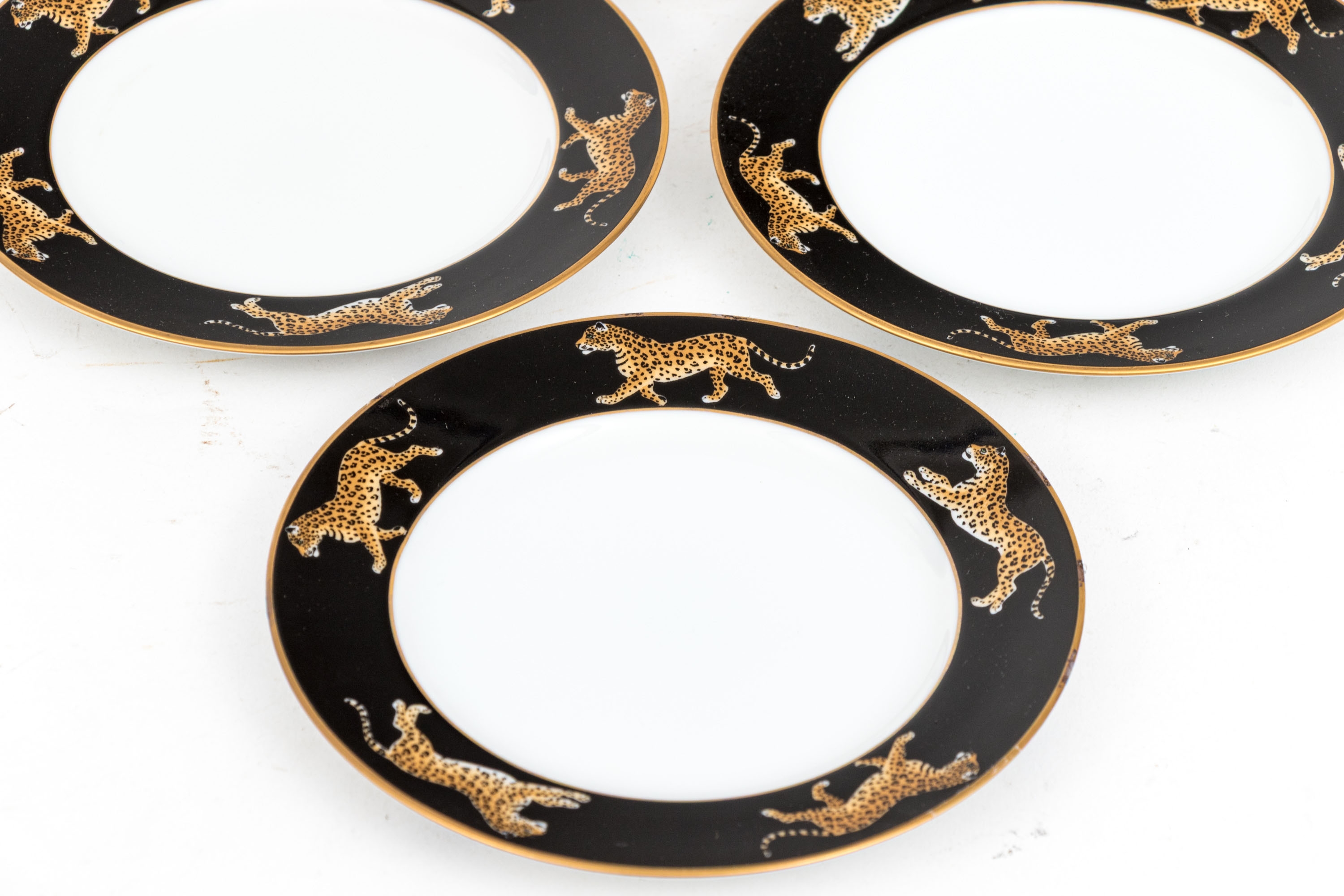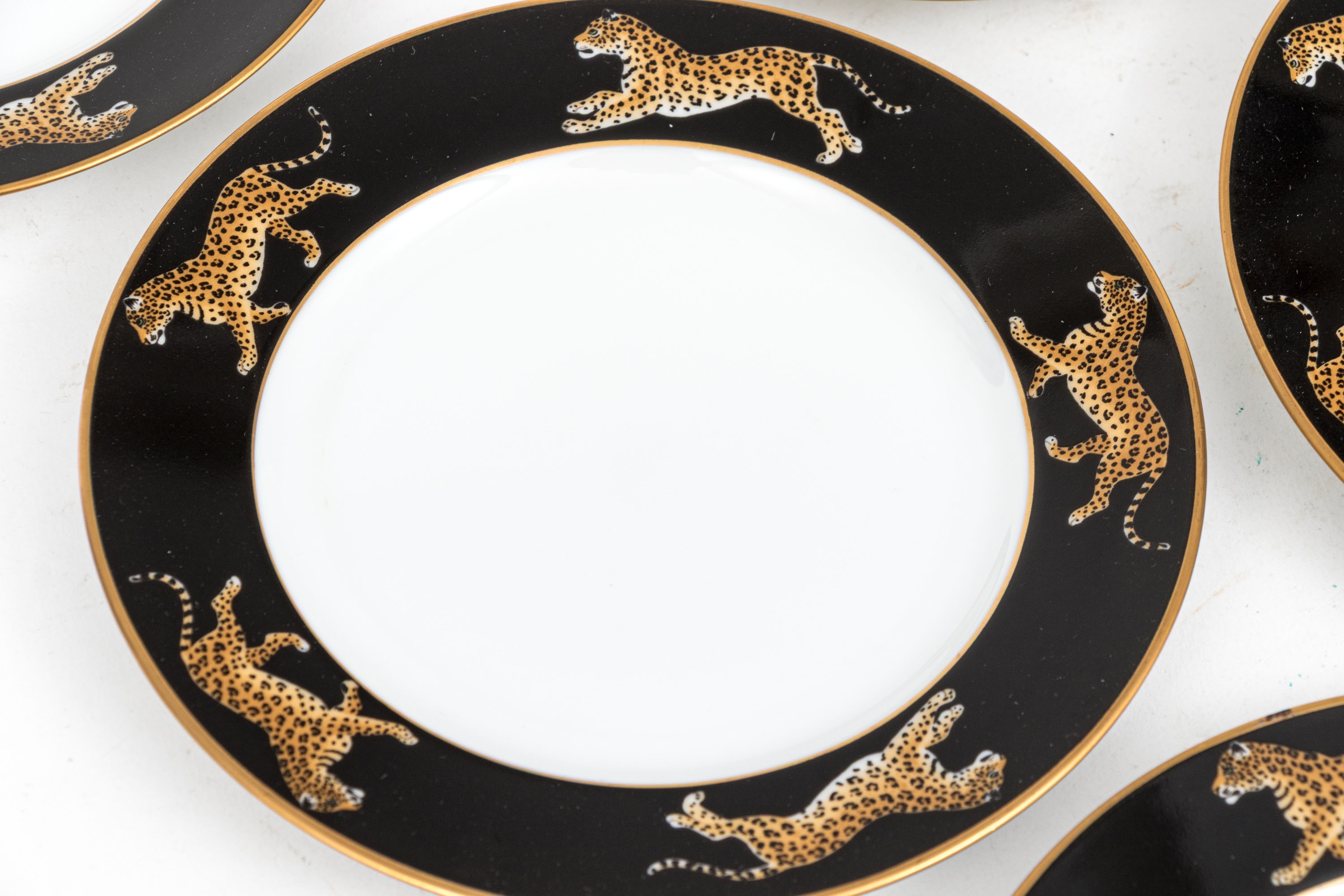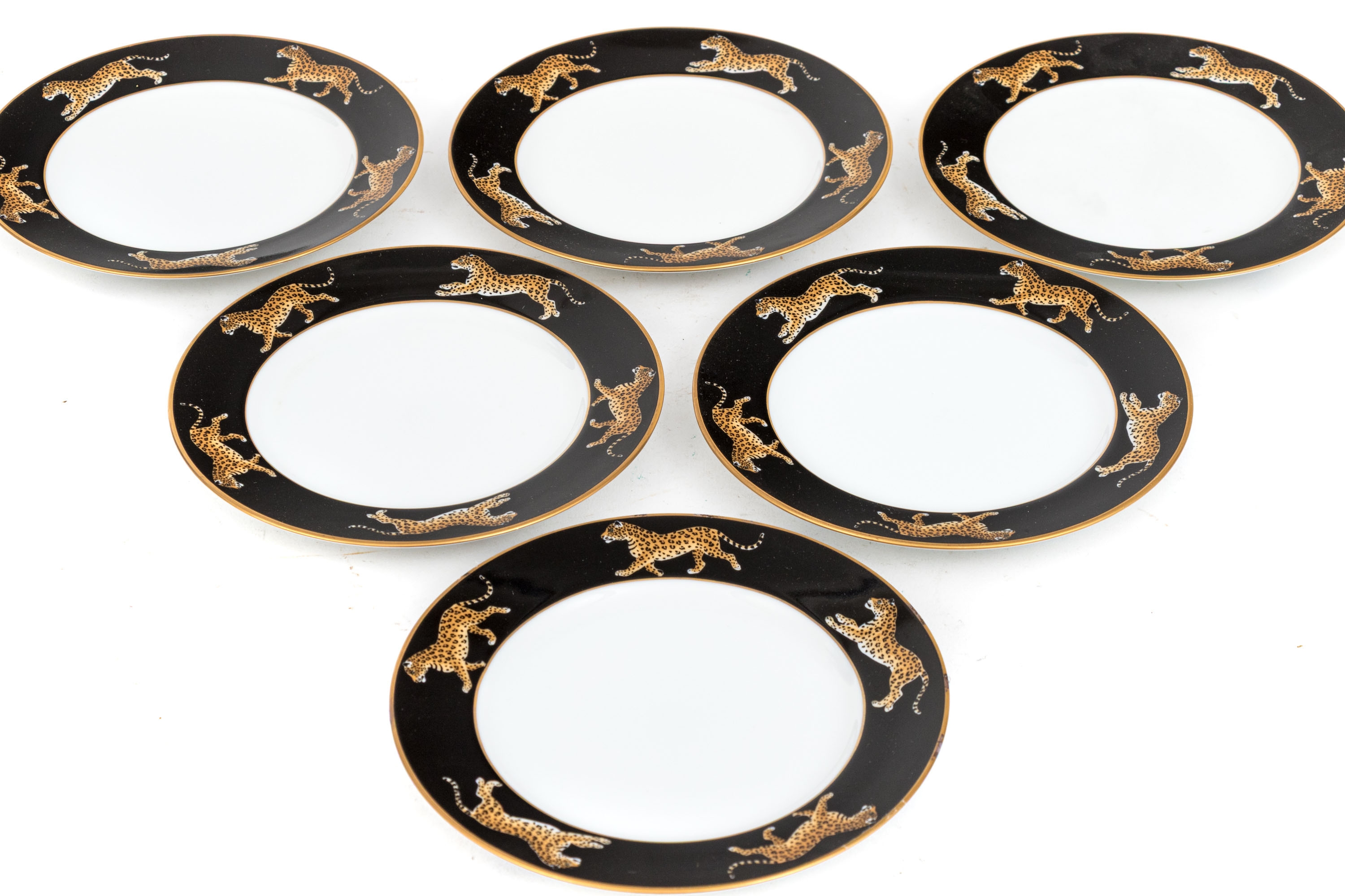 A fabulously decorated set of six Lynn Chase "Jaguar Jungle" ceramic bread and butter plates with naturalistic jaguars around the trim against stylish black borders. Marked underfoot.
