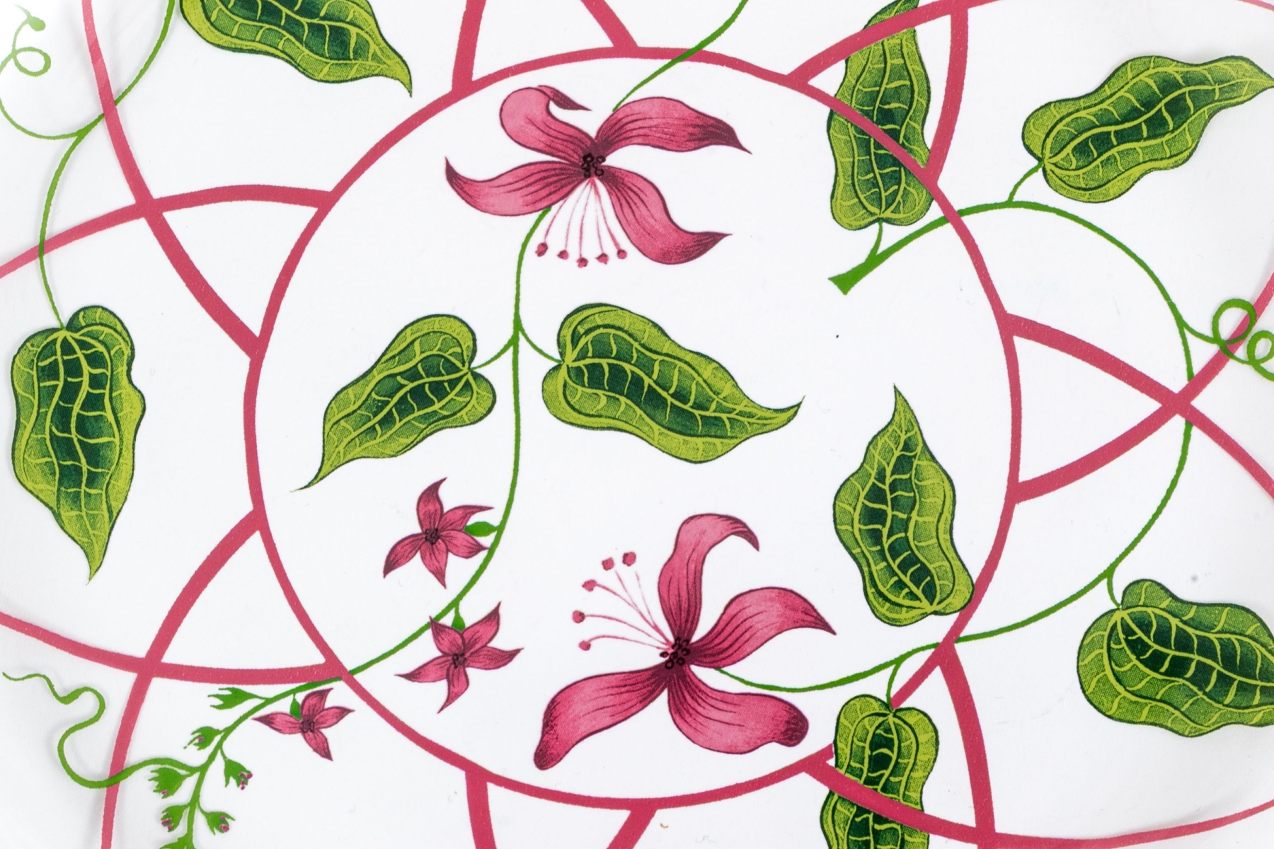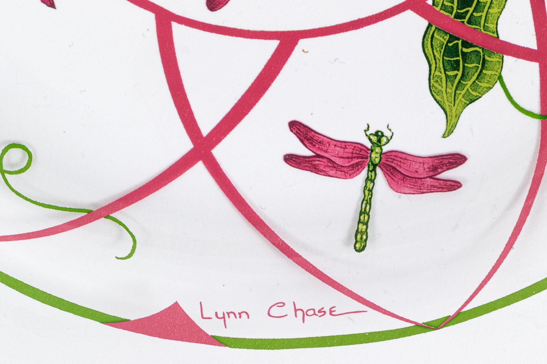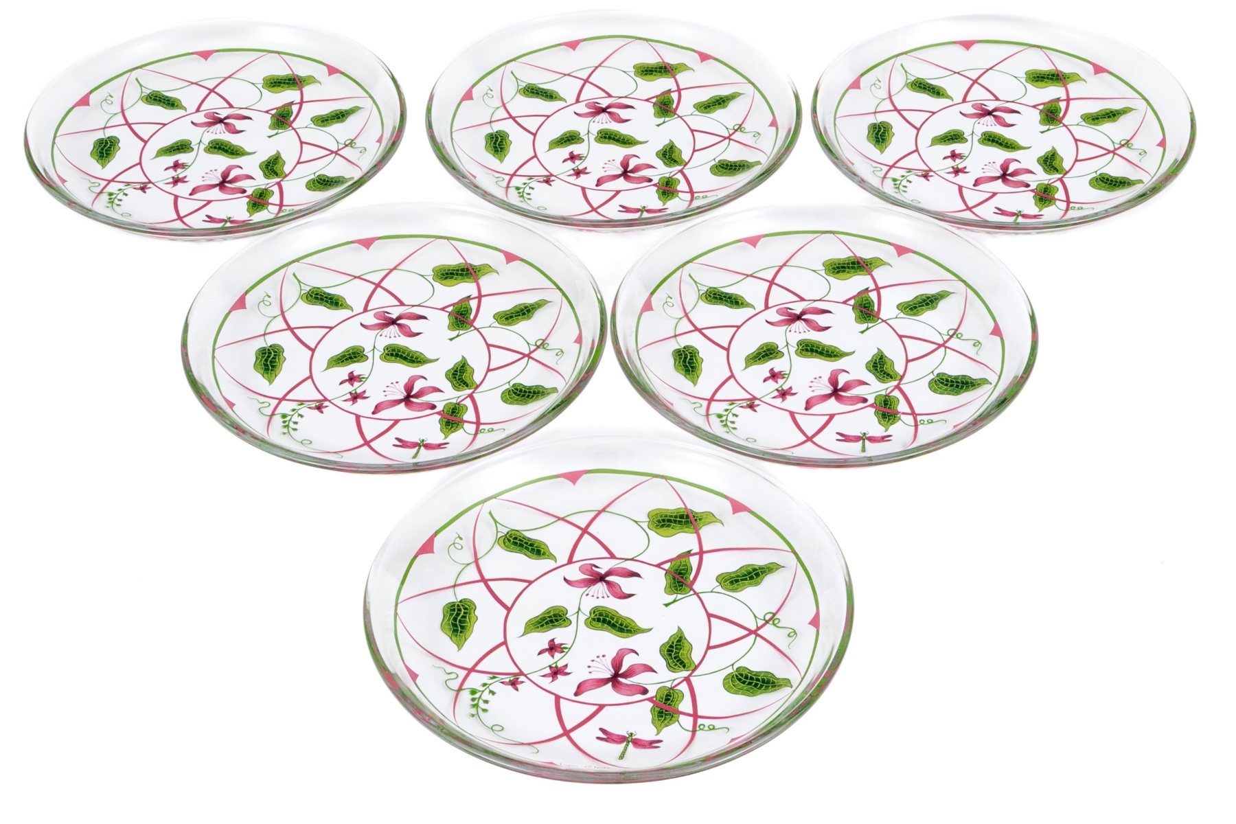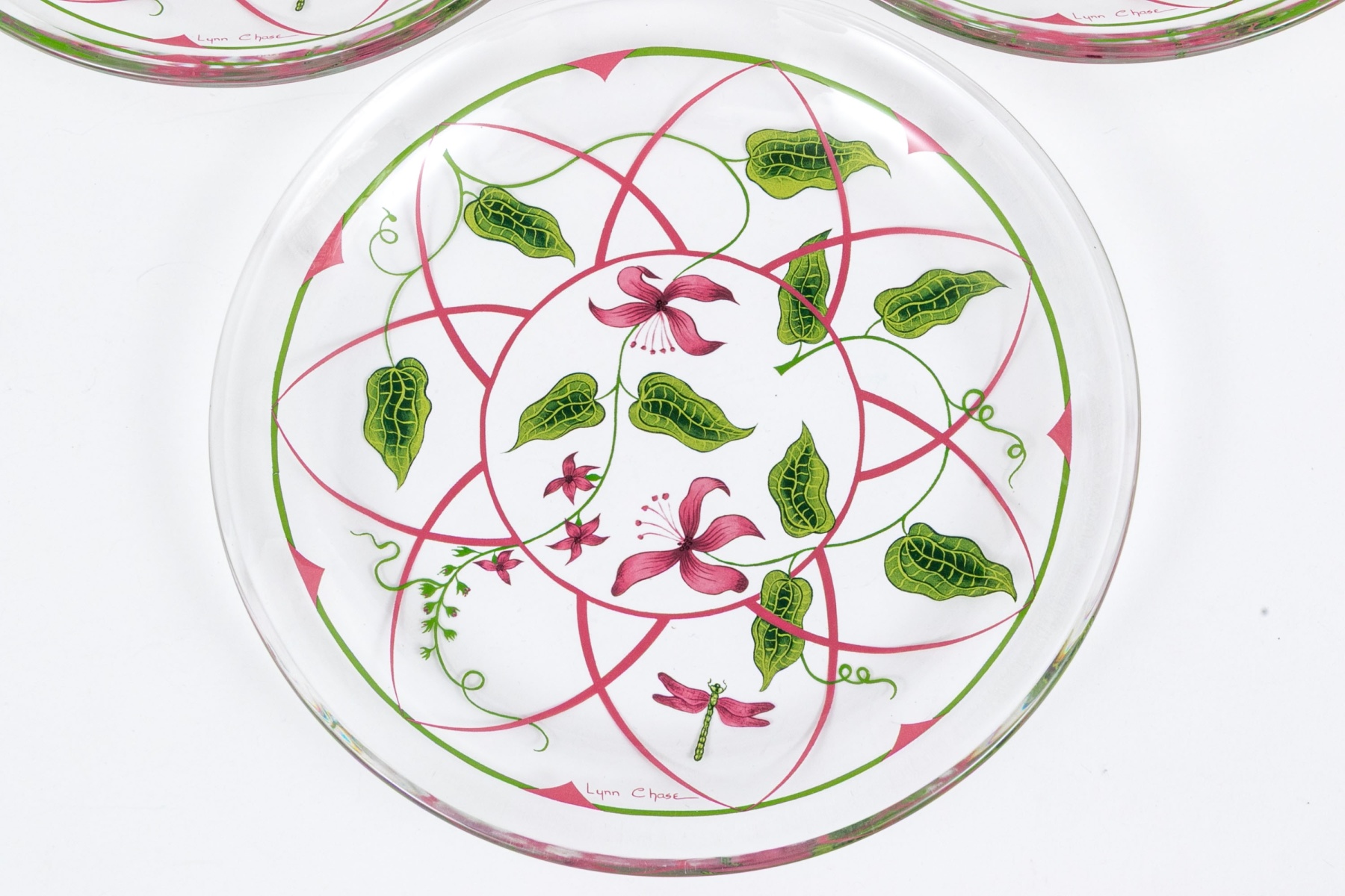 A chic set of six Lynn Chase "Paradise Pink" shallow glass bowls with low upturned trims, decorated with wonderful pink flowers and green leaves on thin green vines overlaying a large pink abstract flower motif at the center. Marked near the rims.