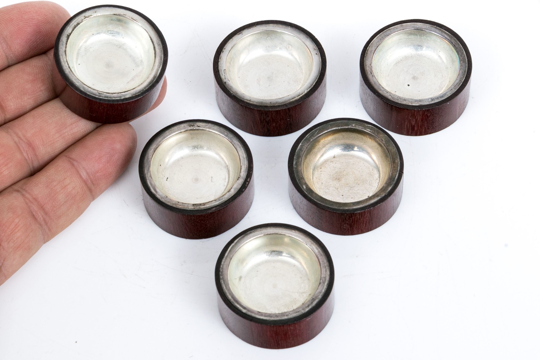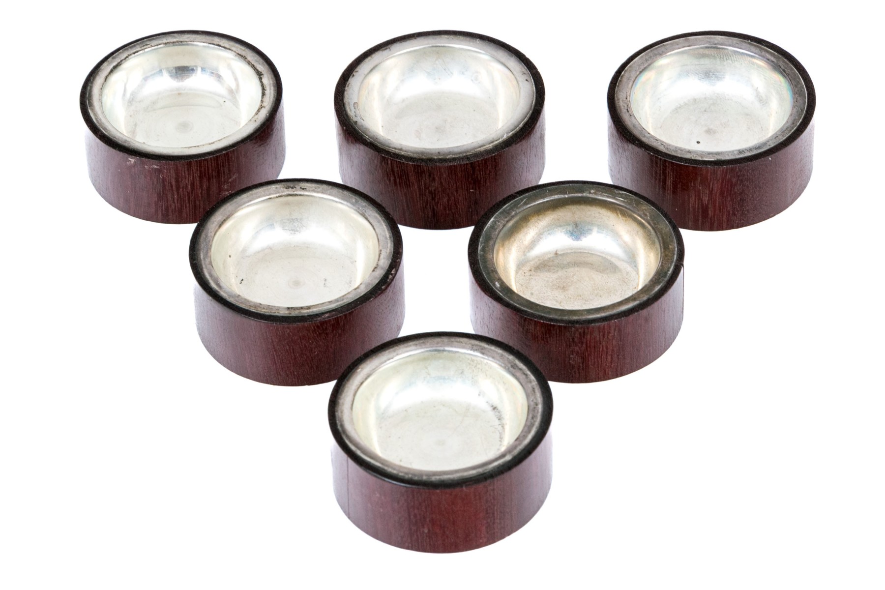 Set of six sterling silver and wood sold cellars. Sterling silver dish with dark wood exterior.
