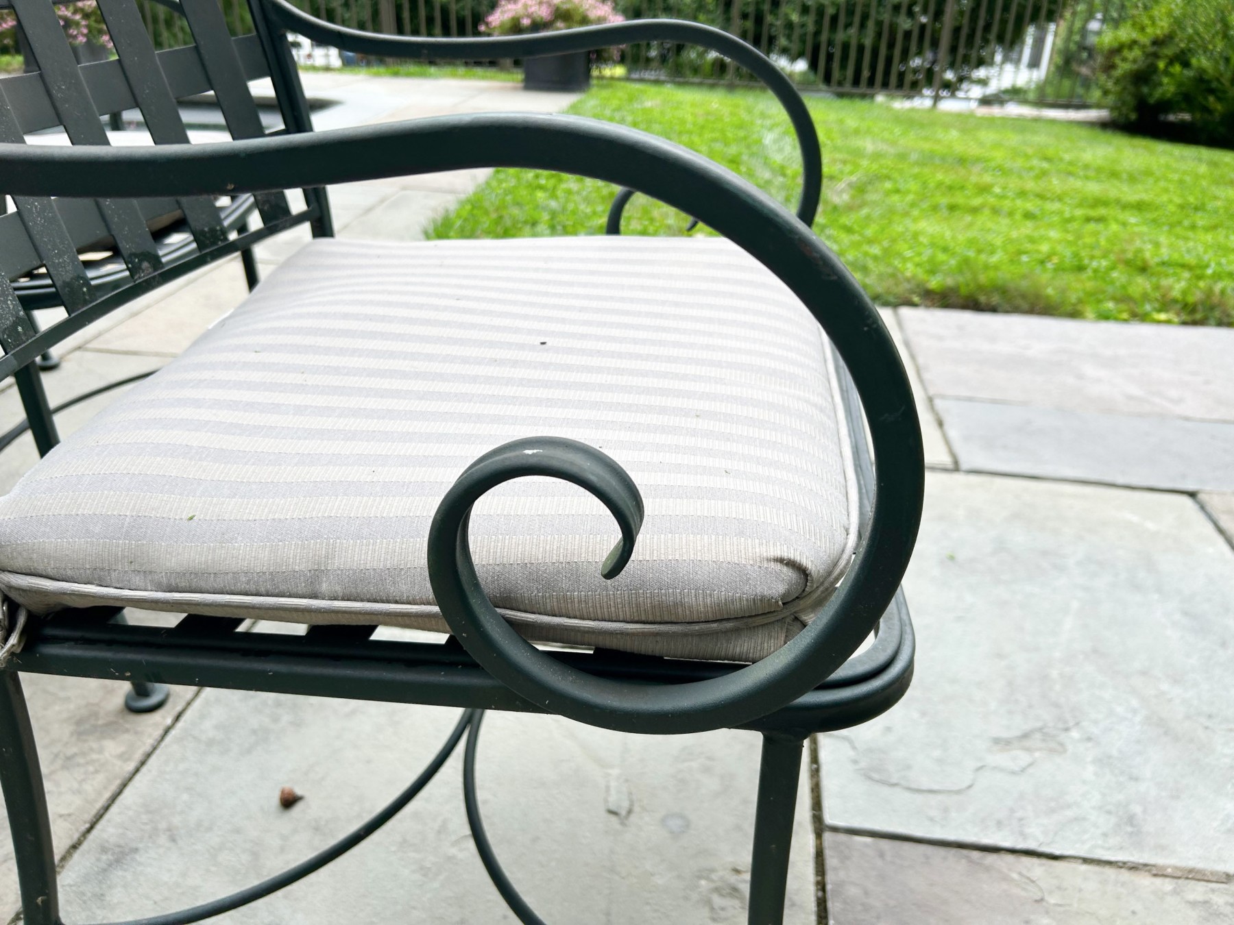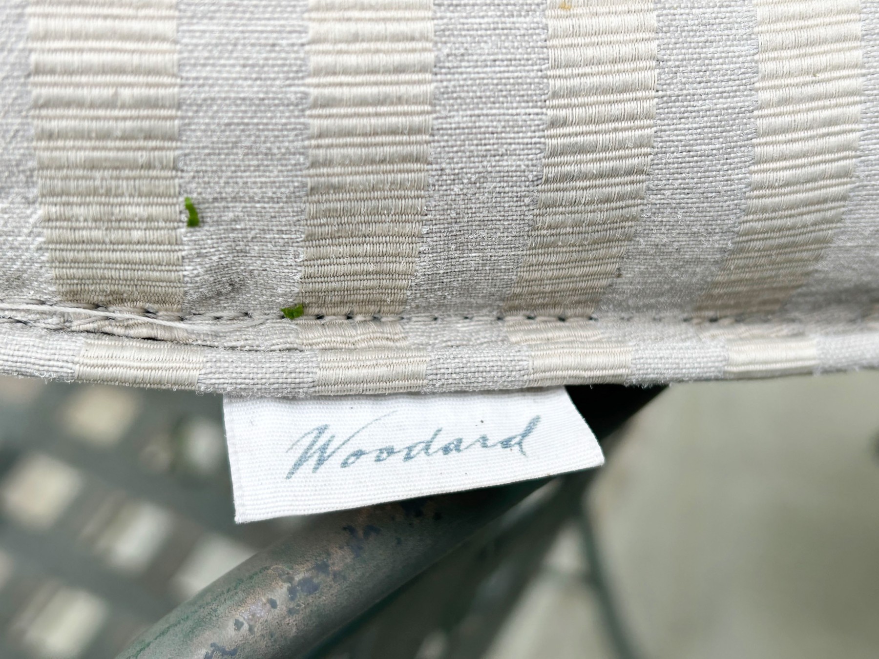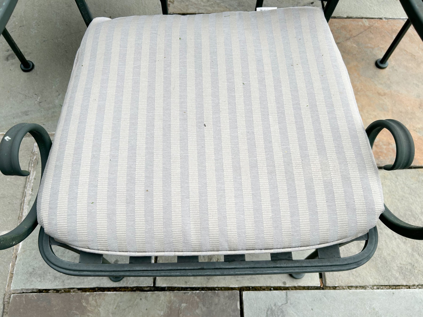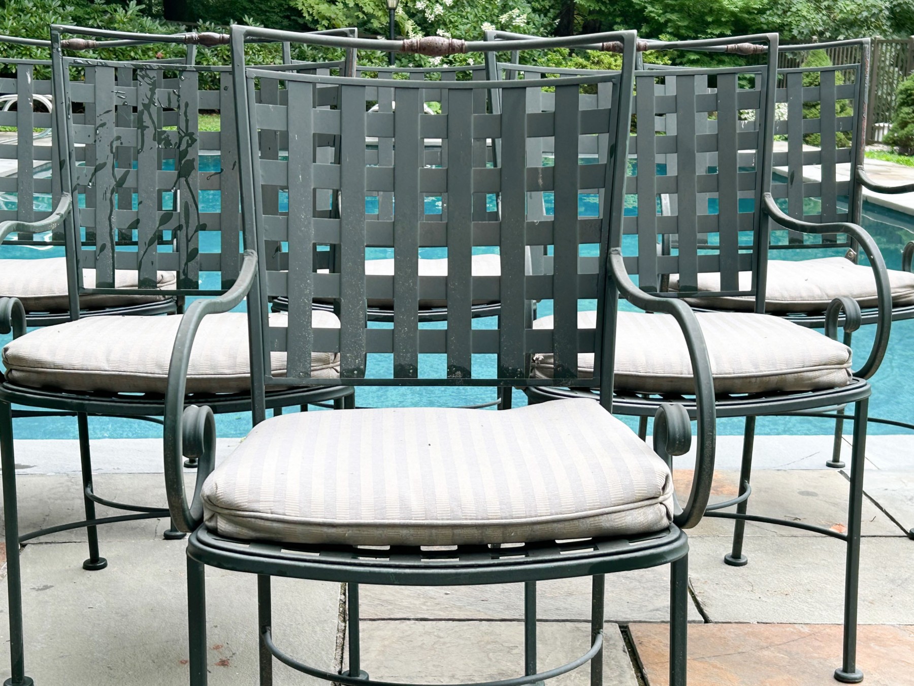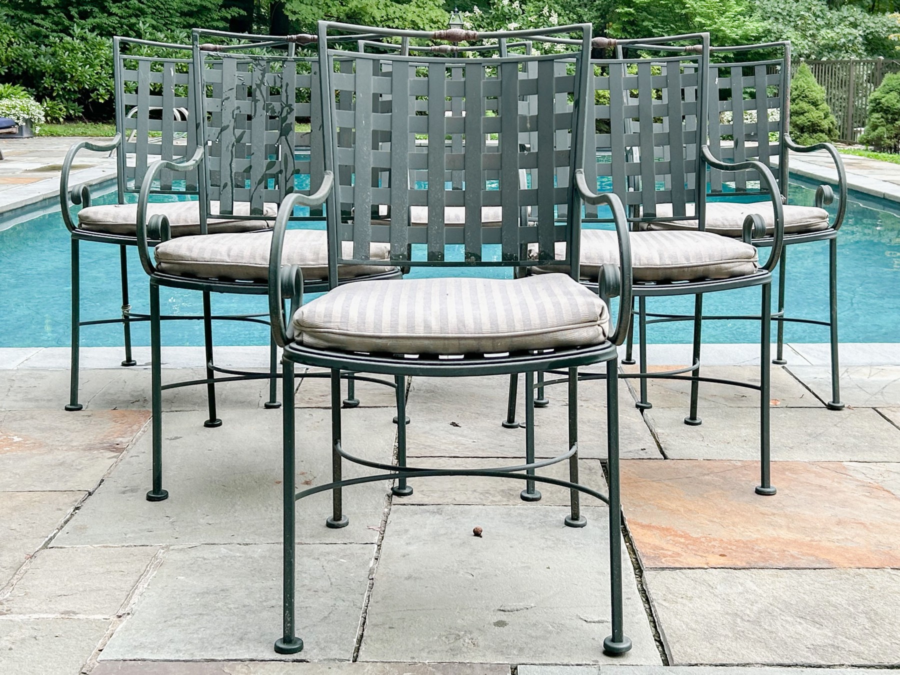A fantastic vintage collection of six Woodard "Sheffield" indoor-outdoor dining armchairs with wrought iron frames detailed by dainty, simple crests at the centers. The arms are elegantly formed, curving into dramatic scrolled supports. The seat follows suit with lovely rounded corners, softening the look. Raised on dowel legs around a dramatically curved X-stretcher. Topped with neutral stripped Woodard cushions.