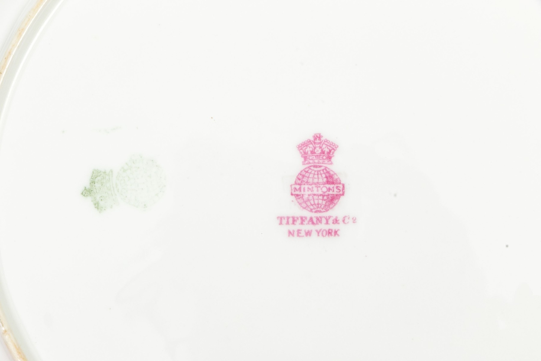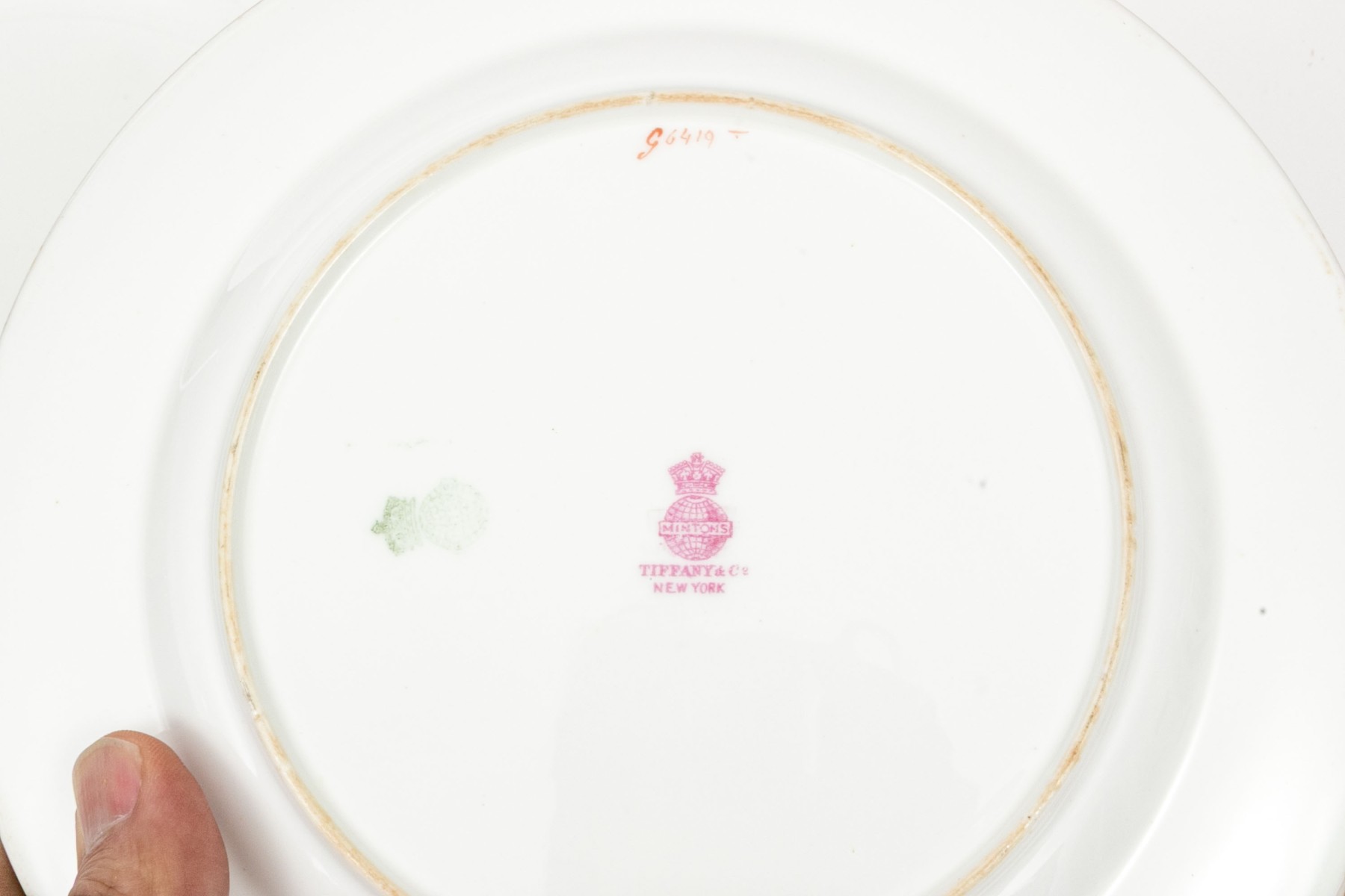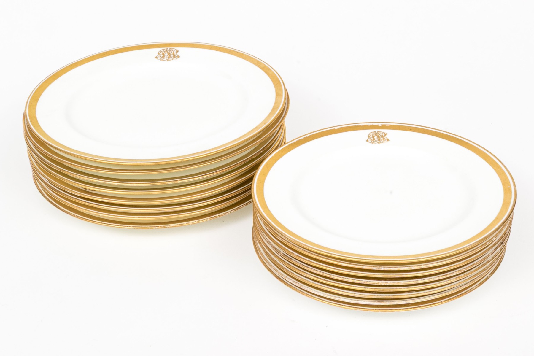 A fine set of sixteen Mintons for Tiffany & Co. china plates comprised of eight 10 1/8" diameter plates and eight 9" diameter plates, all with elegantly gilt rims and decorative monograms. Marked underfoot. Beautiful ornate high relief monogram.