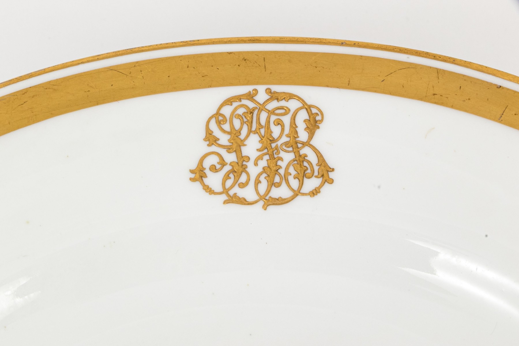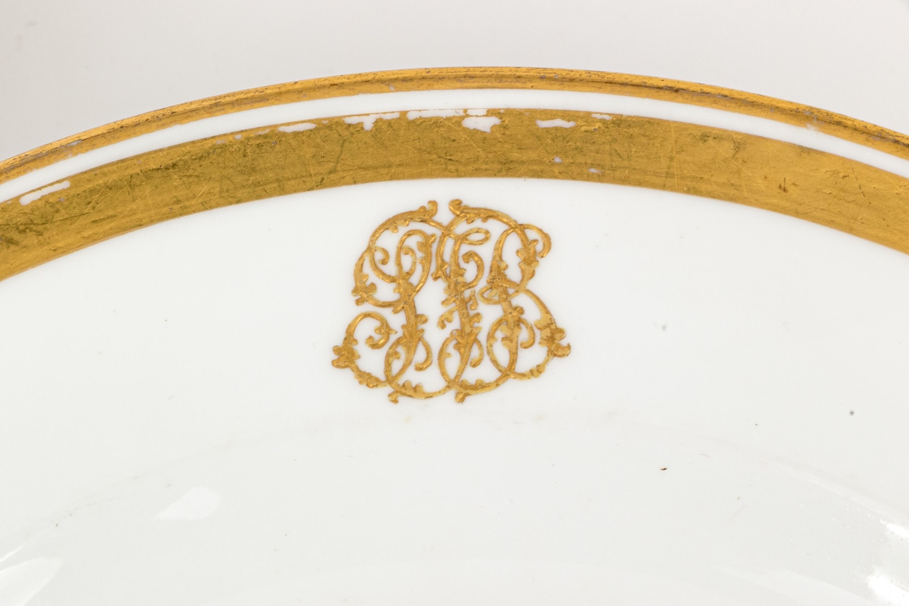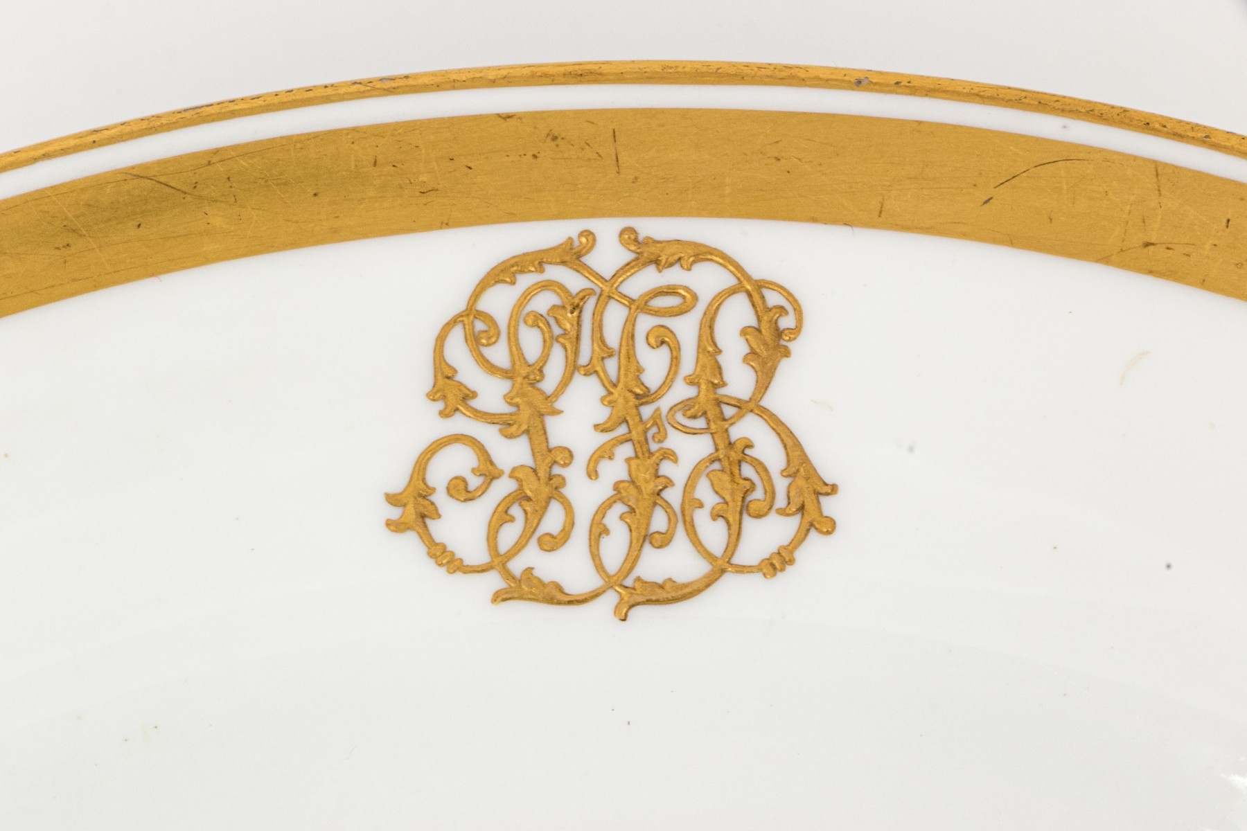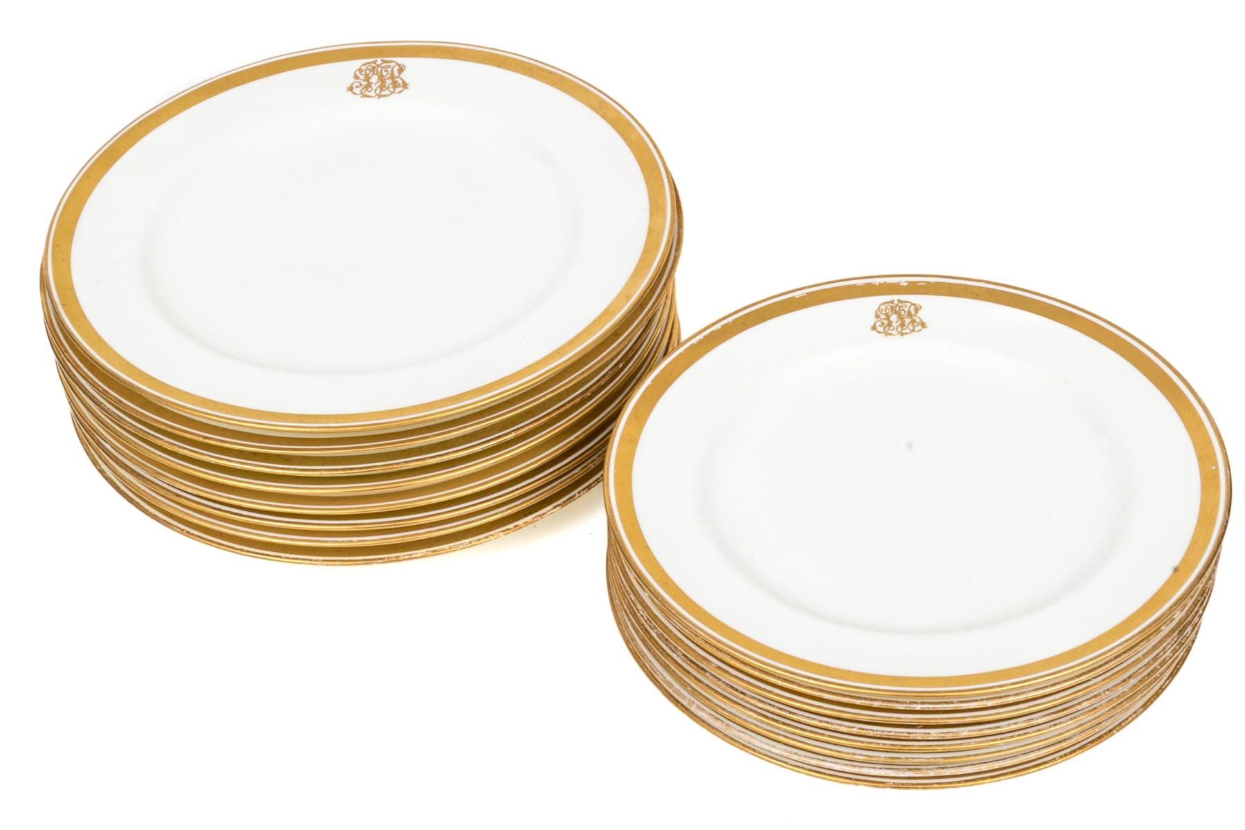 A fine set of sixteen Mintons for Tiffany & Co. china plates comprised of eight 10 1/8" diameter plates and eight 9" diameter plates, all with elegantly gilt rims and decorative monograms. Marked underfoot. Beautiful ornate high relief monogram.