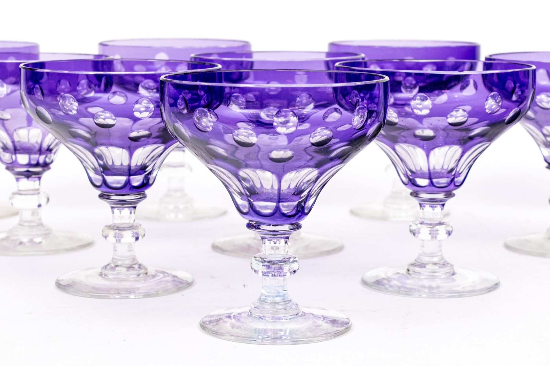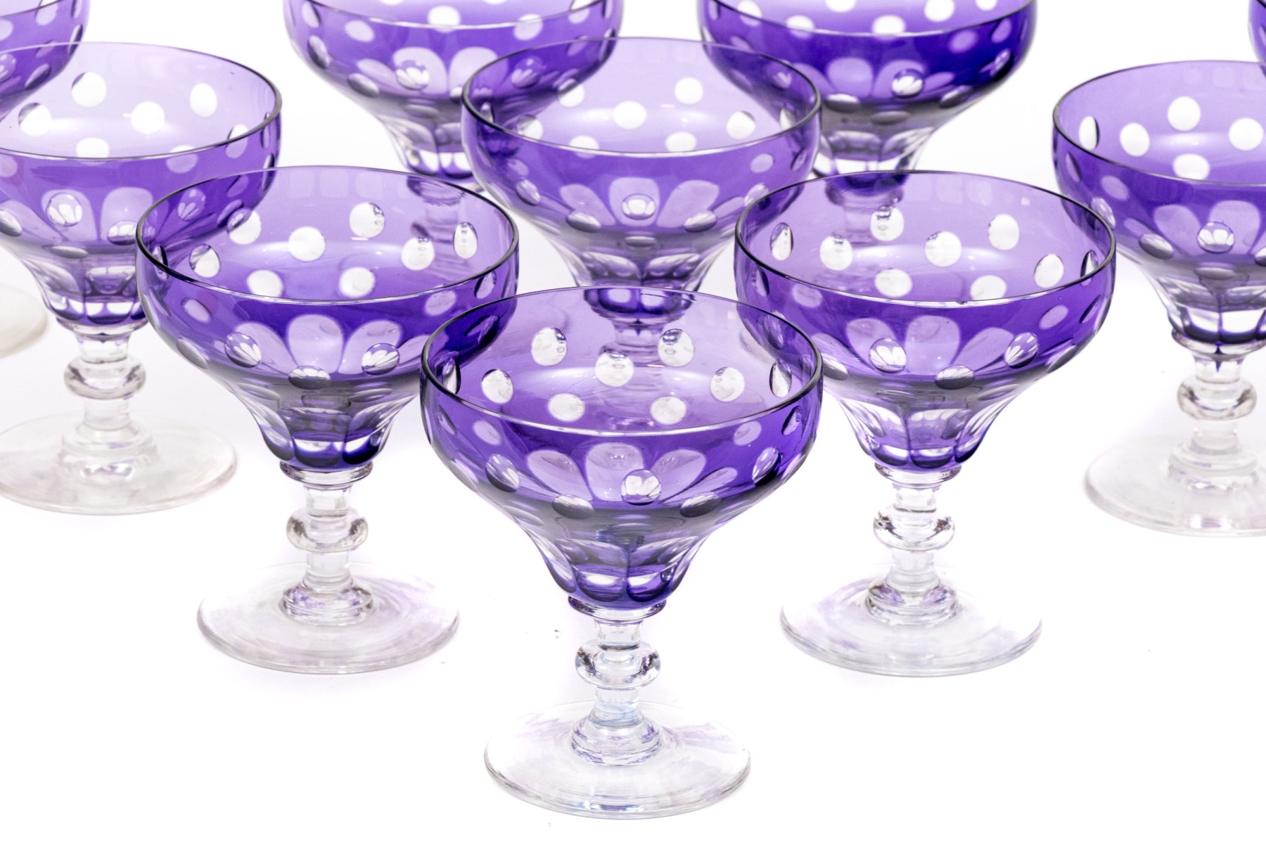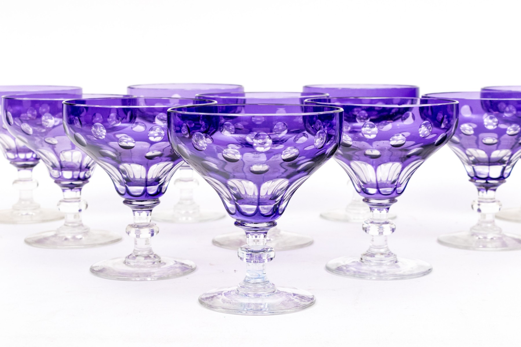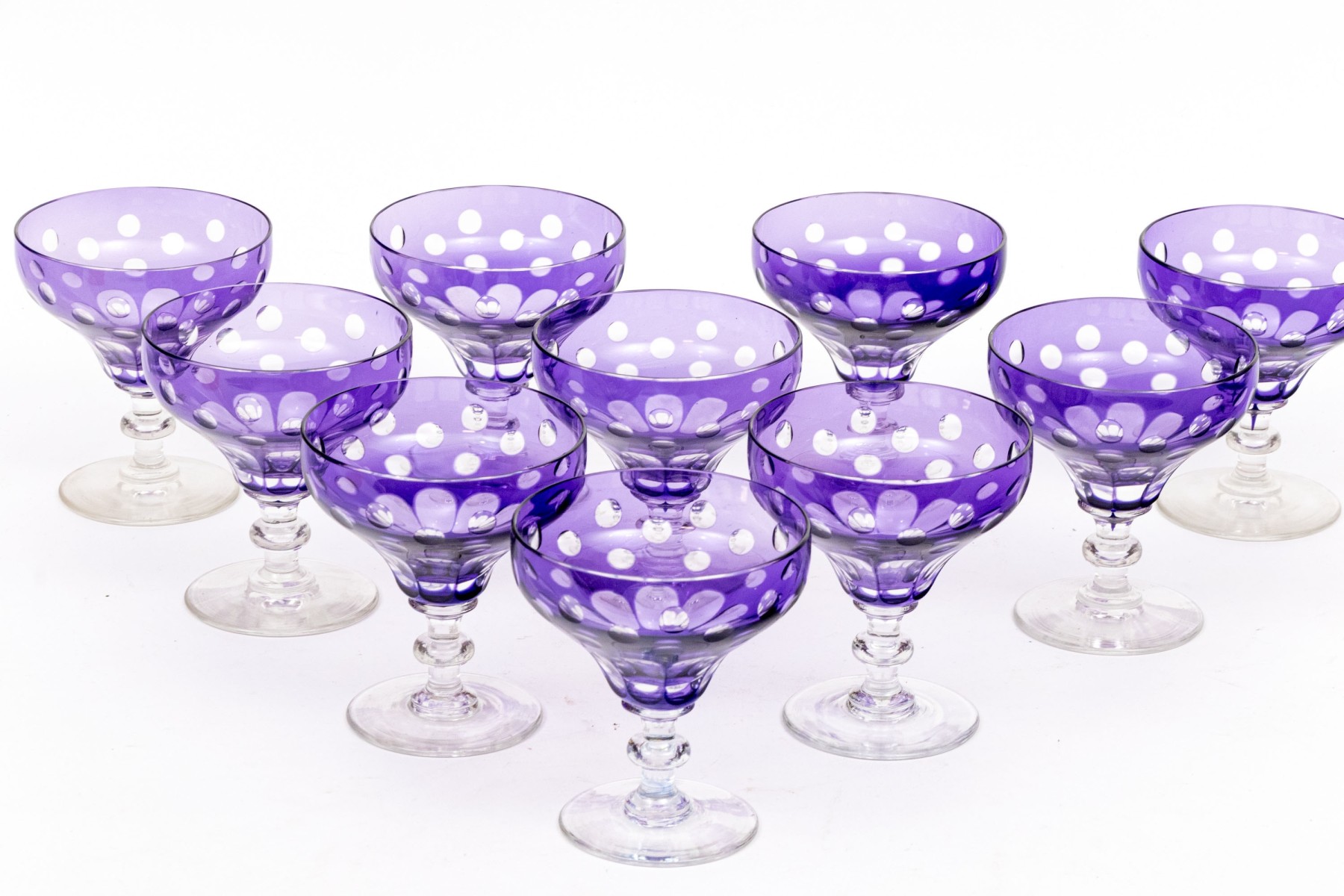 A fabulous set of ten Bohemian style cocktail/champagne coupes with shapely amethyst bowls cut to clear with polka dot coin spots and rounded fluting. Bowls are raised over elegant cylindrical stems with bun knops terminating with circular feet.