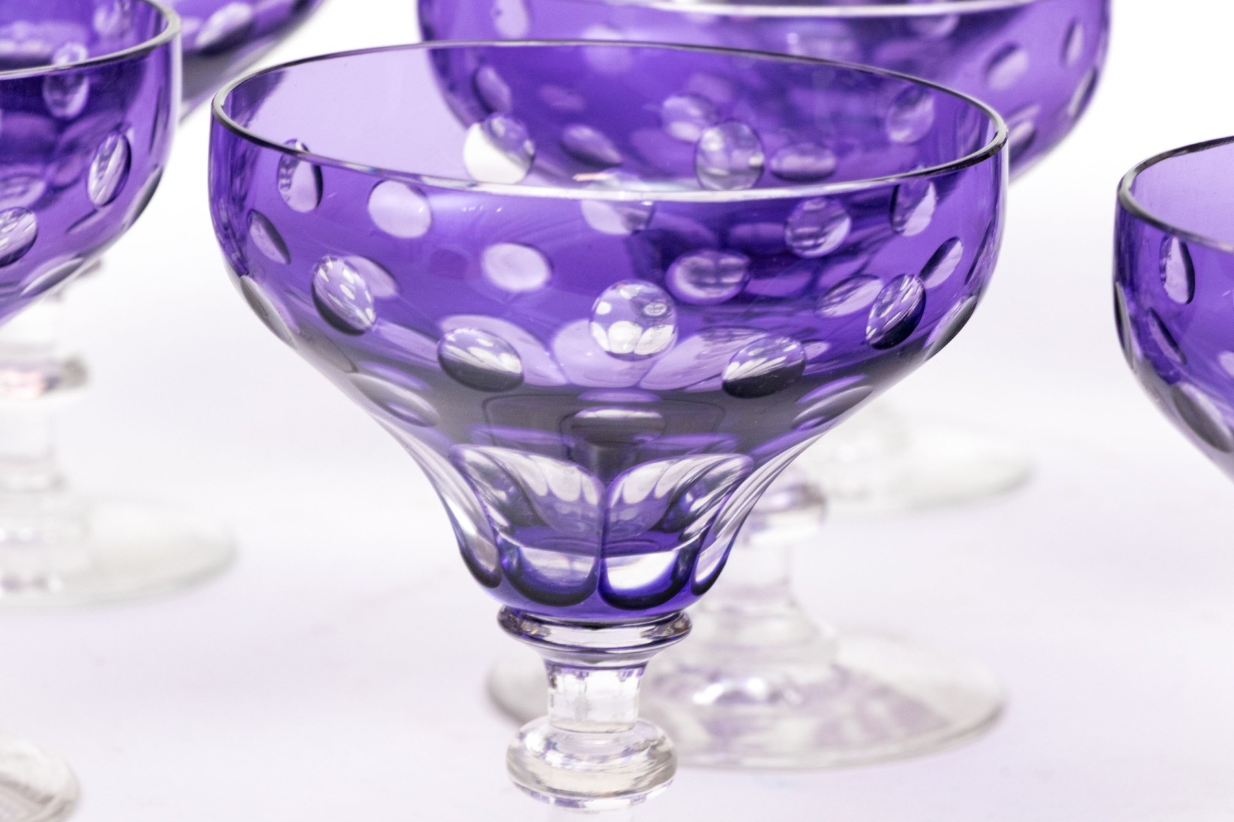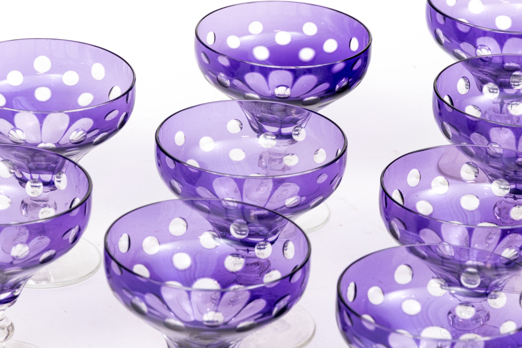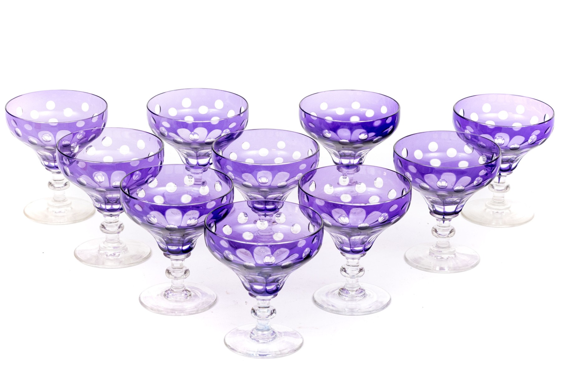 A fabulous set of ten Bohemian style cocktail/champagne coupes with shapely amethyst bowls cut to clear with polka dot coin spots and rounded fluting. Bowls are raised over elegant cylindrical stems with bun knops terminating with circular feet.