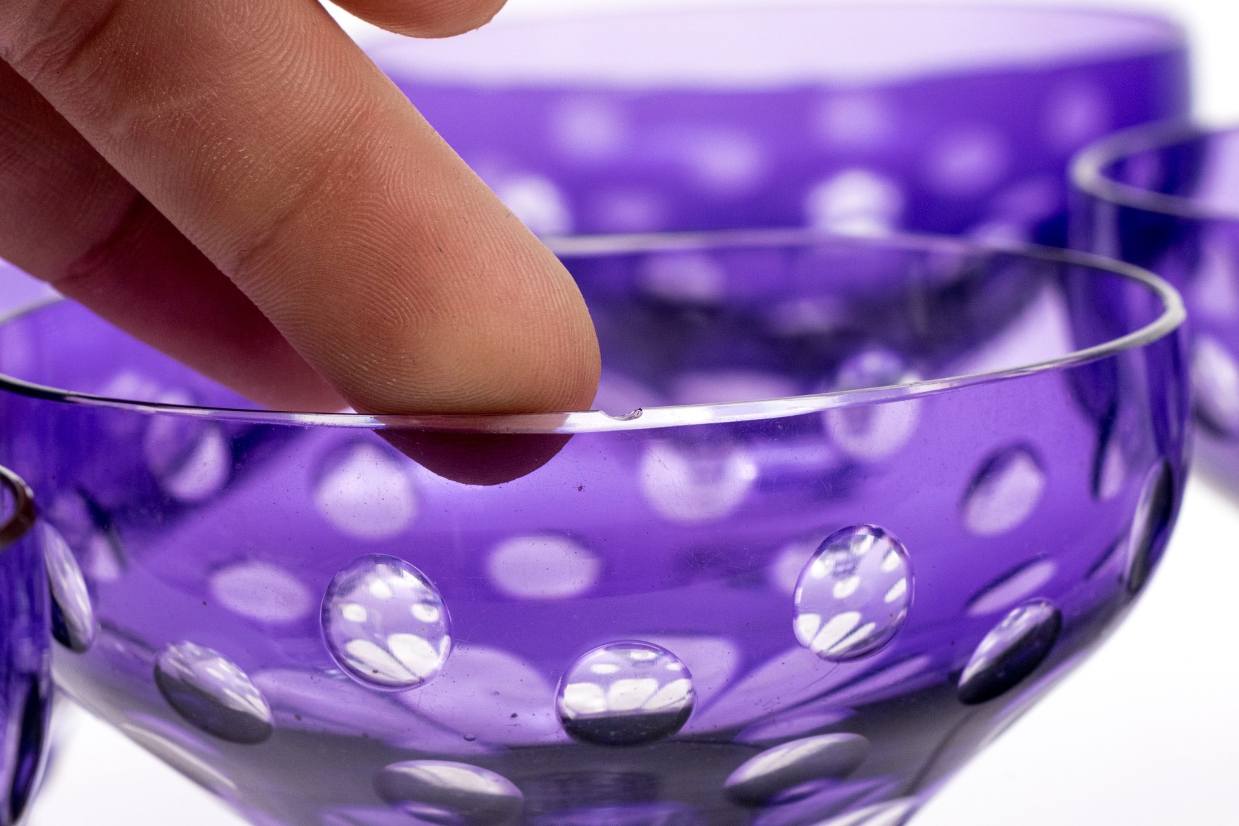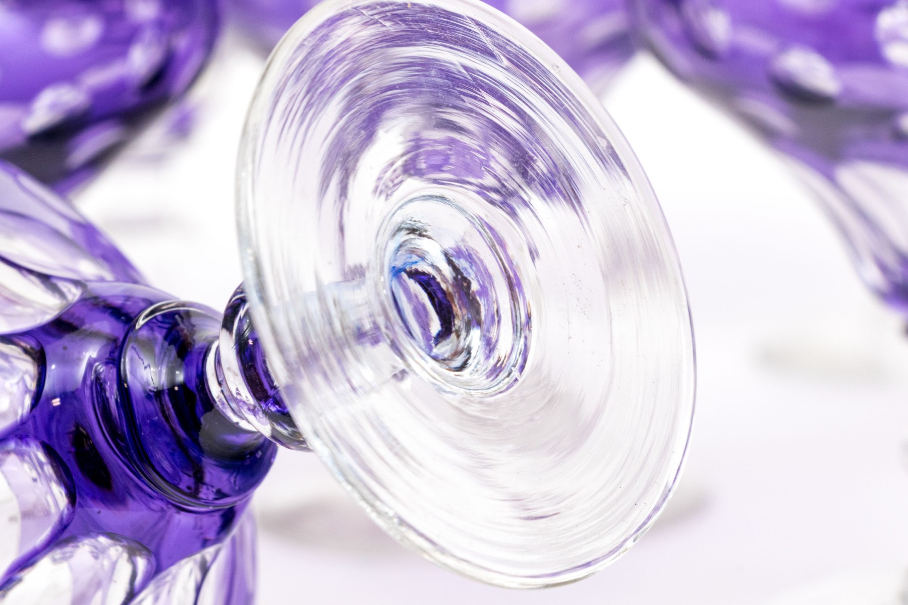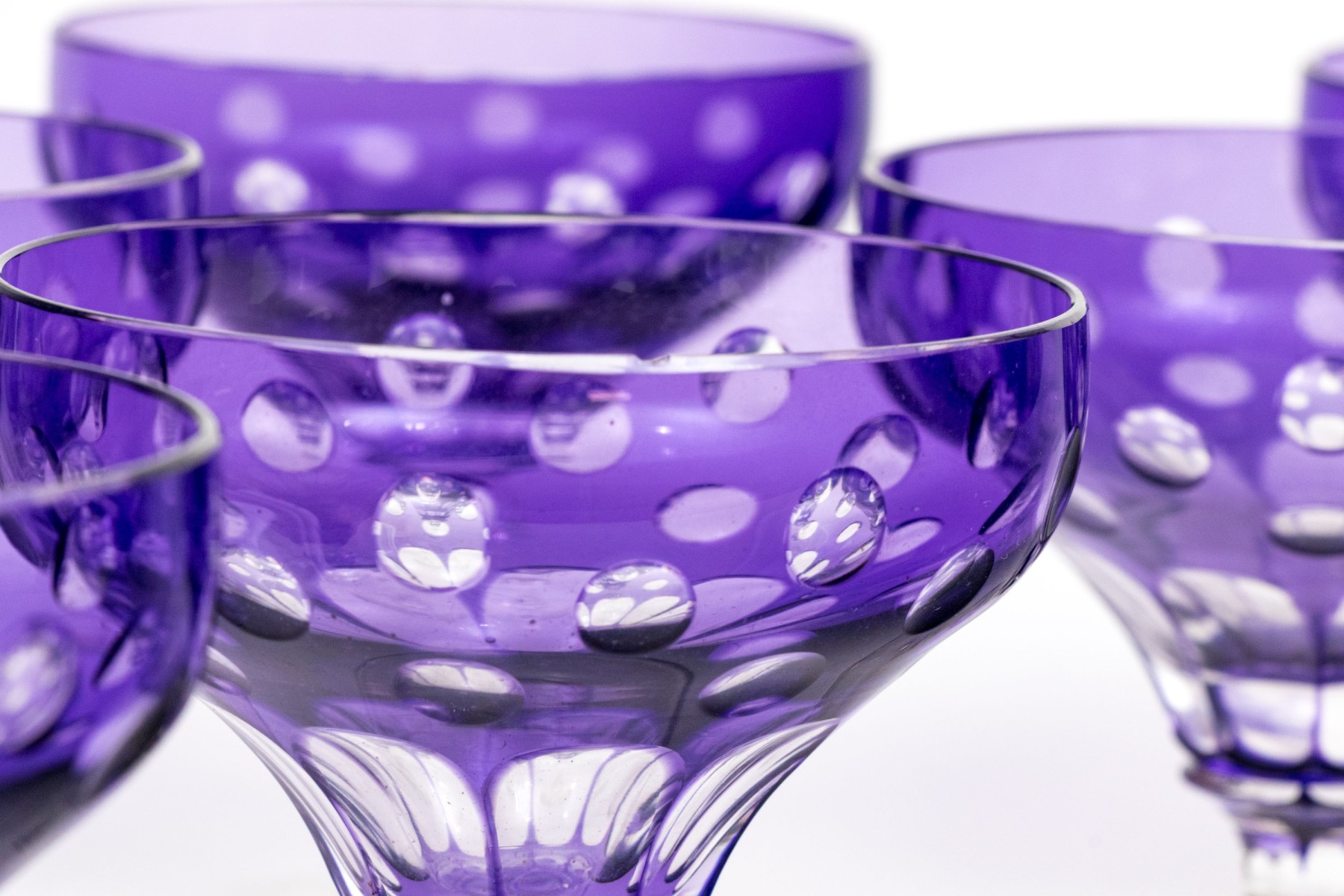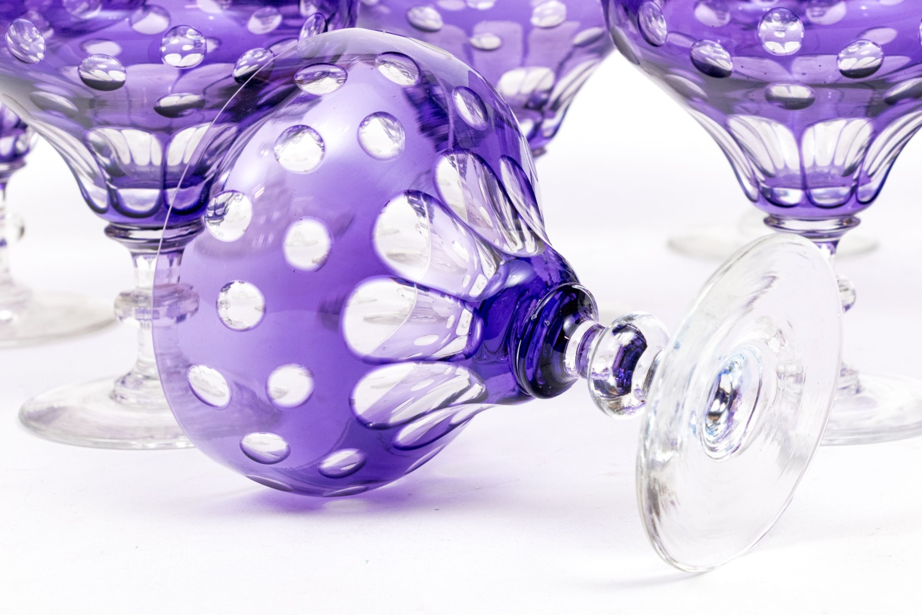 A fabulous set of ten Bohemian style cocktail/champagne coupes with shapely amethyst bowls cut to clear with polka dot coin spots and rounded fluting. Bowls are raised over elegant cylindrical stems with bun knops terminating with circular feet.